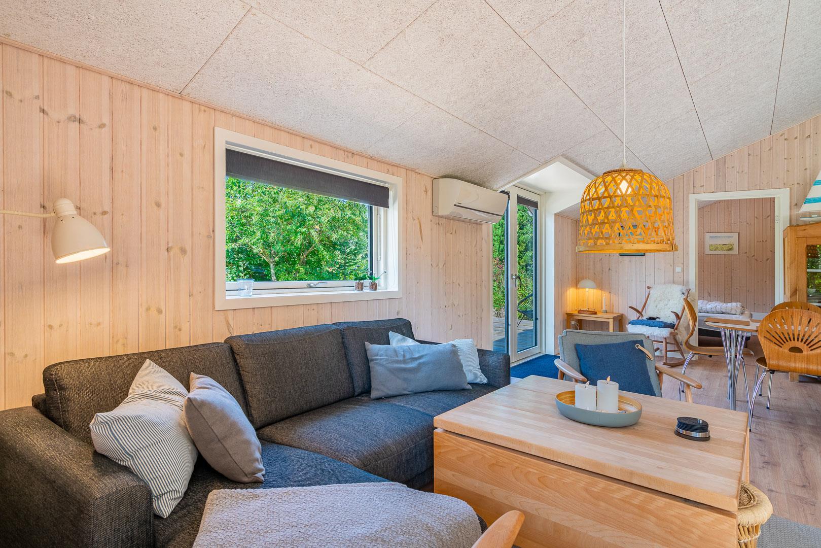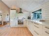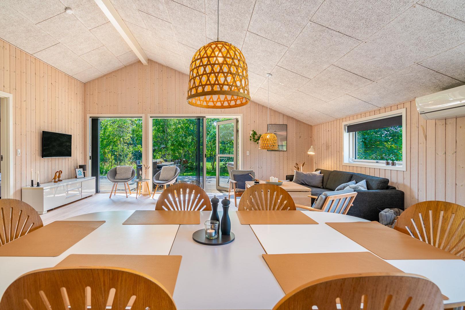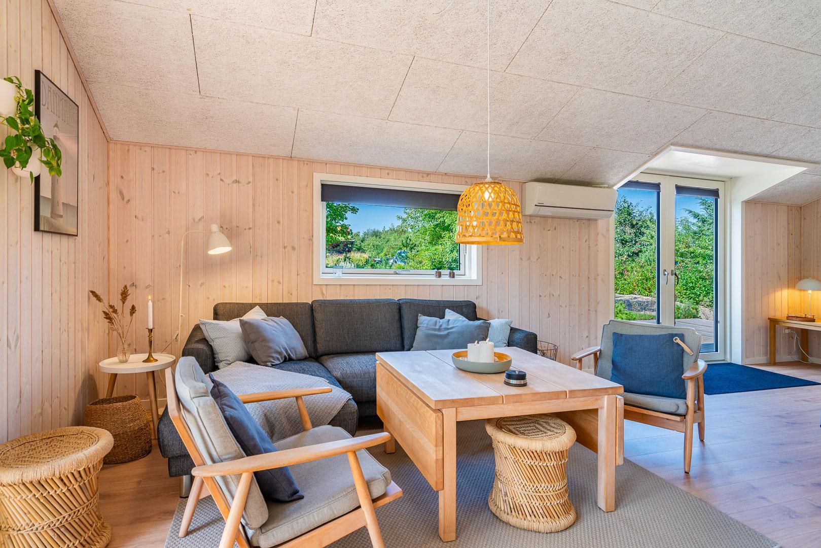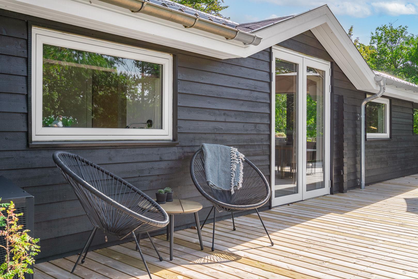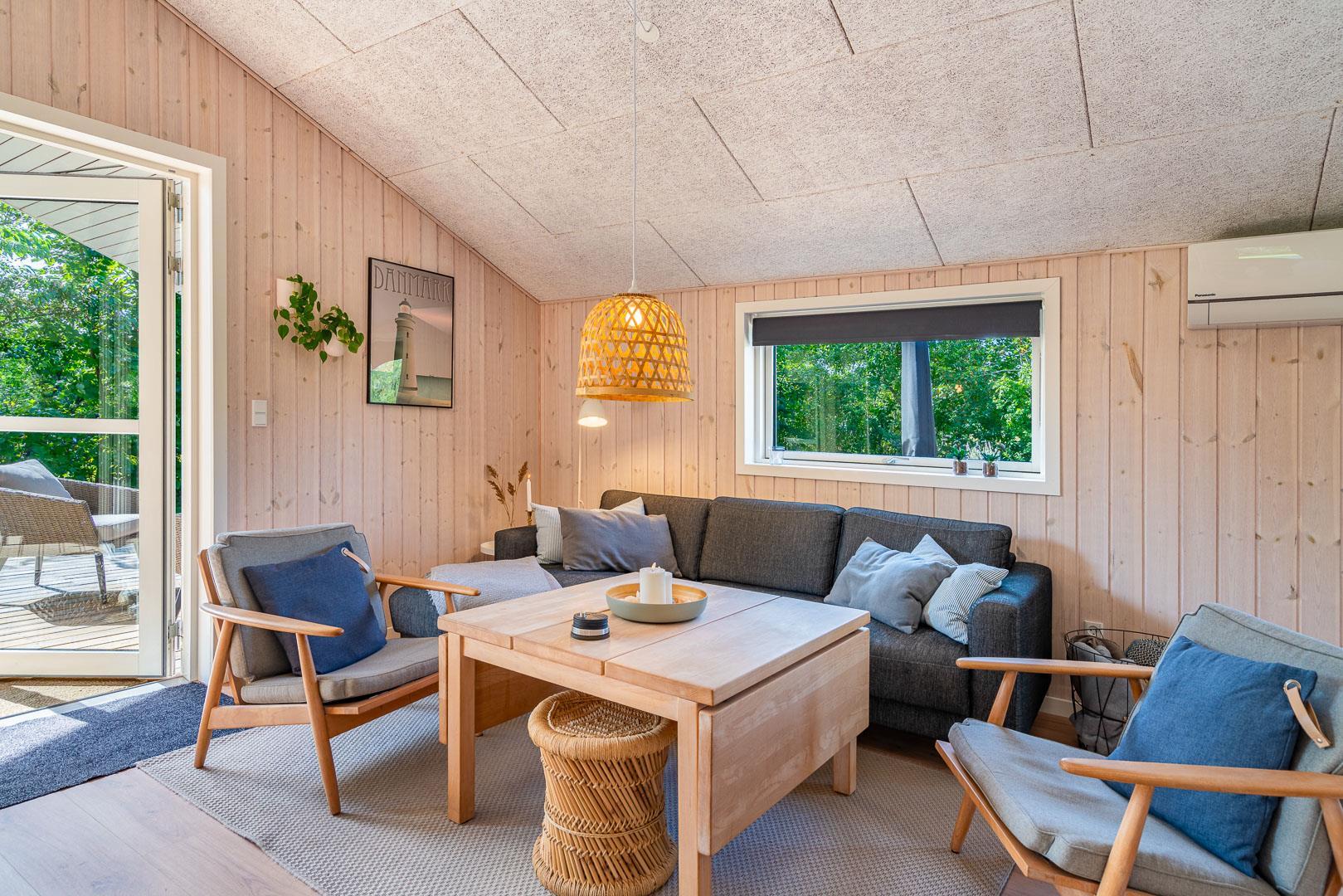 Træd ind i det lyse køkken, der ligger i forbindelse med stuen og skaber et dejligt rum for hele familien. Fra stuen er der udgang til den store lækre træterrasse, der omfavner det meste af sommerhuset og giver rig mulighed for udendørs afslapning og hygge – slap af i solen på liggestolene, nyd en god kop kaffe i loungemøblerne under den overdækkede terrasse eller spis aftensmaden under åben himmel. Nyd synet af flammerne fra den centrale brændeovn, der spreder varme og stemning både i stuen og køkkenet.