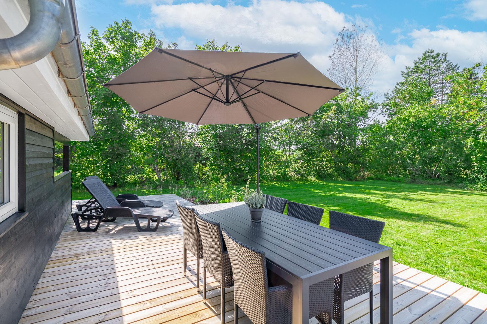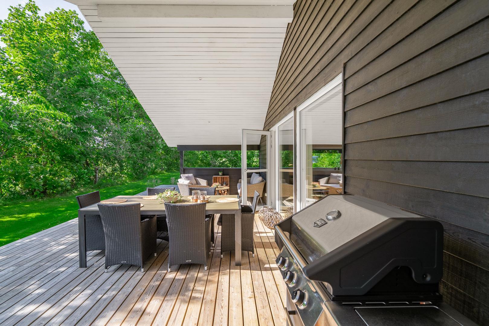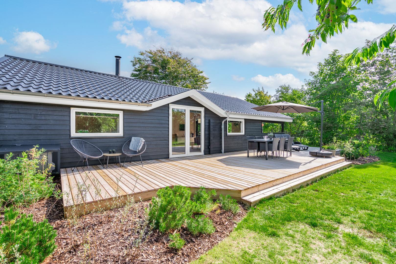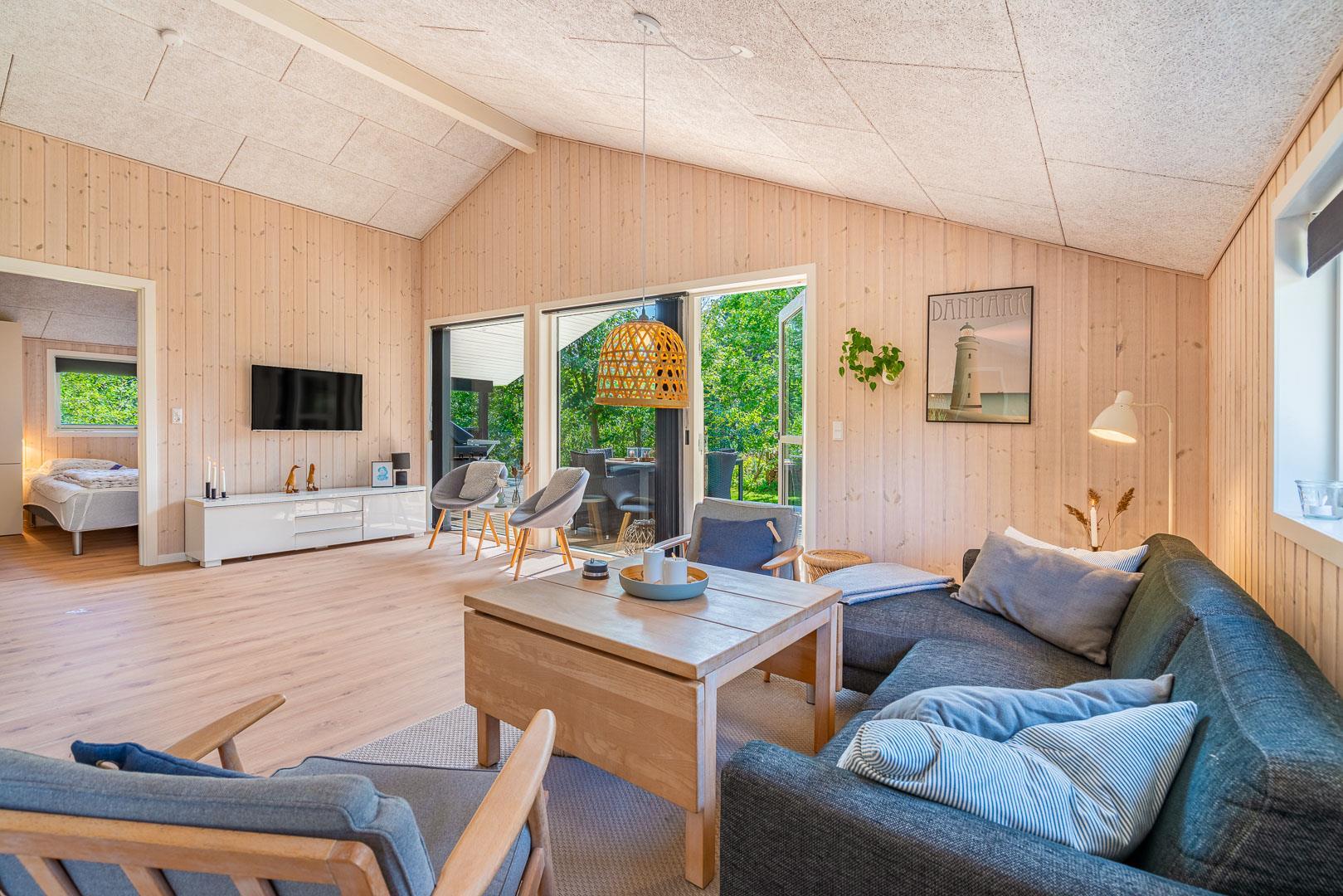 Træd ind i det lyse køkken, der ligger i forbindelse med stuen og skaber et dejligt rum for hele familien. Fra stuen er der udgang til den store lækre træterrasse, der omfavner det meste af sommerhuset og giver rig mulighed for udendørs afslapning og hygge – slap af i solen på liggestolene, nyd en god kop kaffe i loungemøblerne under den overdækkede terrasse eller spis aftensmaden under åben himmel. Nyd synet af flammerne fra den centrale brændeovn, der spreder varme og stemning både i stuen og køkkenet.