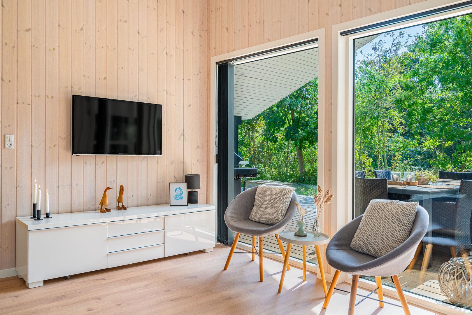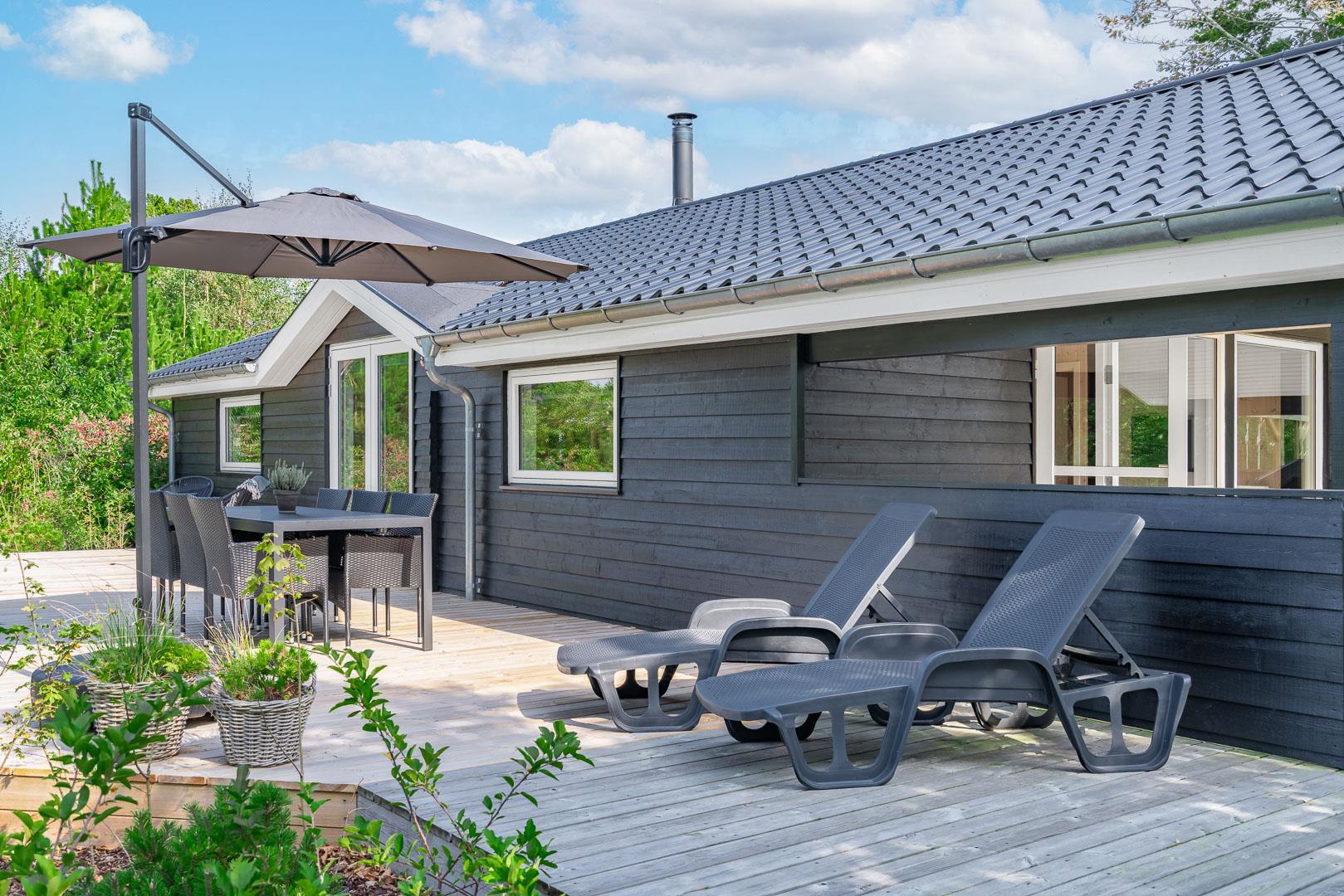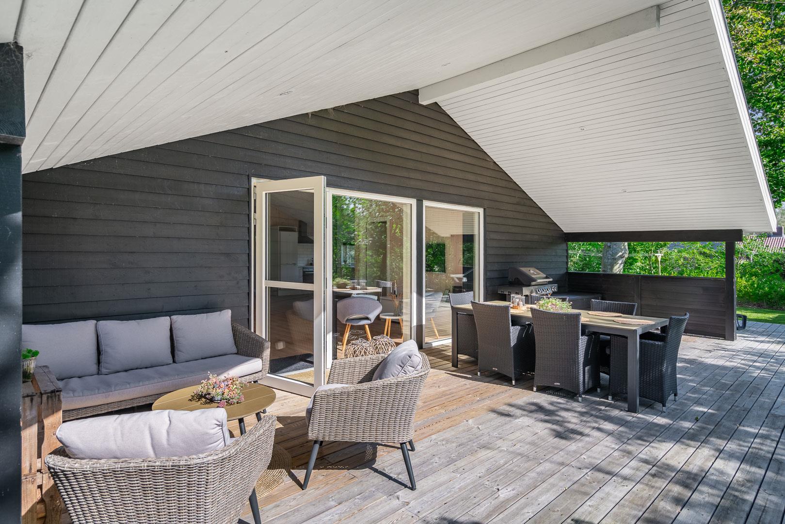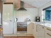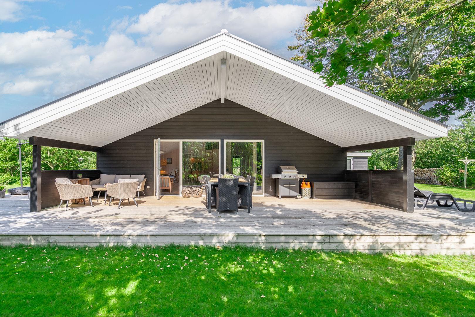 Træd ind i det lyse køkken, der ligger i forbindelse med stuen og skaber et dejligt rum for hele familien. Fra stuen er der udgang til den store lækre træterrasse, der omfavner det meste af sommerhuset og giver rig mulighed for udendørs afslapning og hygge – slap af i solen på liggestolene, nyd en god kop kaffe i loungemøblerne under den overdækkede terrasse eller spis aftensmaden under åben himmel. Nyd synet af flammerne fra den centrale brændeovn, der spreder varme og stemning både i stuen og køkkenet.