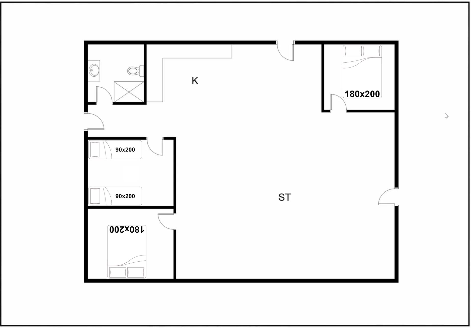 Sengestørrelse: 2 dobbeltsenge 180 x 200 cm + 2 enkeltsenge 90 x 200 cm.