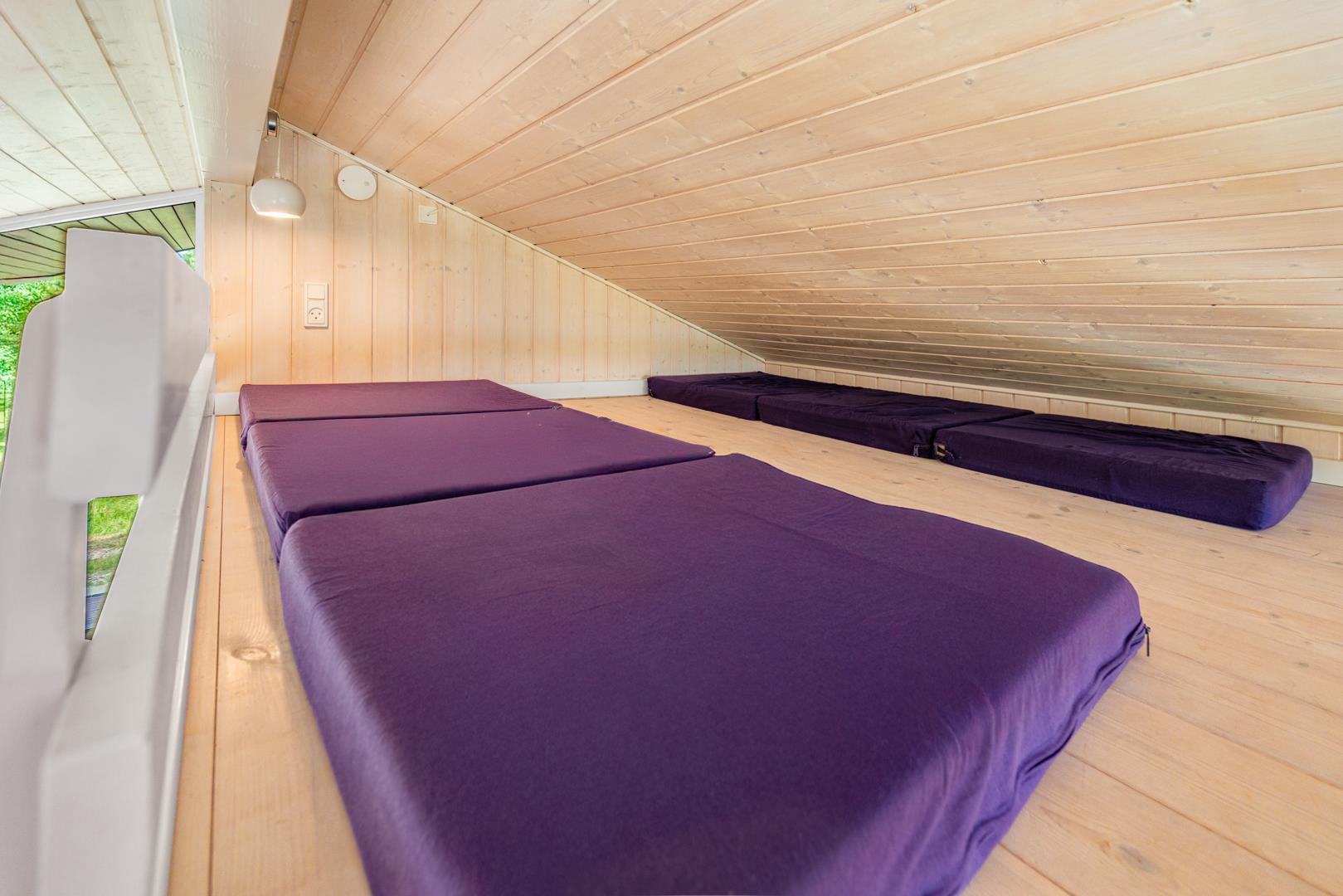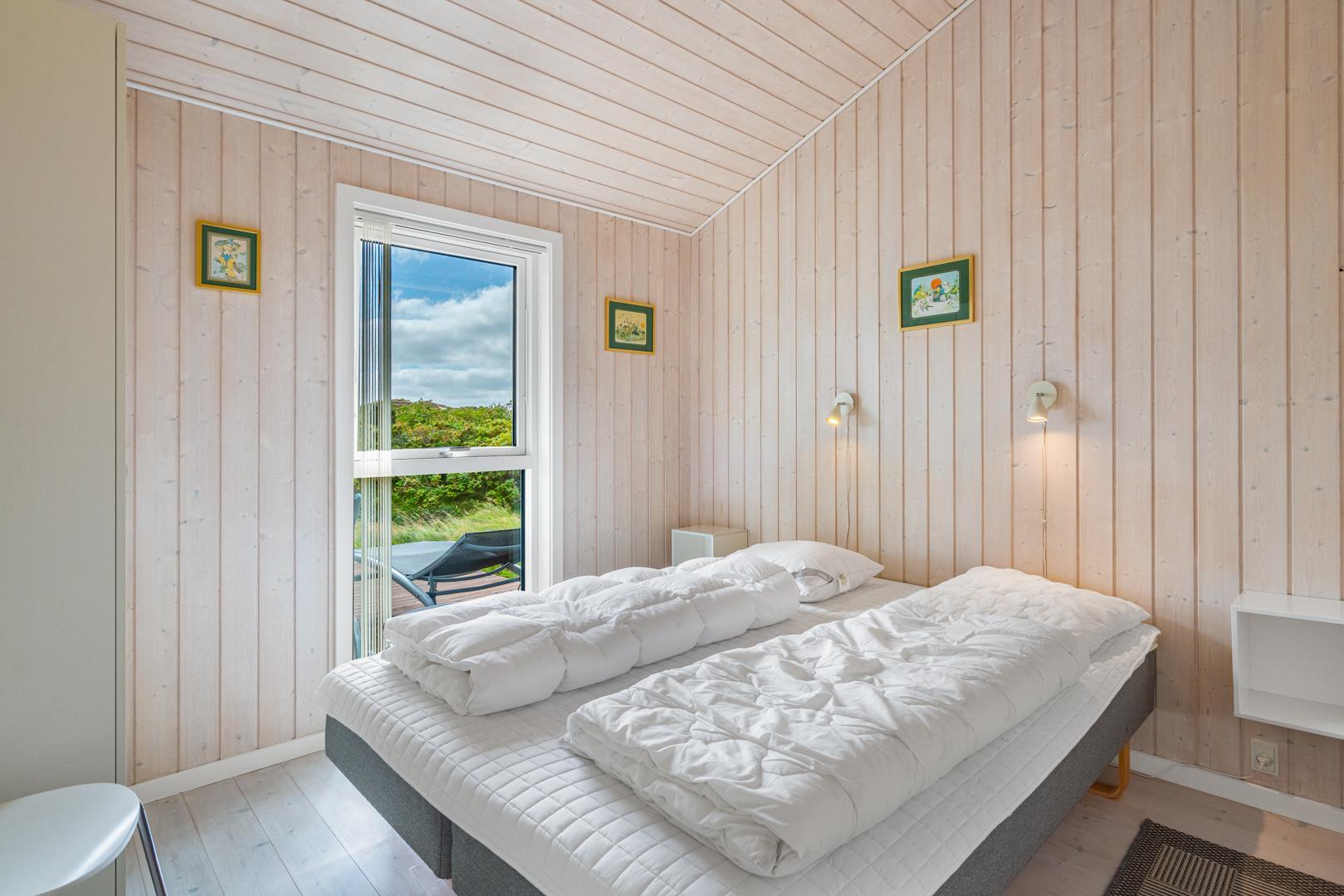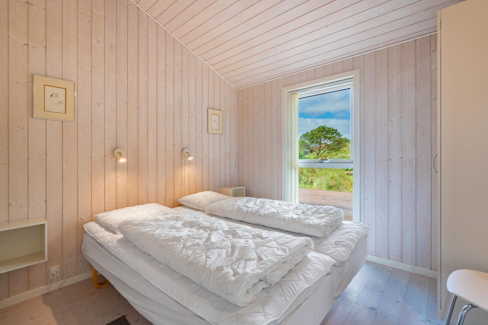 Sommerhuset har tre soveværelser – to med dobbeltsenge og ét med to enkeltsenge. Derudover er der en hyggelig hems, som især børn vil elske som ekstra soveplads eller lille gemmested.