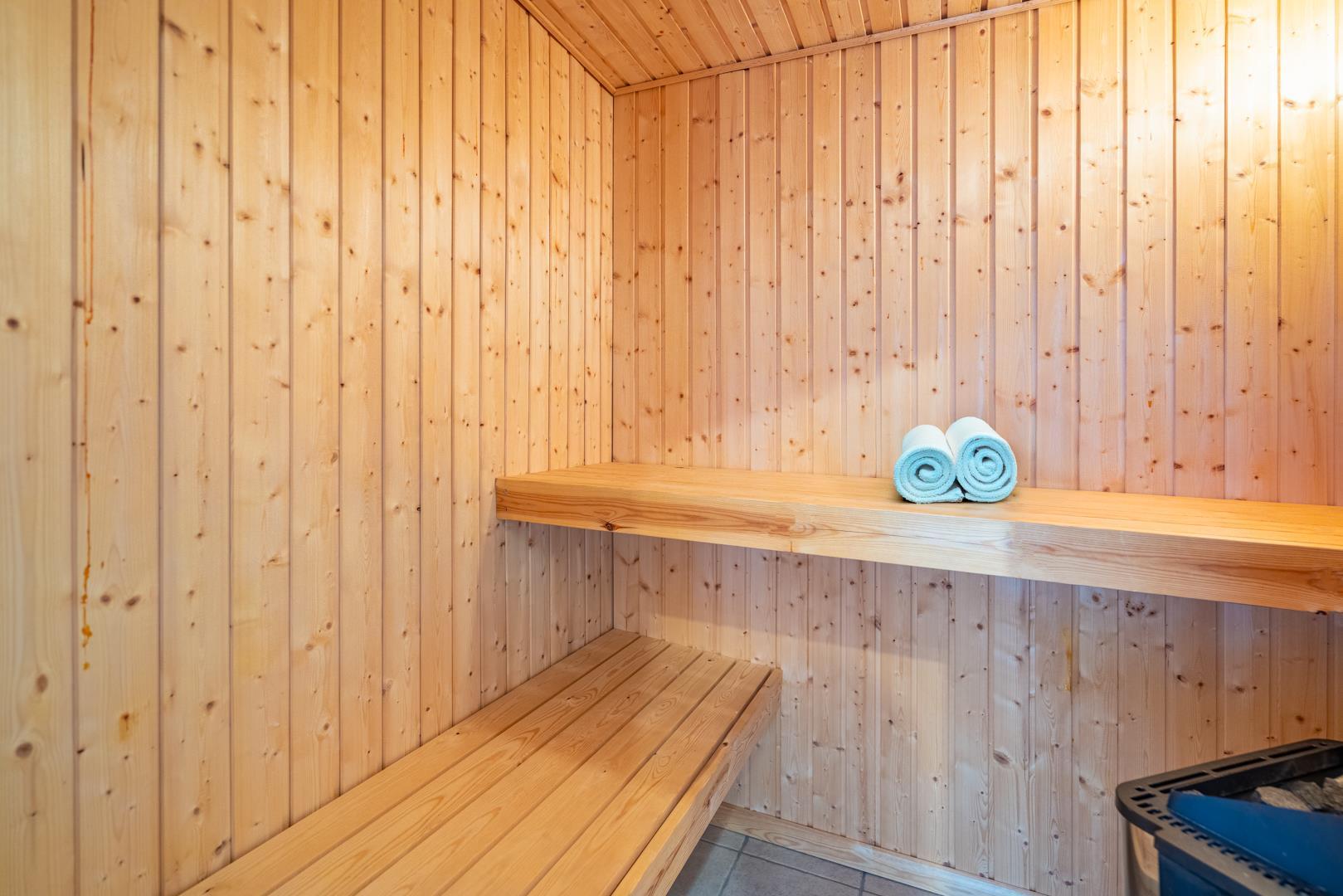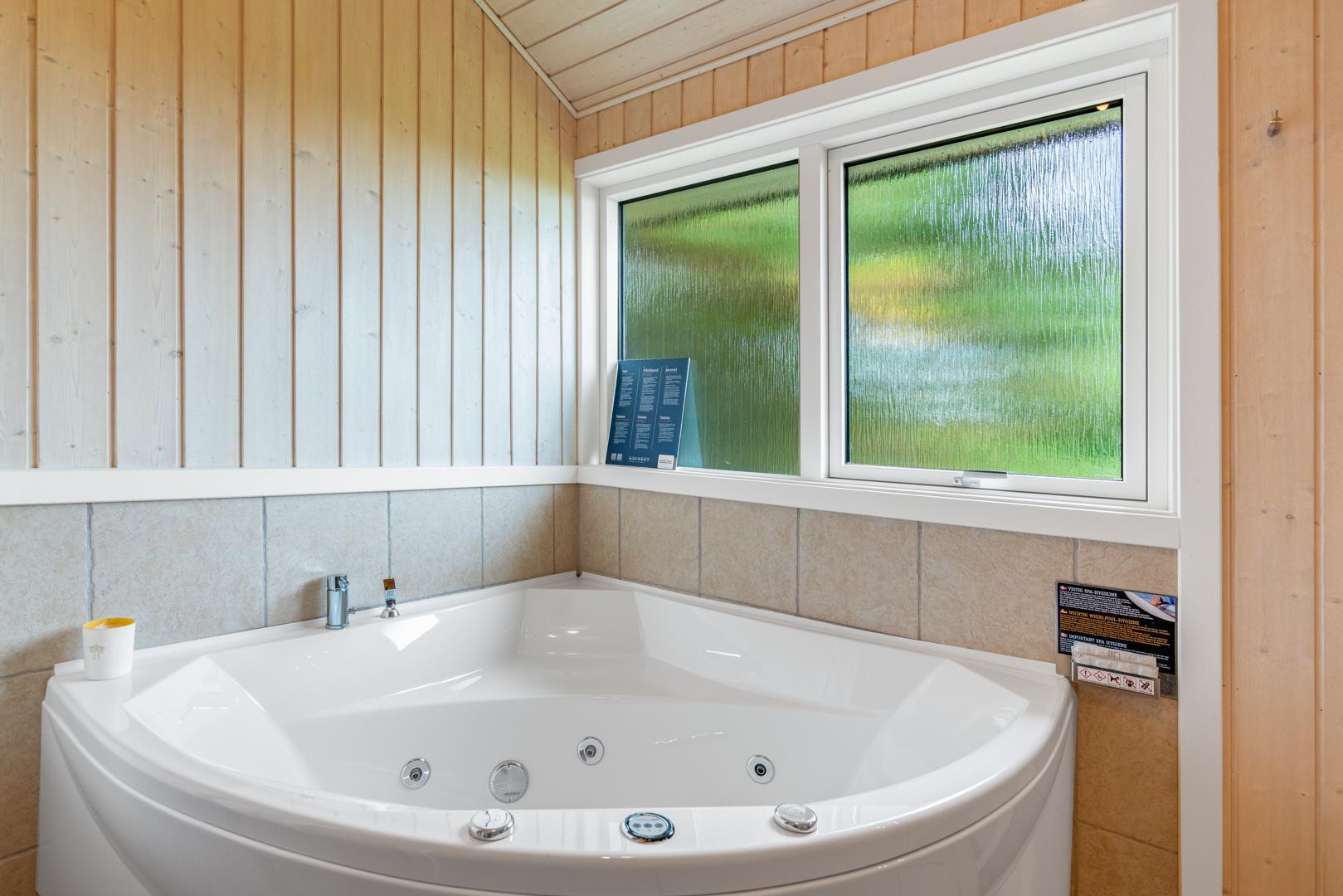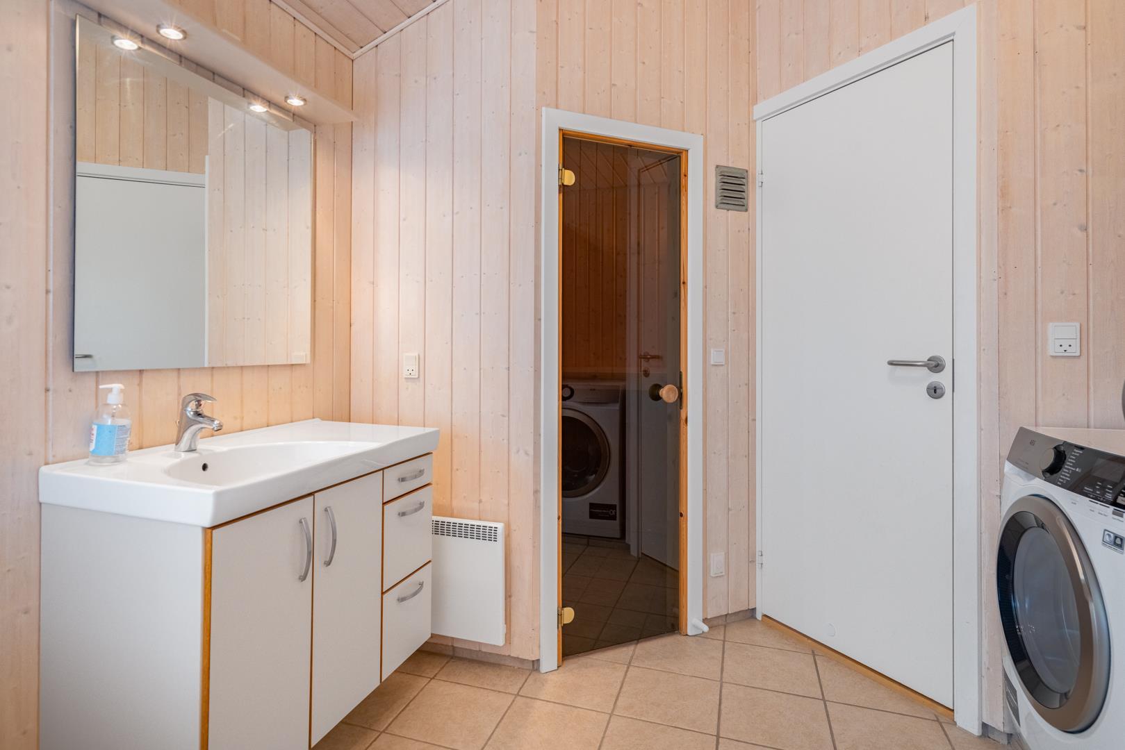Badeværelset er mere end blot funktionelt – her finder I jeres egen lille wellness-oase med både sauna og spabad, hvor I kan slappe af efter en dag i naturen. Sommerhuset har desuden vaskemaskine, tørretumbler og værdiboks, som gør opholdet ekstra komfortabelt.