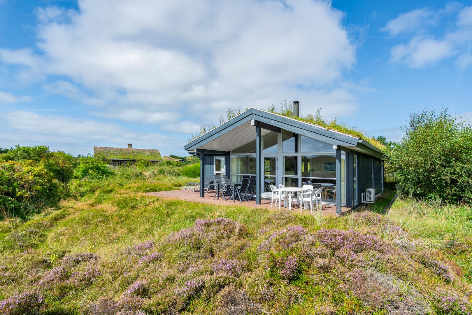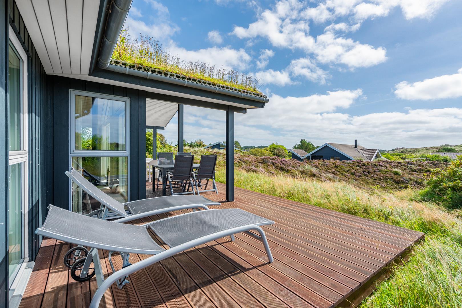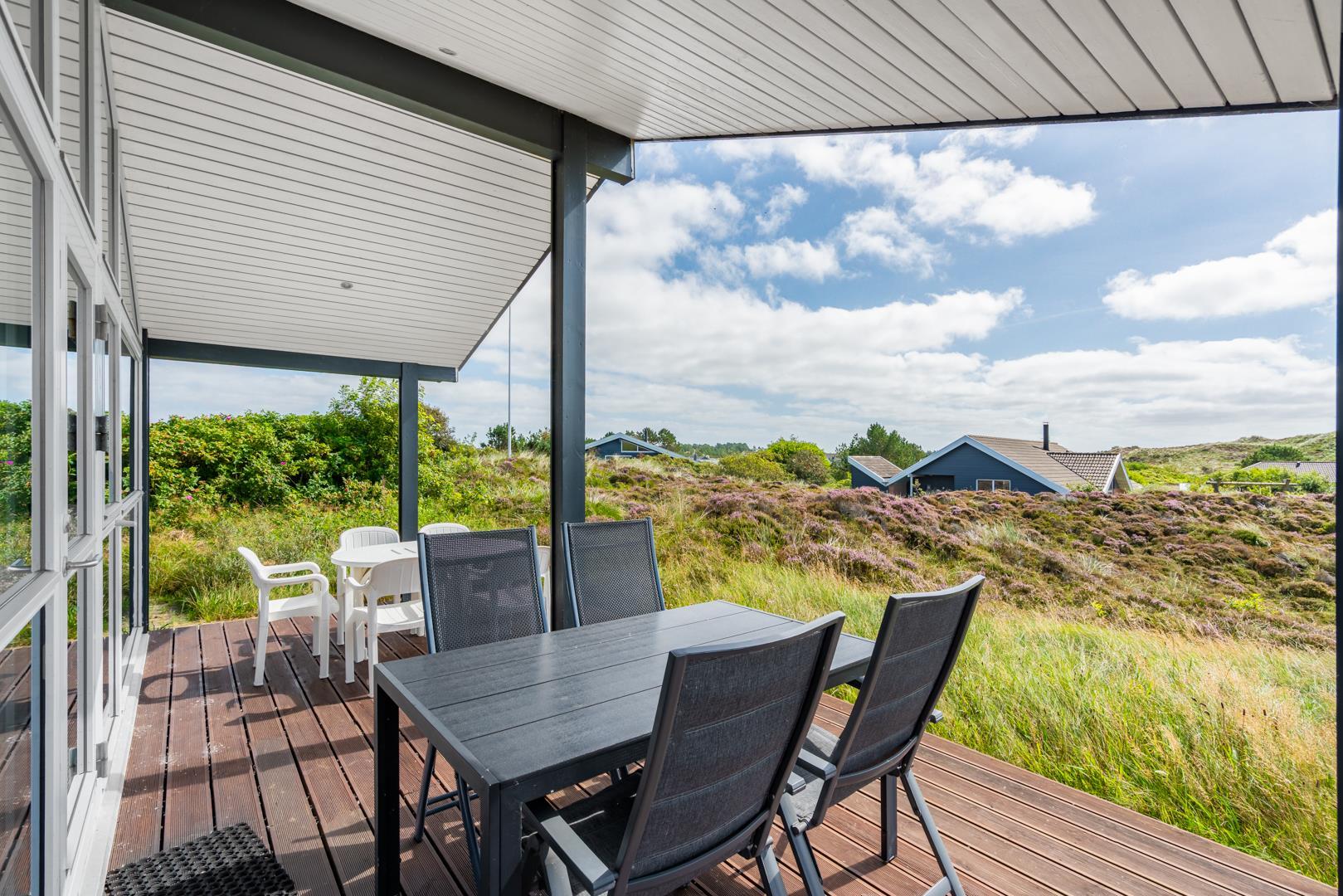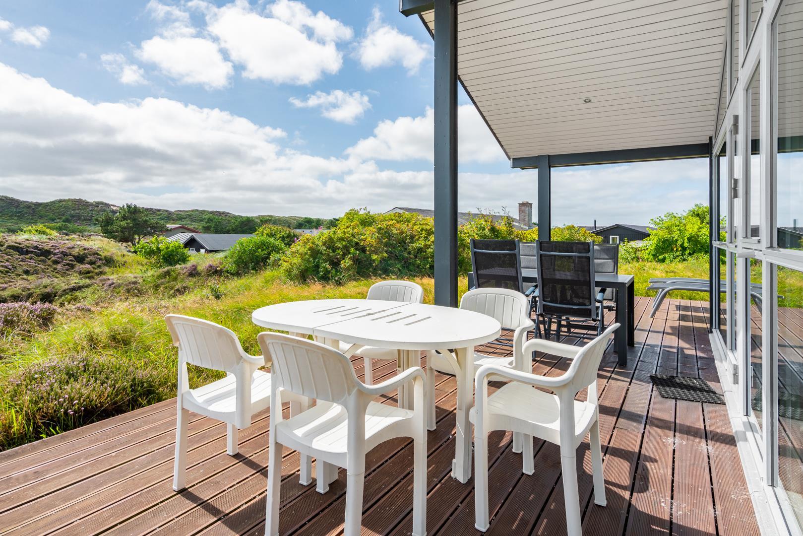 Udenfor venter en lukket og vindbeskyttet terrasse med havemøbler. Her kan I spise morgenmad i solen, nyde et glas vin om aftenen og bare slappe af i de rolige omgivelser. Udsigten til klitterne og naturen omkring sommerhuset gør terrassen til et helt særligt sted.