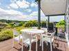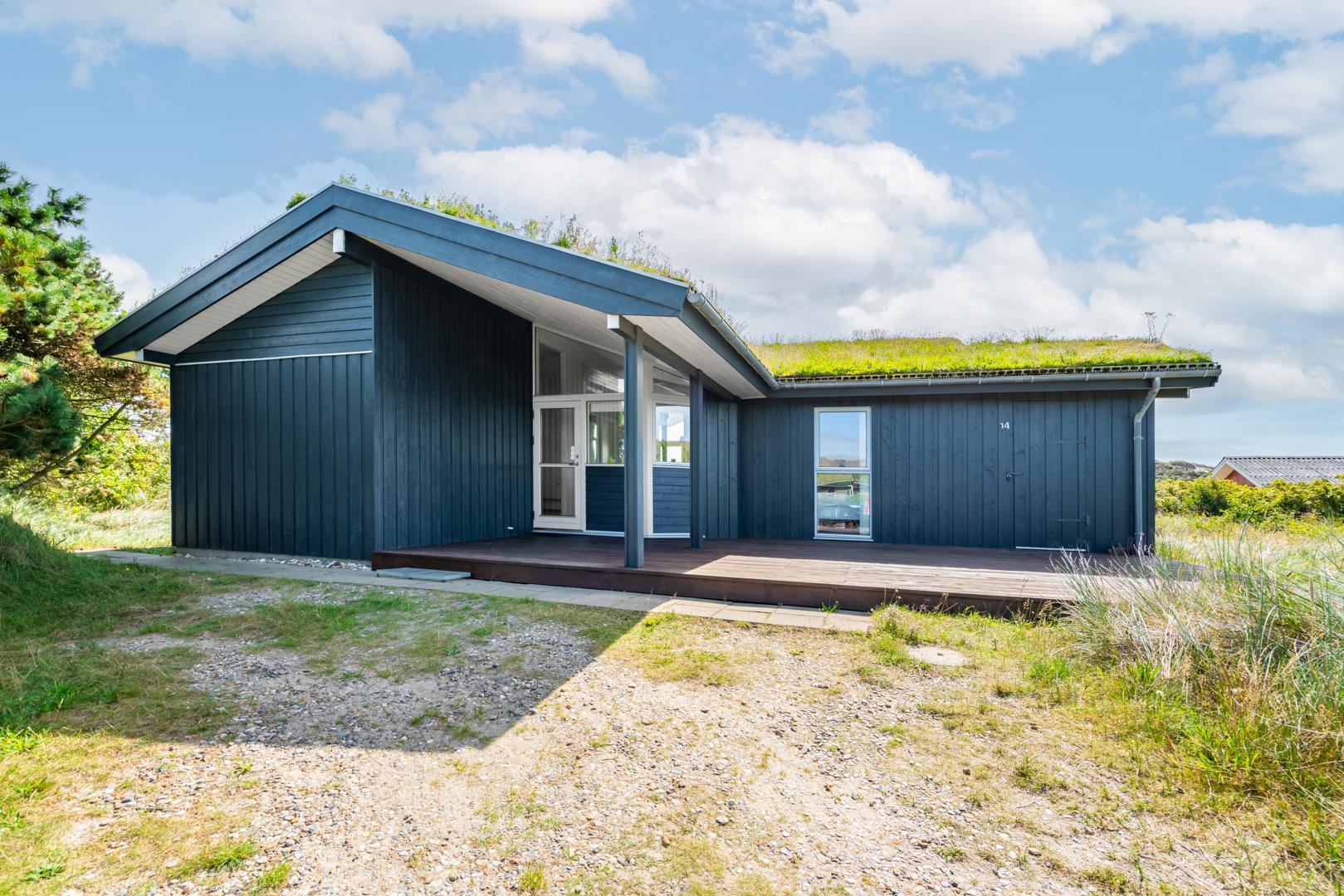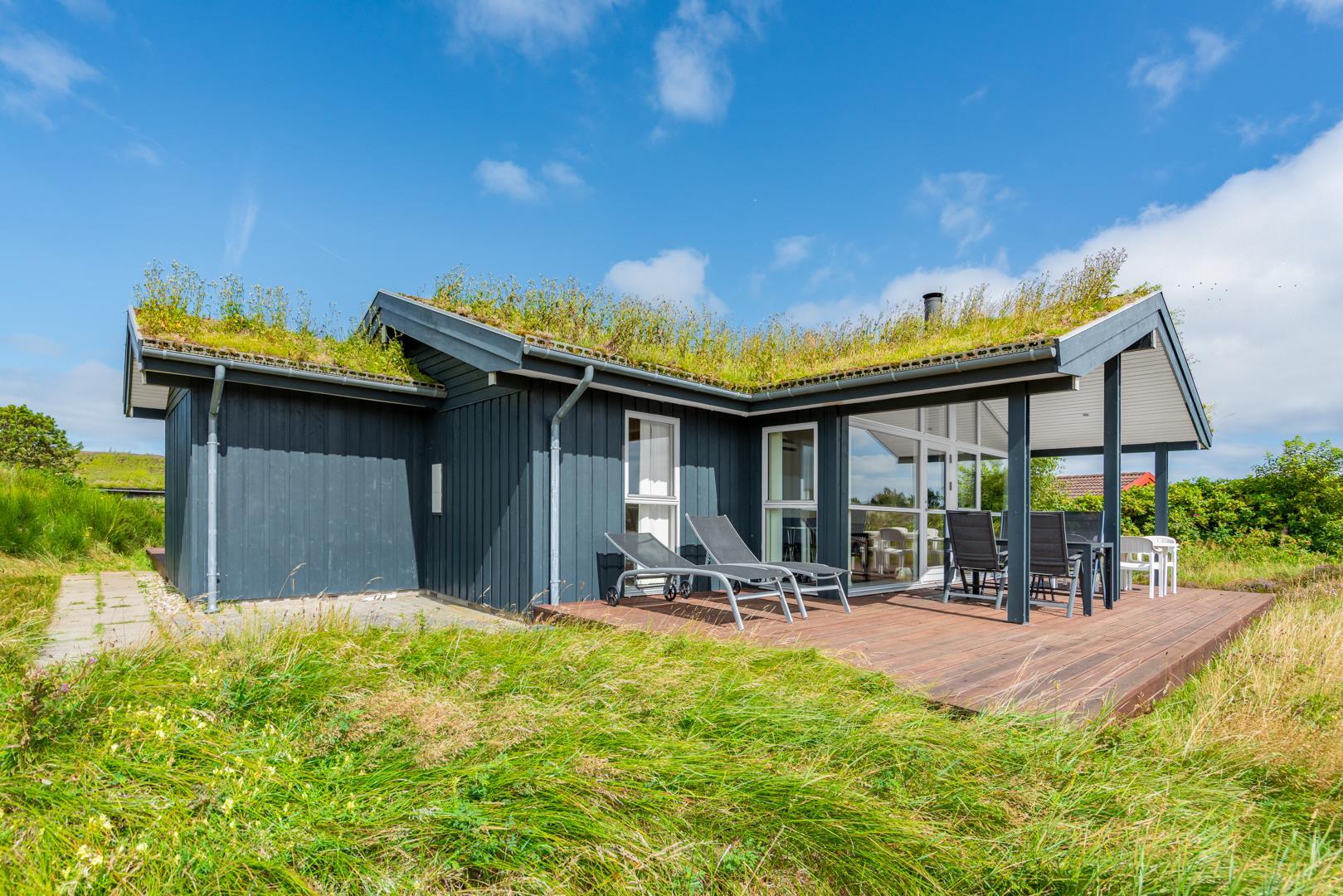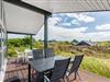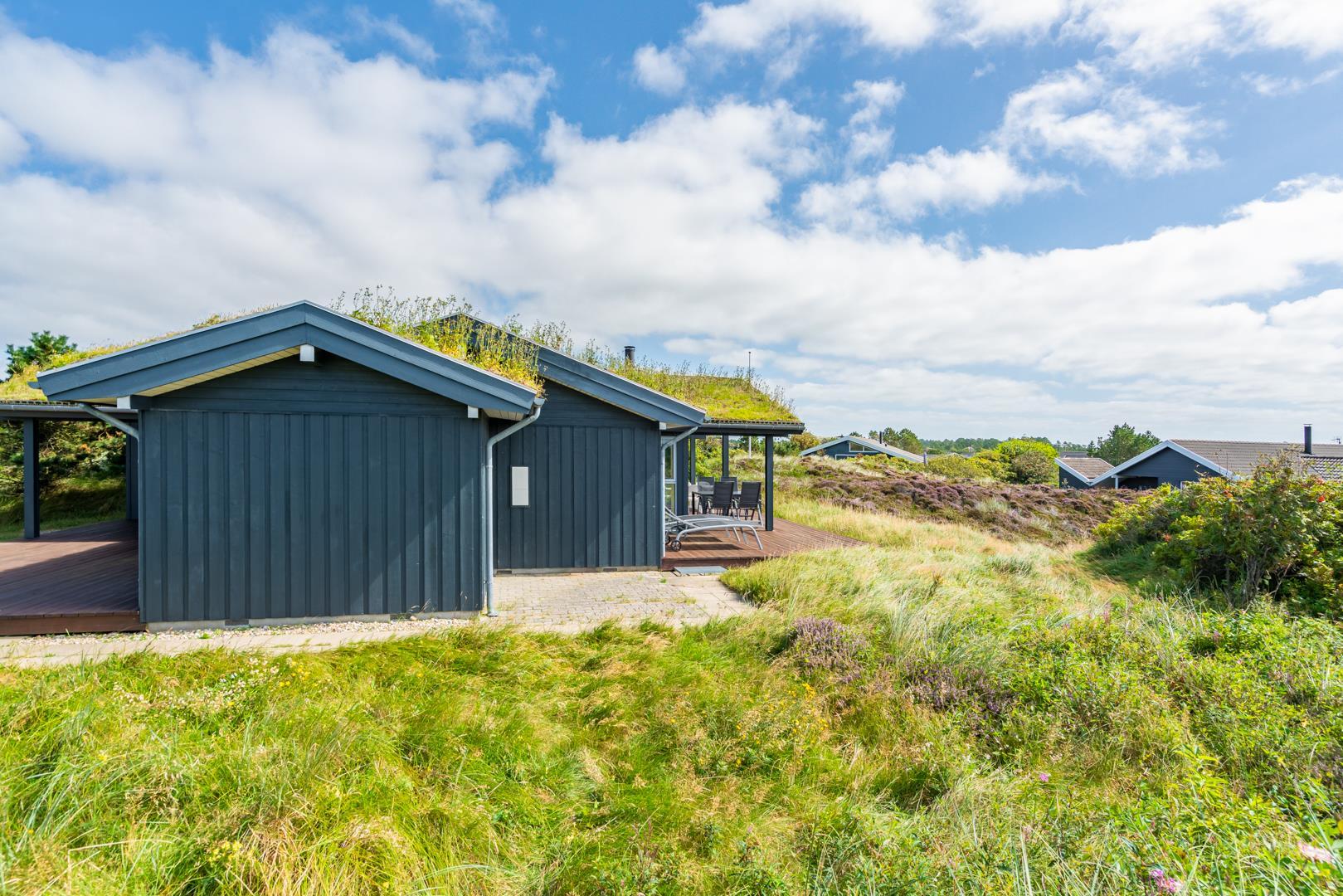 Udenfor venter en lukket og vindbeskyttet terrasse med havemøbler. Her kan I spise morgenmad i solen, nyde et glas vin om aftenen og bare slappe af i de rolige omgivelser. Udsigten til klitterne og naturen omkring sommerhuset gør terrassen til et helt særligt sted.