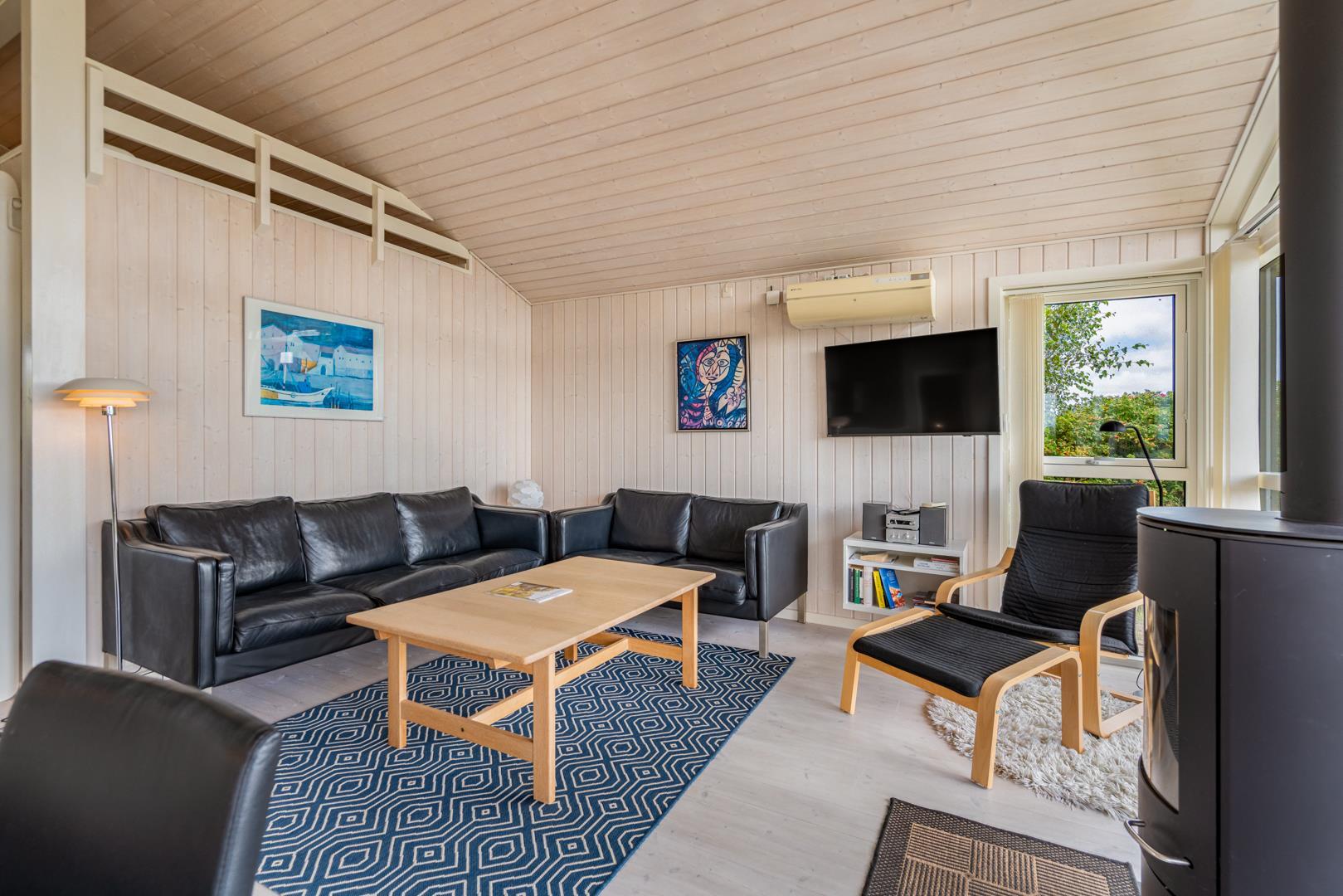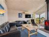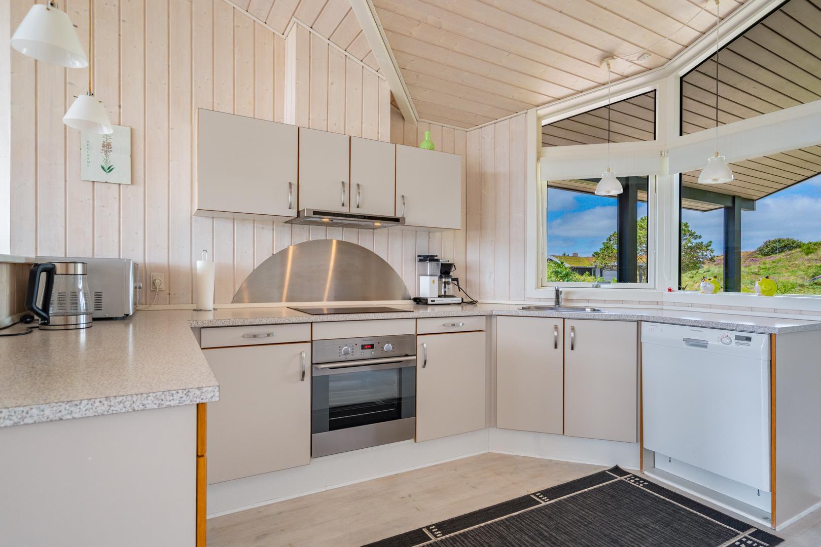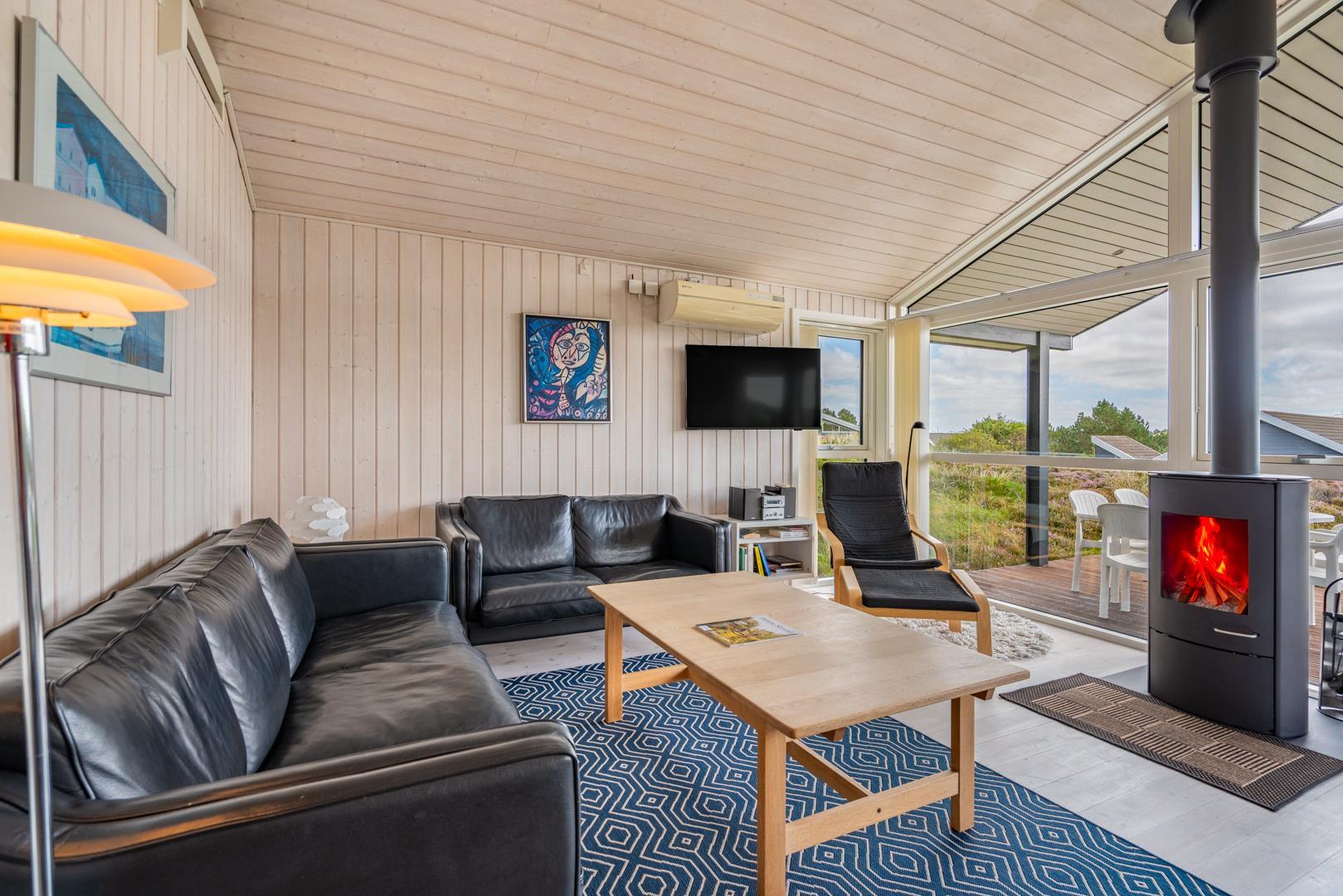De store vinduer giver masser af naturligt lys og en smuk udsigt til klitlandskabet. Den åbne stue med brændeovn skaber en varm og indbydende stemning, mens varmepumpen sørger for behagelig temperatur året rundt.
