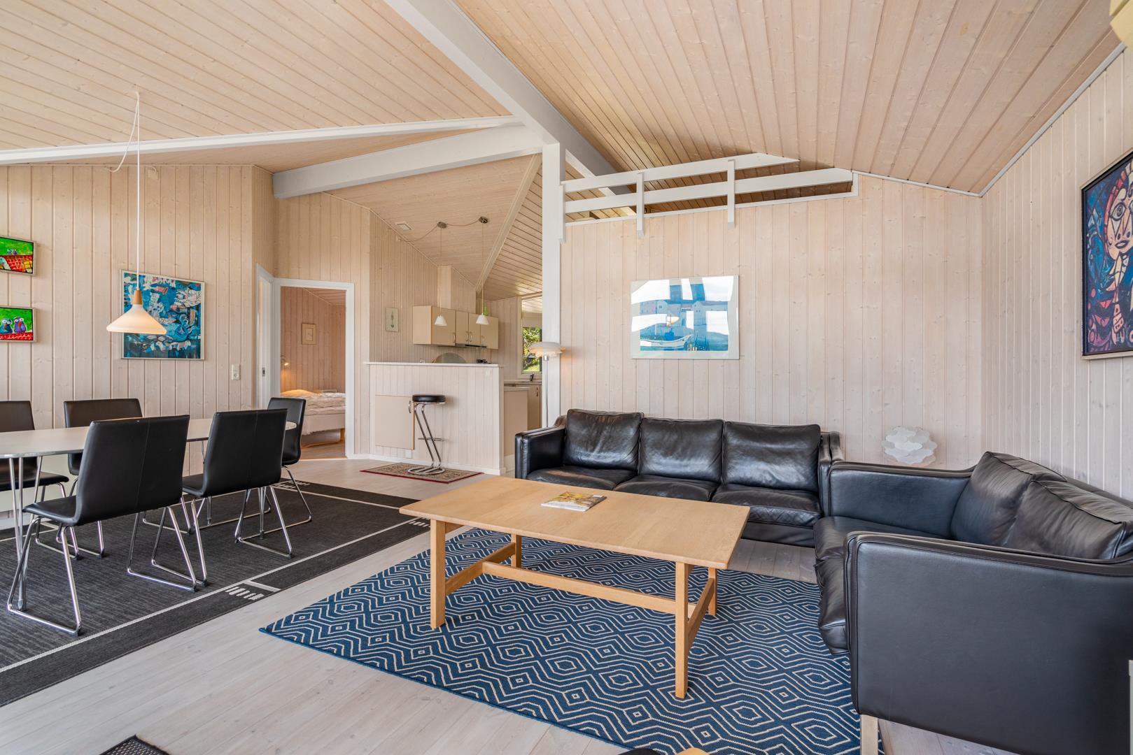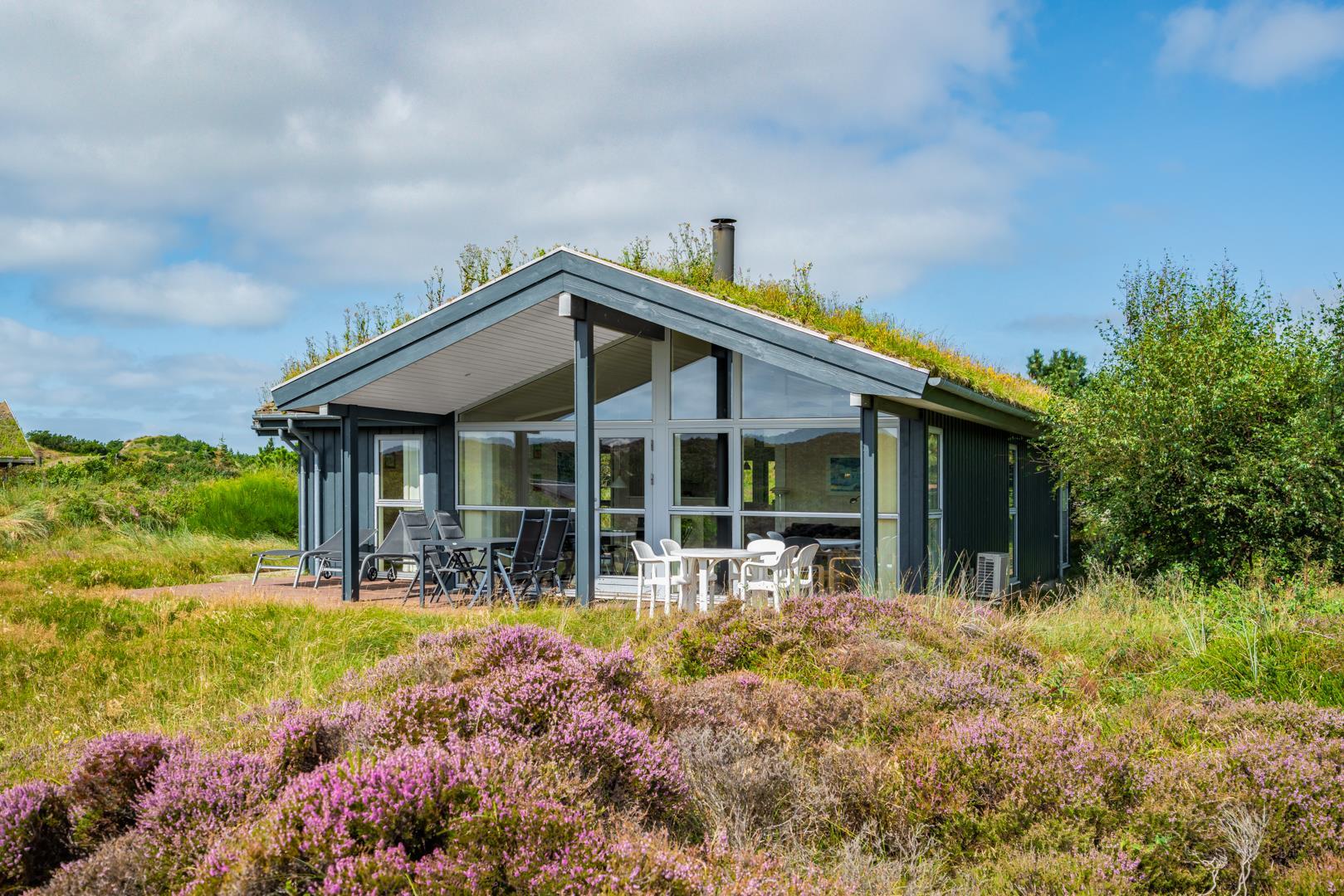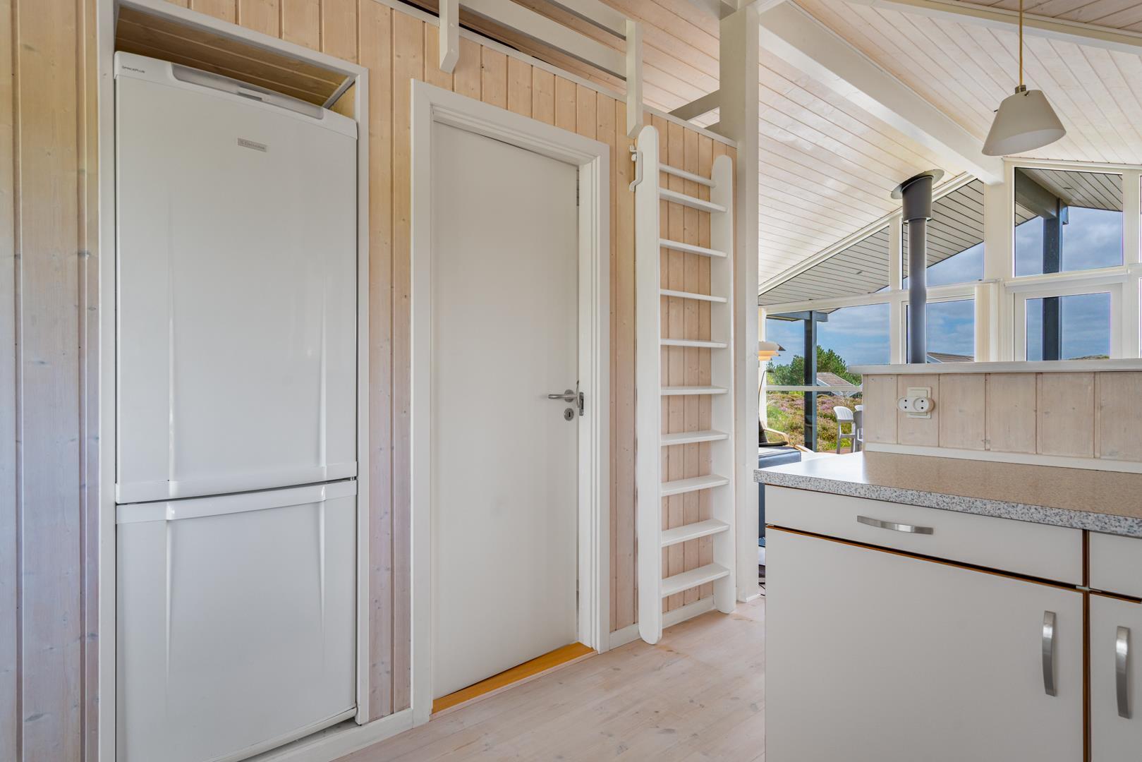 De store vinduer giver masser af naturligt lys og en smuk udsigt til klitlandskabet. Den åbne stue med brændeovn skaber en varm og indbydende stemning, mens varmepumpen sørger for behagelig temperatur året rundt.