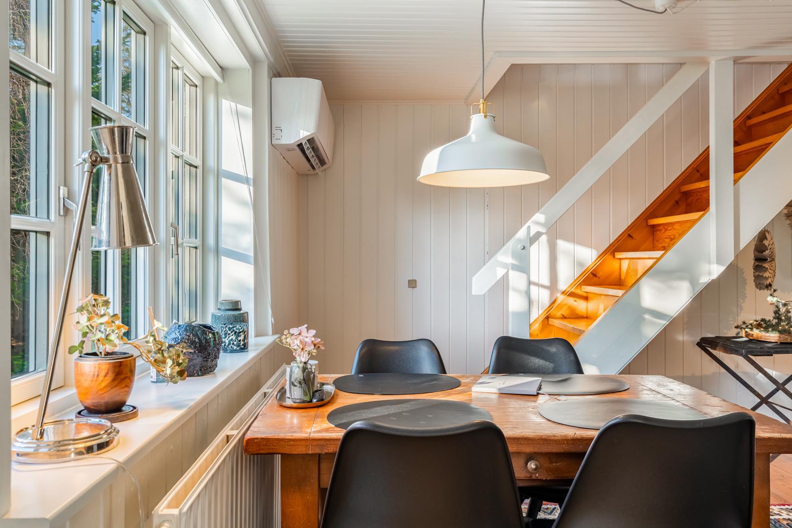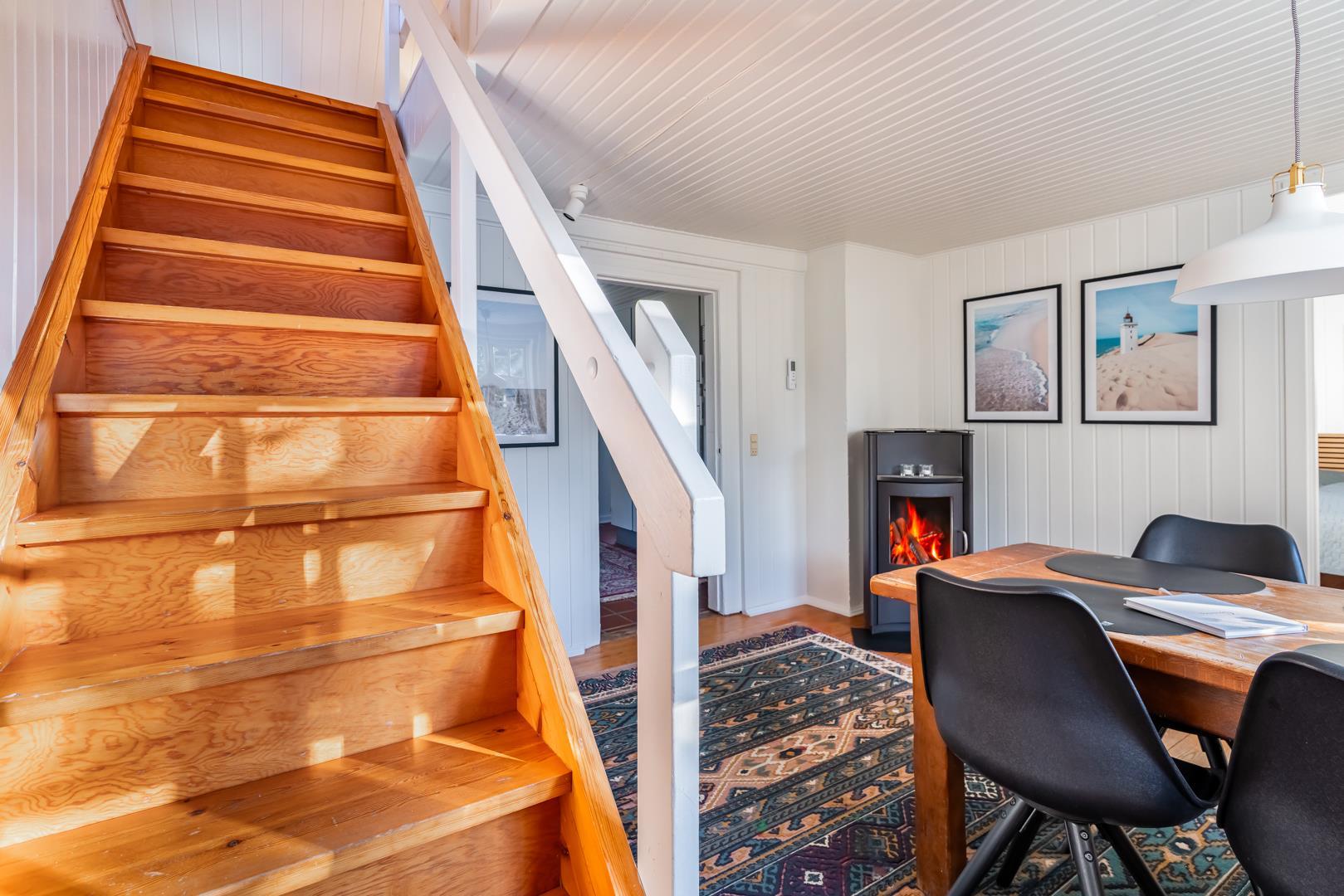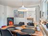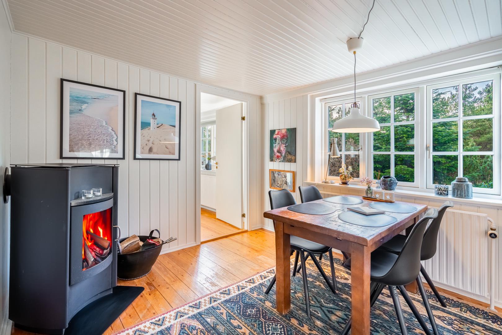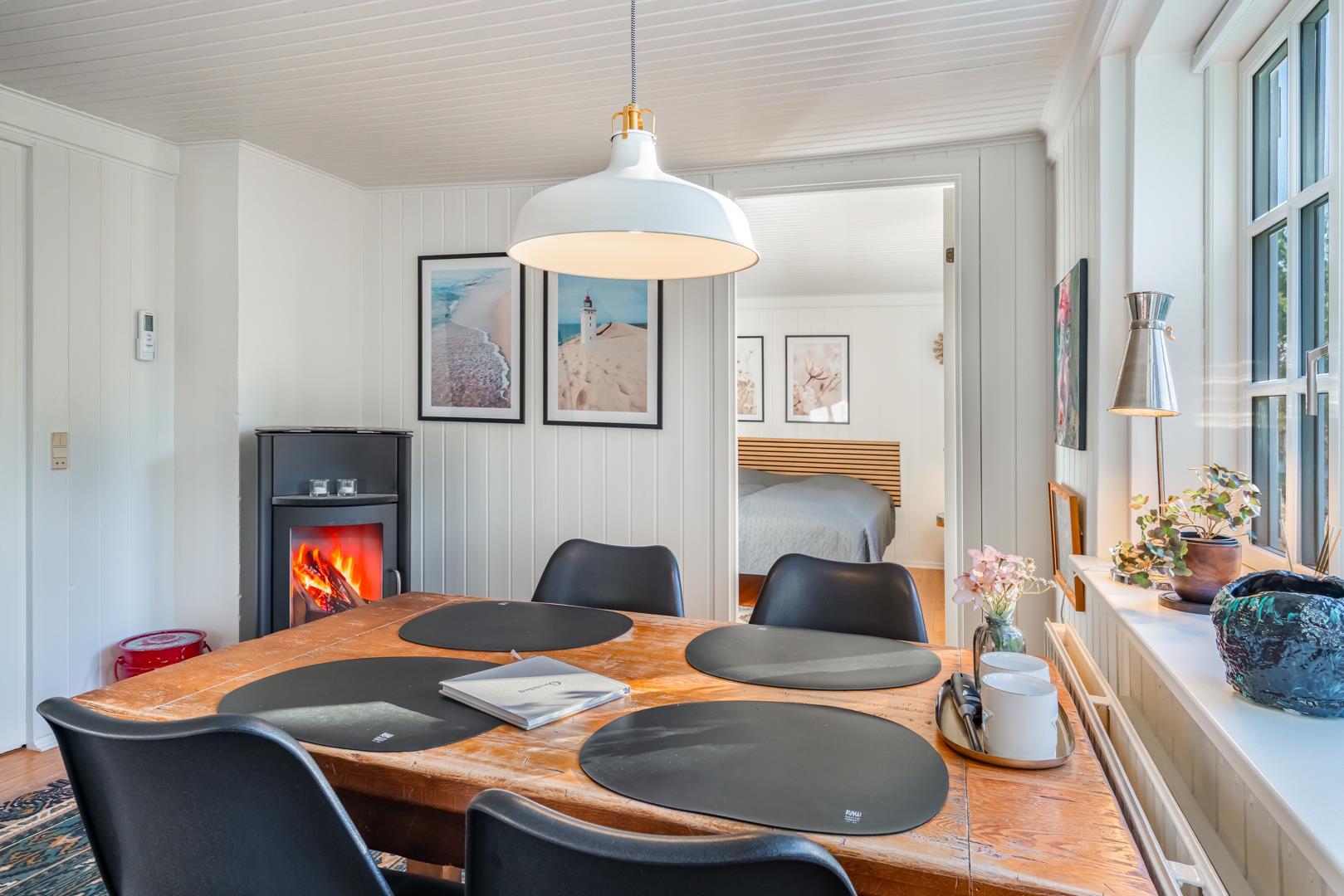 Den åbne stue er lys, venlig og indrettet med fokus på hygge og afslapning. Brændeovnen skaber en varm og hyggelig stemning på kølige dage, og varmepumpen sørger for et behageligt indeklima året rundt.