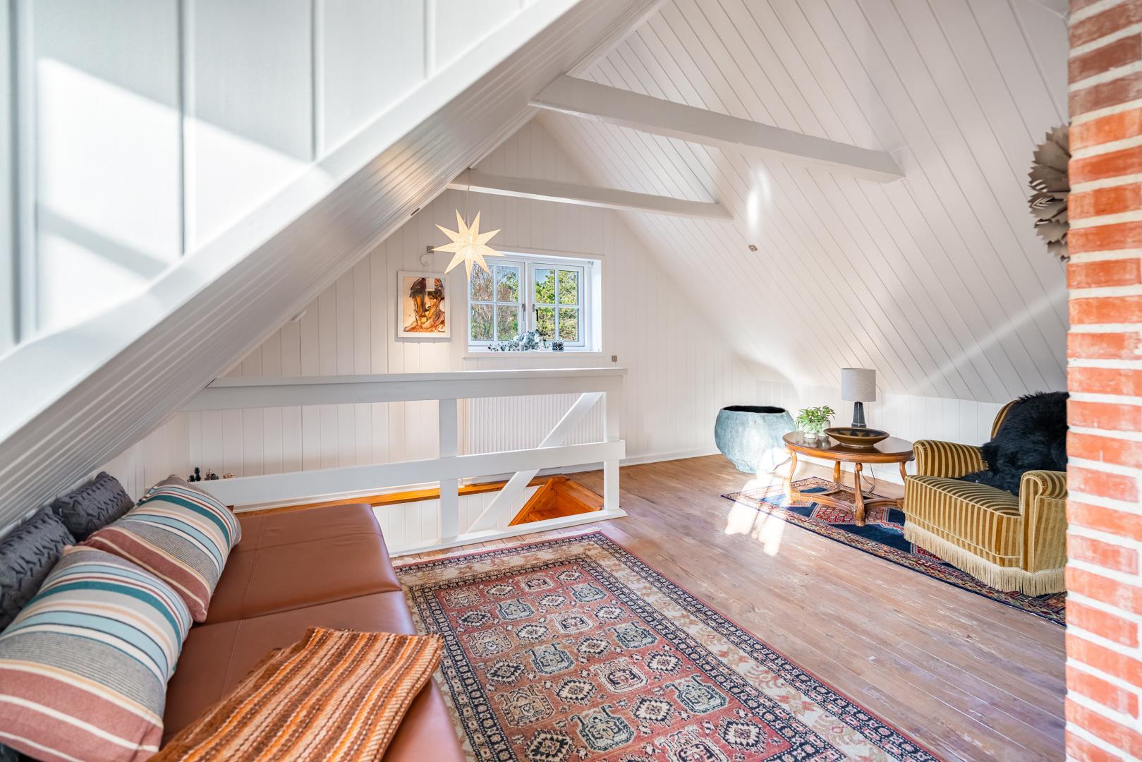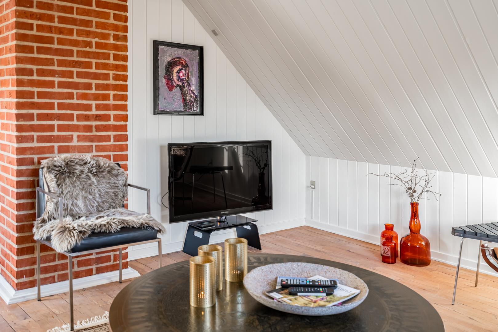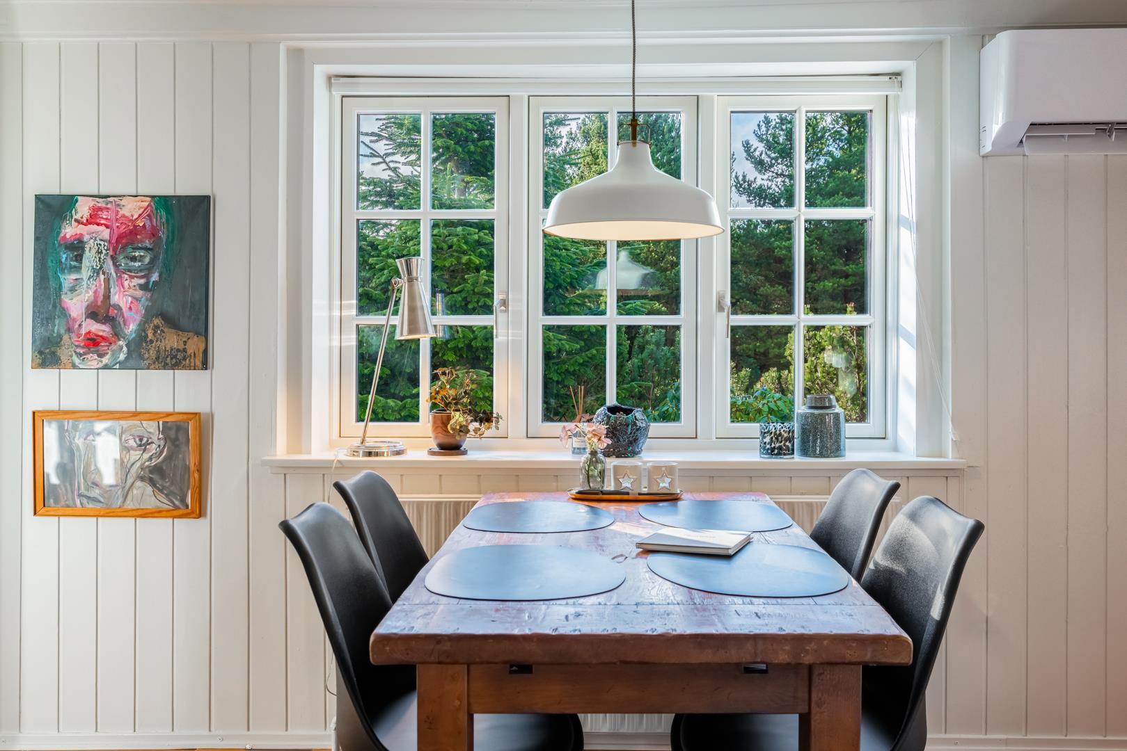 Den åbne stue er lys, venlig og indrettet med fokus på hygge og afslapning. Brændeovnen skaber en varm og hyggelig stemning på kølige dage, og varmepumpen sørger for et behageligt indeklima året rundt.