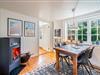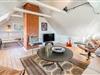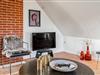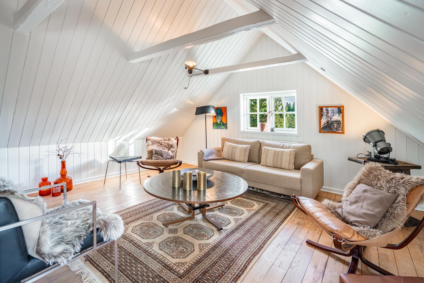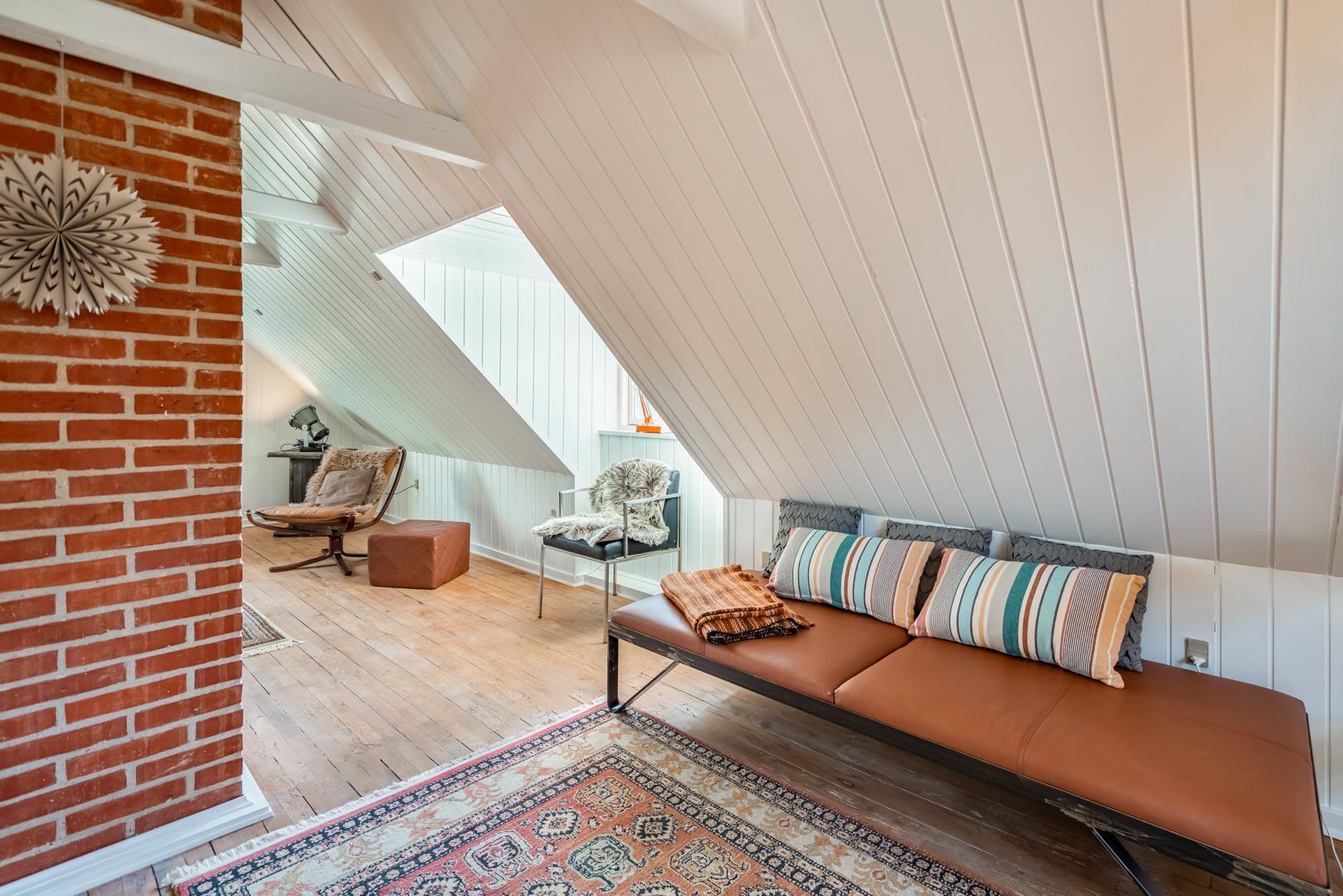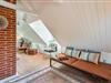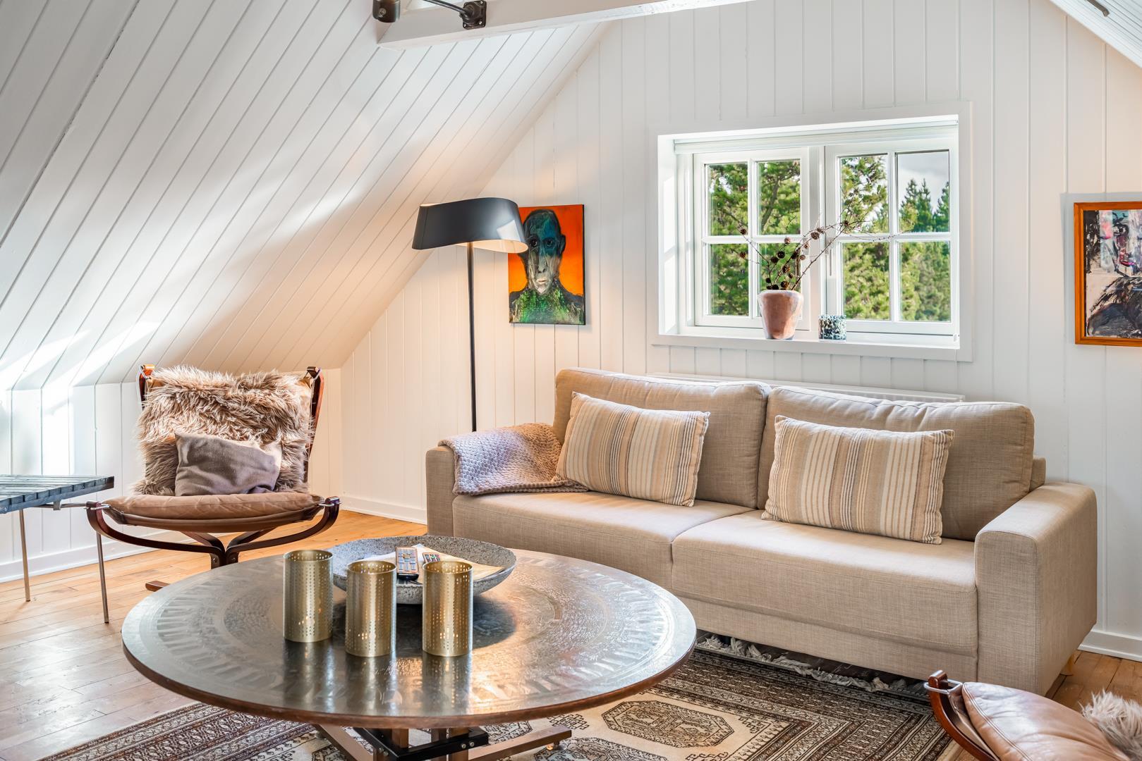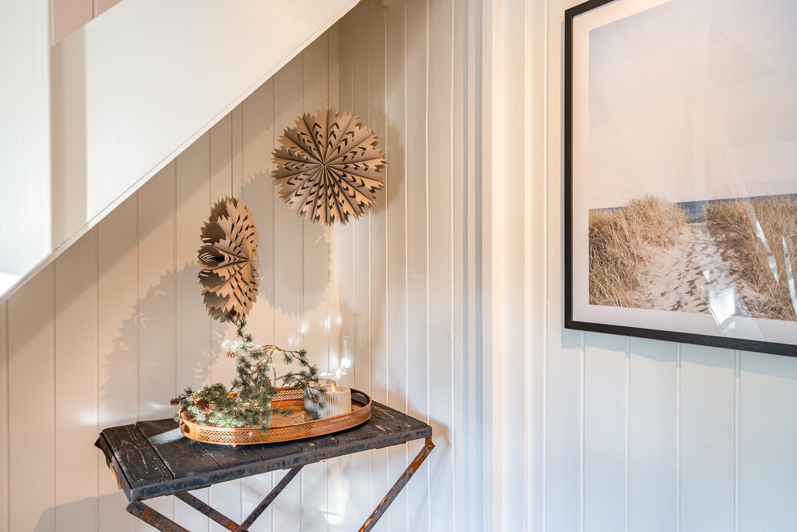 Den åbne stue er lys, venlig og indrettet med fokus på hygge og afslapning. Brændeovnen skaber en varm og hyggelig stemning på kølige dage, og varmepumpen sørger for et behageligt indeklima året rundt.