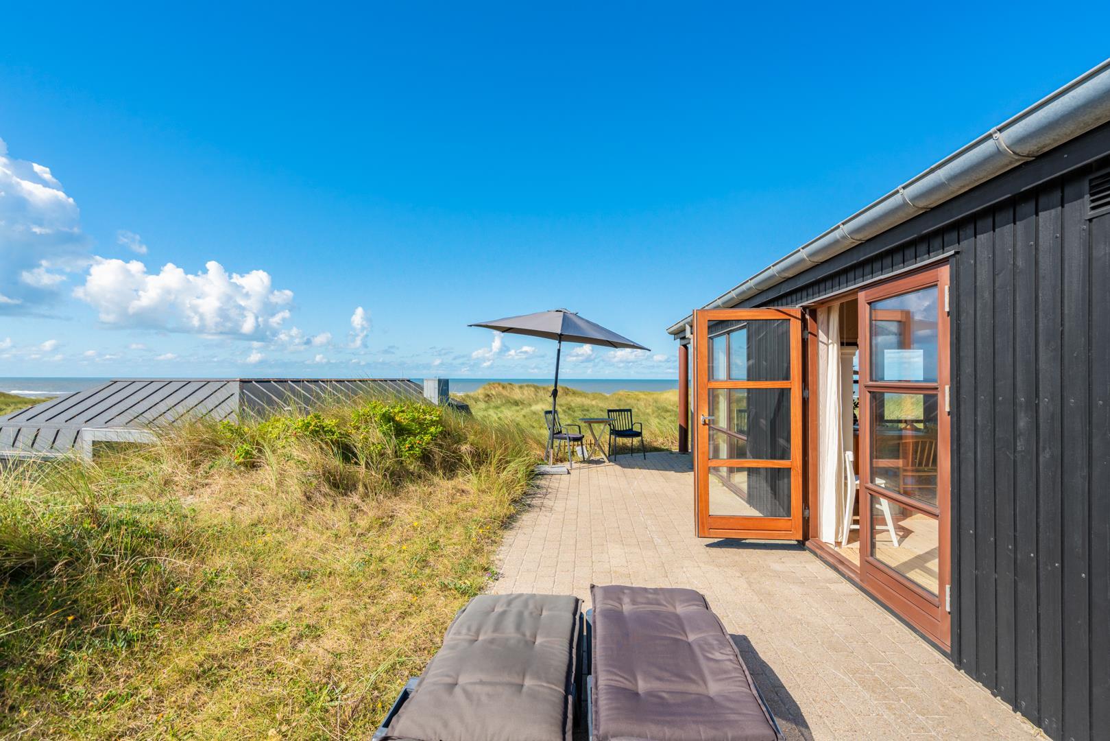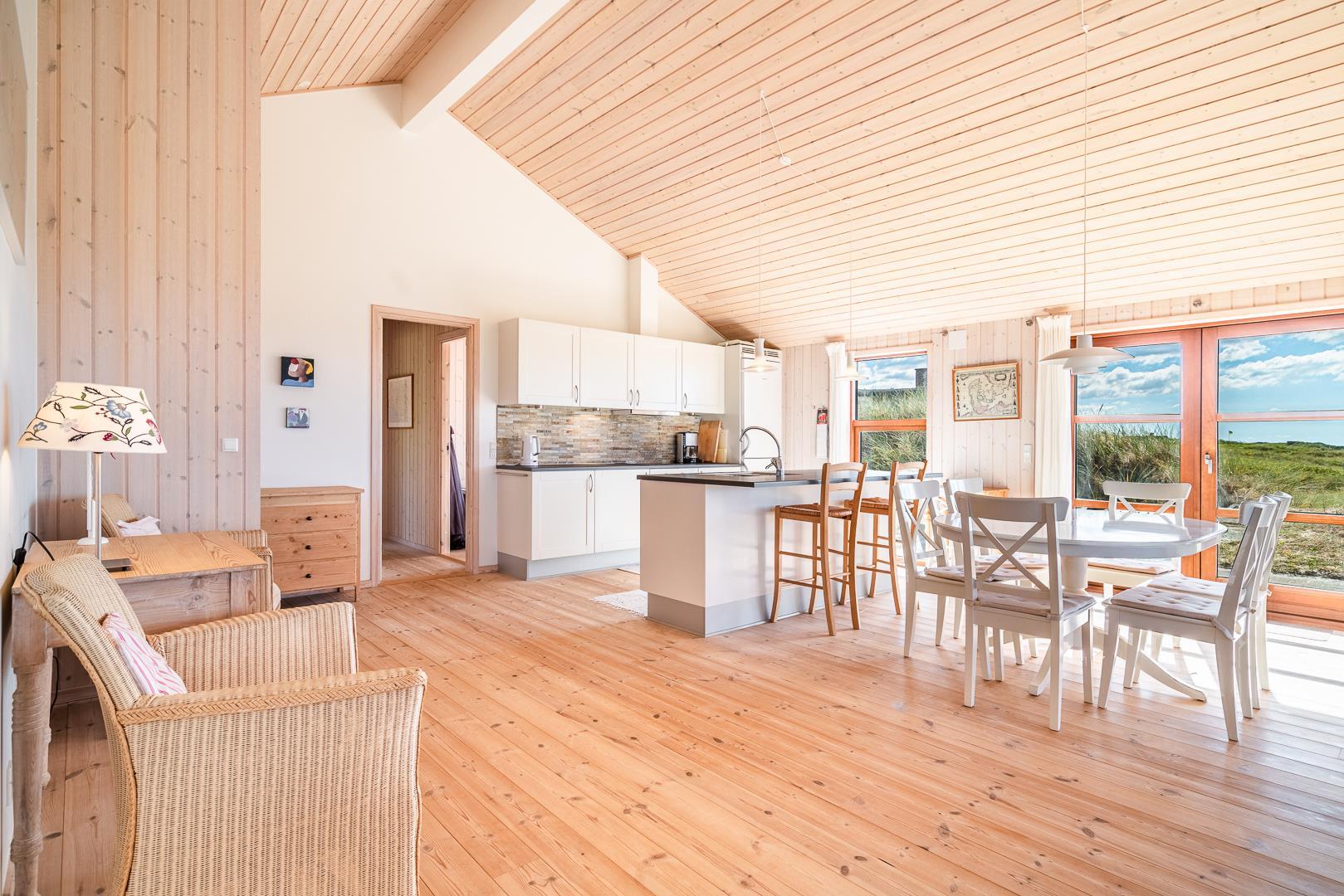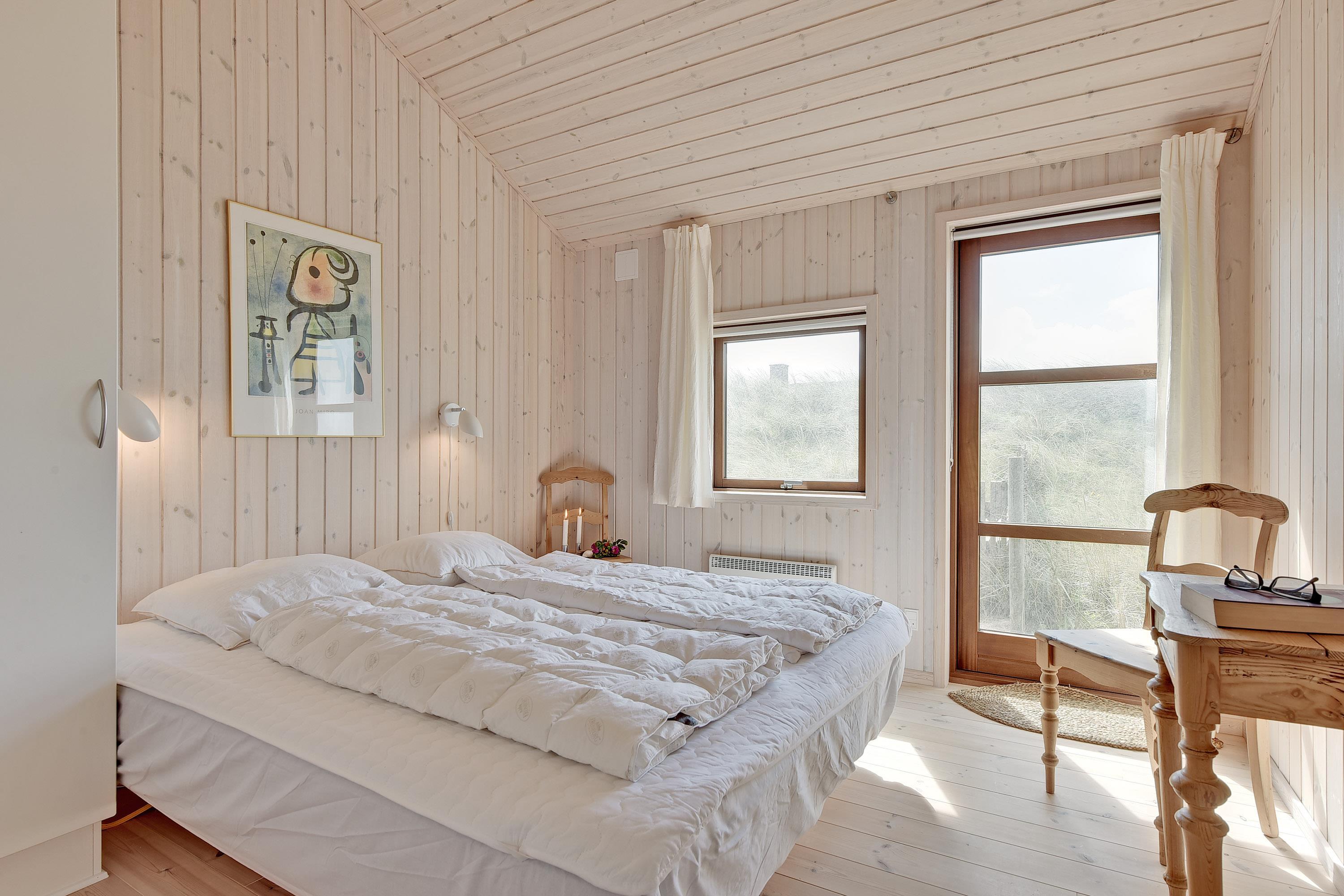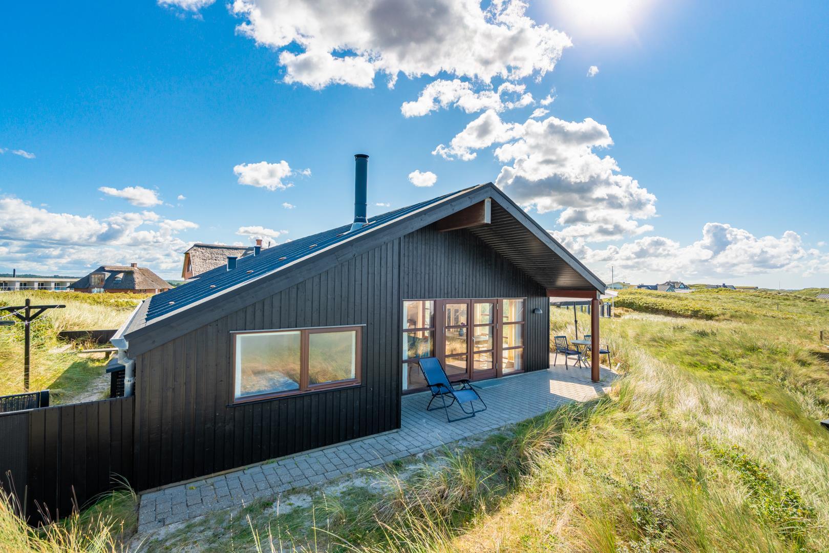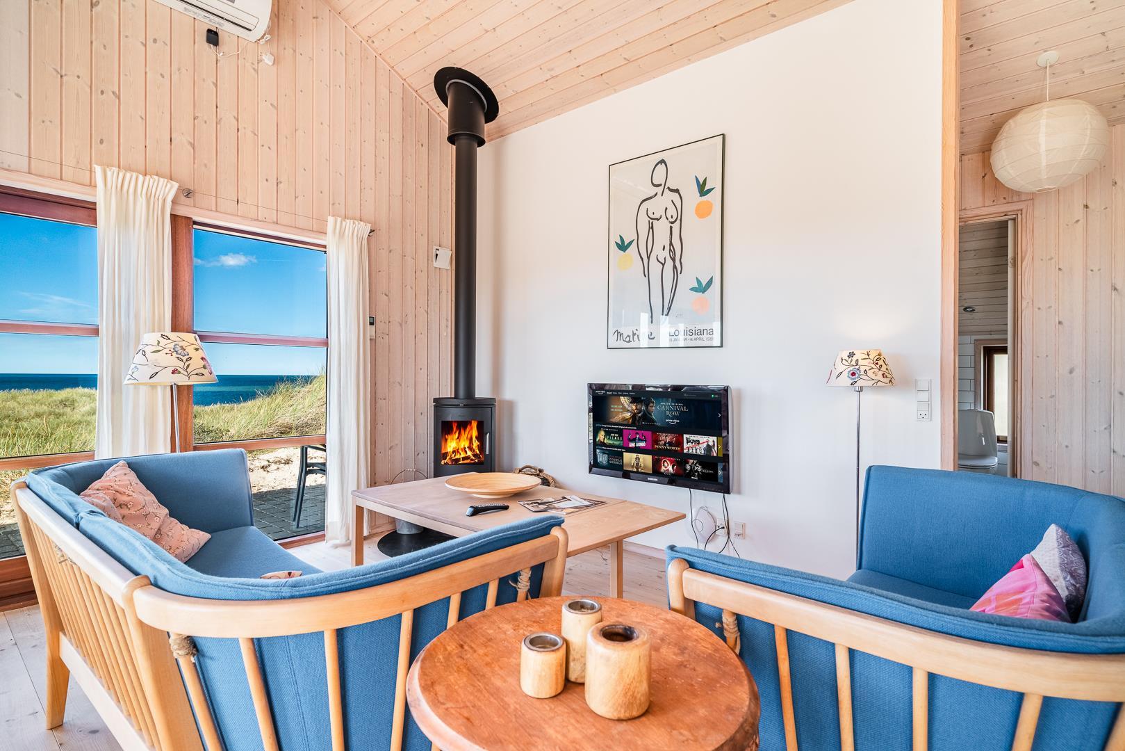 PANORAMUDSIGT. På en af Hennes bedst beliggende grunde, med direkte panorama udsigt over det storslåede Vesterhav og klitterne, tilbydes dette nyere træhus til udlejning. Huset ligger med kun 50 m til stranden, et stenkast fra vandet. Her er flere dejlige terrasser, hvoraf den ene er overdækket. Indendørs er der 4 soverum, hvorfra der fra 3 soverum er udgang. Pæn og hyggelig stue med stort vinduesparti med storslået udsigt over de marehalm beklædte klitter. Lyst køkken med opvaskemaskine og separat fryser på ca. 50 liter. Huset er inddelt i 2 afdelinger med 2 soverum og badeværelse i hver afdeling, det ene badeværelse har spa og sauna. Begge badeværelser er med gulvvarme. Der er TV såvel i stuen som i et soverum. Bryggers med adgang fra entreen med vaskemaskine og tørretumbler. Varmepumpe, som er miljøvenlig og strømbesparende, derudover hjælper brændeovn med at holde varmen på de kølige dage. Huset udlejes uden hund og rygning. Naturligvis er der gratis WIFI. Et pænt hus på en fantastisk, unik og enestående grund charmerende på alle årstider, hvad enten det er når Vesterhavet om sommeren viser sig fra sin pæneste side, eller det er om vinteren, hvor Vesterhavet viser tænder. Huset egner sig ikke for gangbesværede. Da huset ligger i klitterne, er der kun mulighed for parkering for 2 biler ved huset. Depotrum privat.