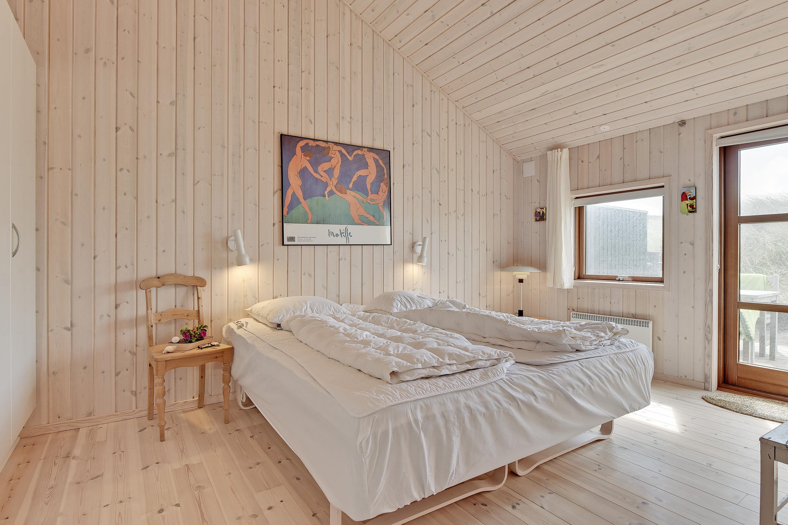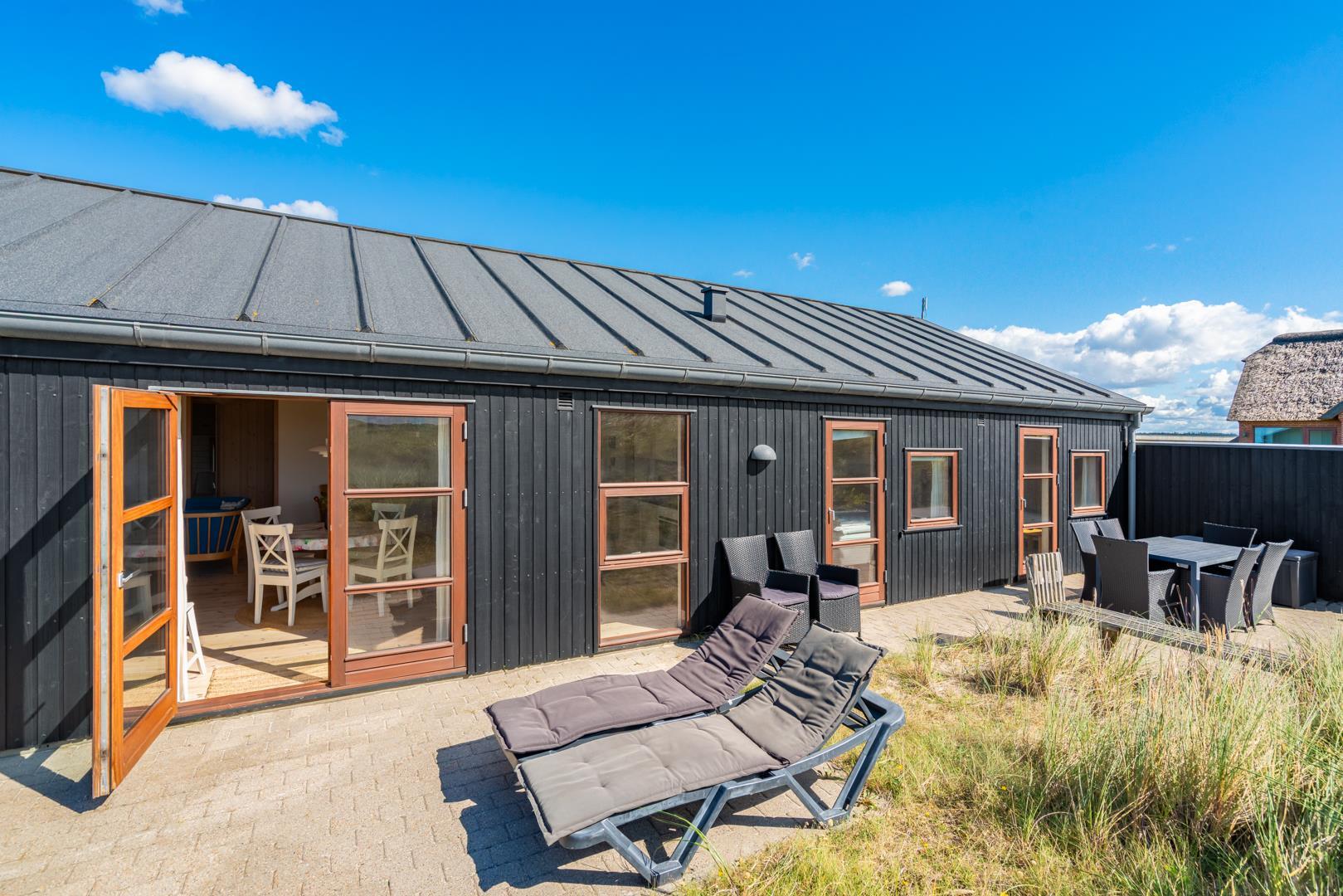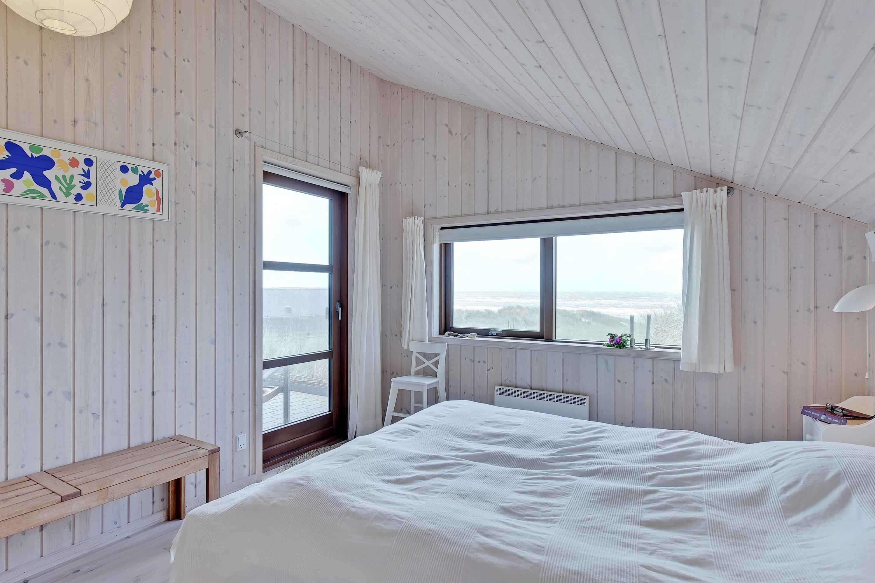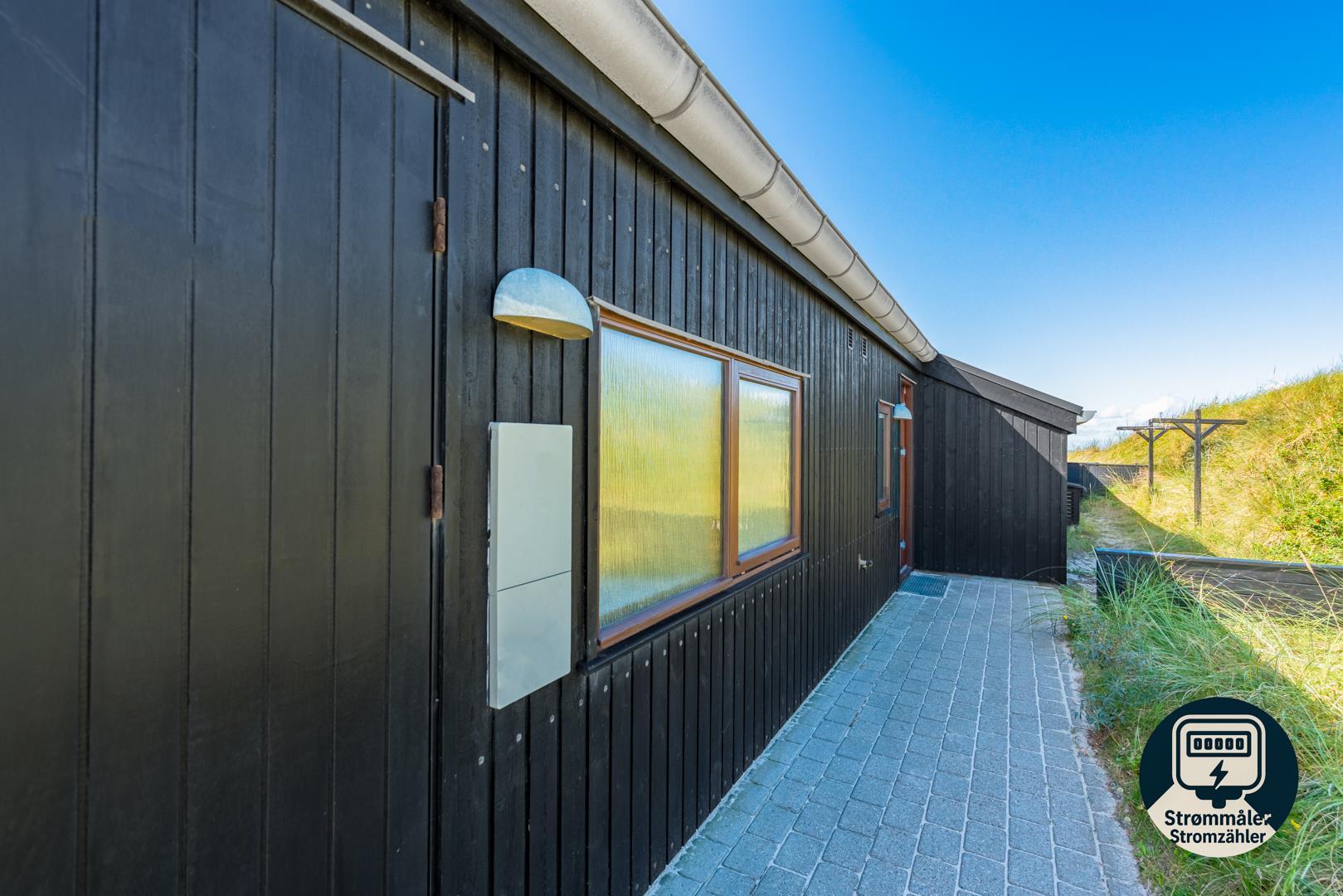 PANORAMUDSIGT. På en af Hennes bedst beliggende grunde, med direkte panorama udsigt over det storslåede Vesterhav og klitterne, tilbydes dette nyere træhus til udlejning. Huset ligger med kun 50 m til stranden, et stenkast fra vandet. Her er flere dejlige terrasser, hvoraf den ene er overdækket. Indendørs er der 4 soverum, hvorfra der fra 3 soverum er udgang. Pæn og hyggelig stue med stort vinduesparti med storslået udsigt over de marehalm beklædte klitter. Lyst køkken med opvaskemaskine og separat fryser på ca. 50 liter. Huset er inddelt i 2 afdelinger med 2 soverum og badeværelse i hver afdeling, det ene badeværelse har spa og sauna. Begge badeværelser er med gulvvarme. Der er TV såvel i stuen som i et soverum. Bryggers med adgang fra entreen med vaskemaskine og tørretumbler. Varmepumpe, som er miljøvenlig og strømbesparende, derudover hjælper brændeovn med at holde varmen på de kølige dage. Huset udlejes uden hund og rygning. Naturligvis er der gratis WIFI. Et pænt hus på en fantastisk, unik og enestående grund charmerende på alle årstider, hvad enten det er når Vesterhavet om sommeren viser sig fra sin pæneste side, eller det er om vinteren, hvor Vesterhavet viser tænder. Huset egner sig ikke for gangbesværede. Da huset ligger i klitterne, er der kun mulighed for parkering for 2 biler ved huset. Depotrum privat.