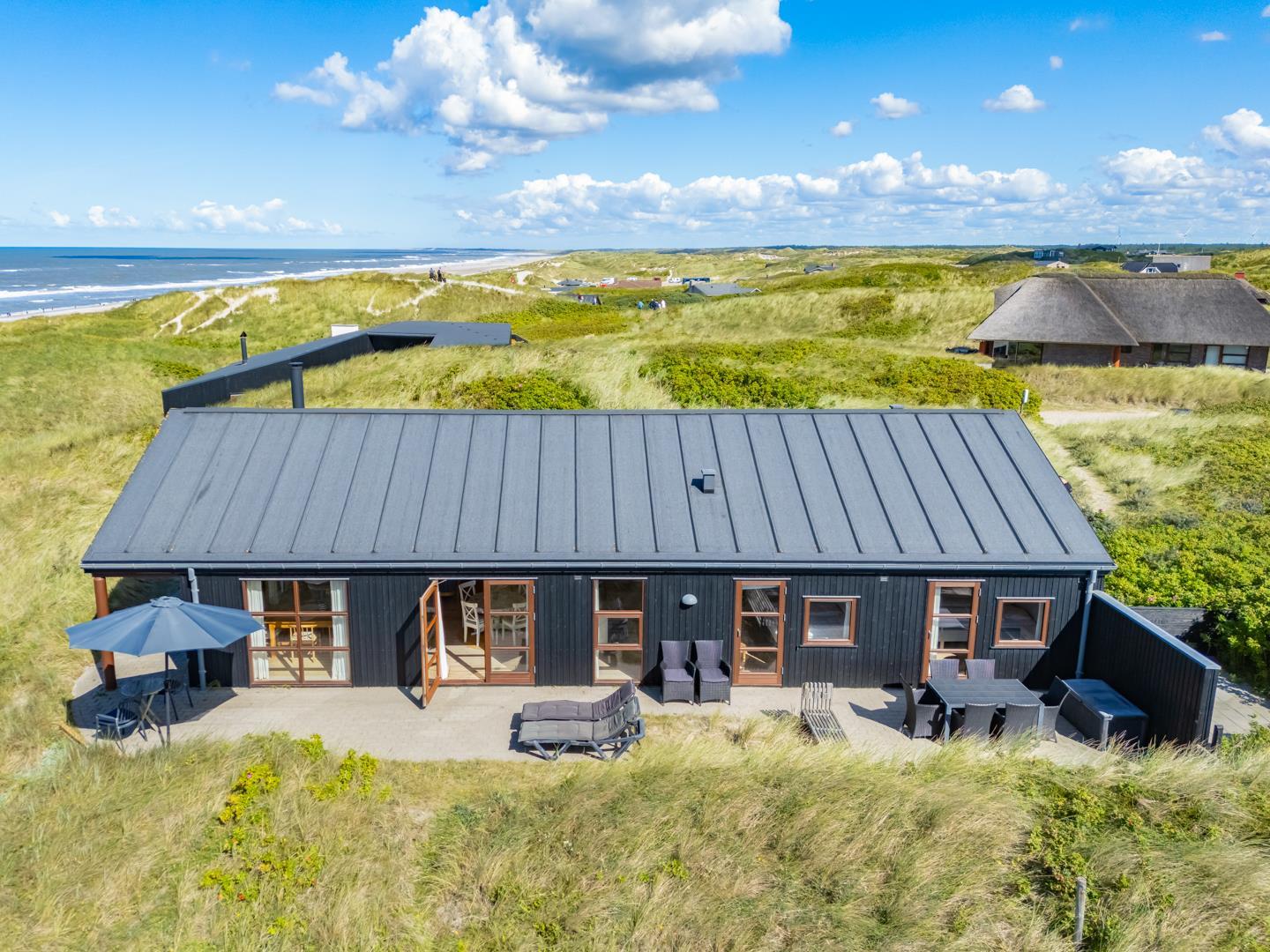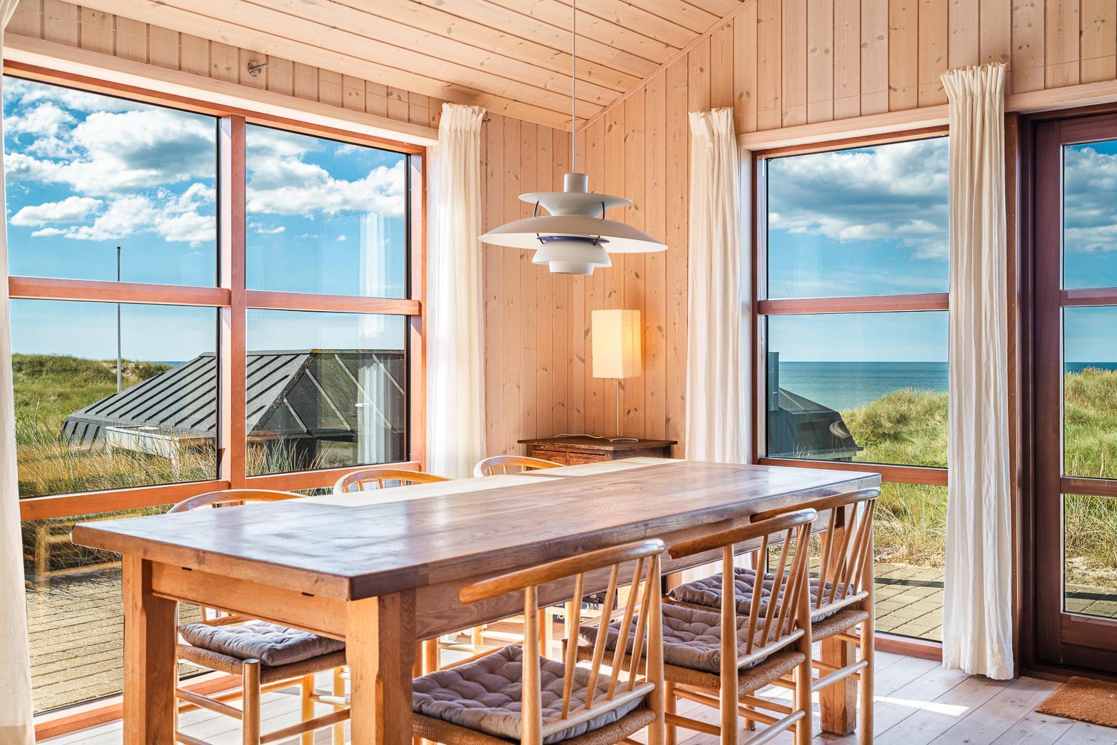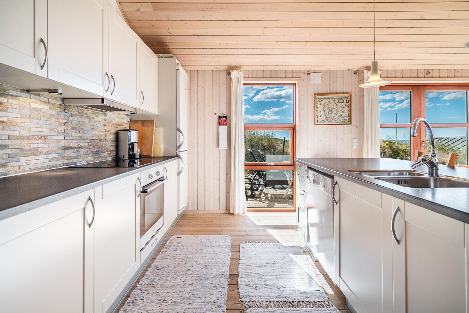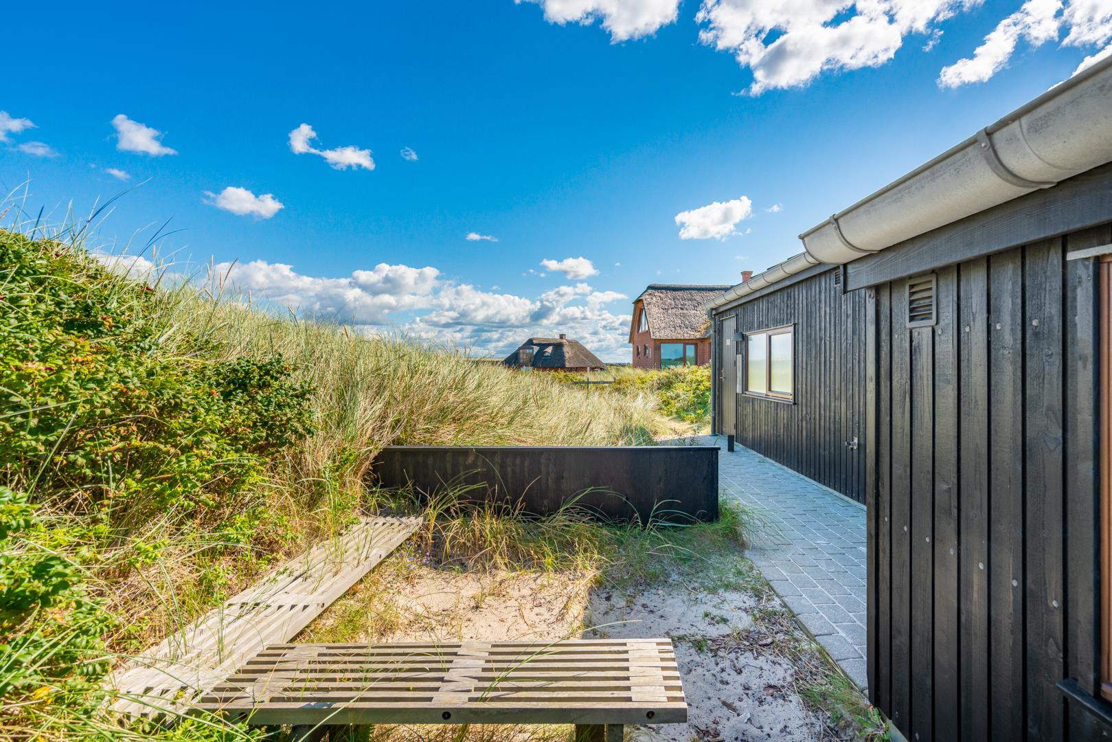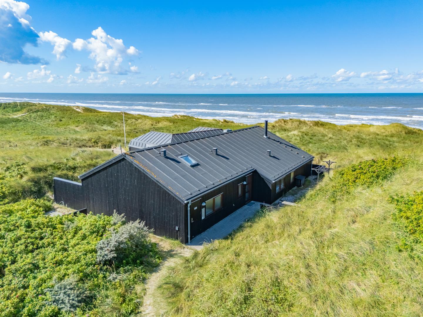 PANORAMUDSIGT. På en af Hennes bedst beliggende grunde, med direkte panorama udsigt over det storslåede Vesterhav og klitterne, tilbydes dette nyere træhus til udlejning. Huset ligger med kun 50 m til stranden, et stenkast fra vandet. Her er flere dejlige terrasser, hvoraf den ene er overdækket. Indendørs er der 4 soverum, hvorfra der fra 3 soverum er udgang. Pæn og hyggelig stue med stort vinduesparti med storslået udsigt over de marehalm beklædte klitter. Lyst køkken med opvaskemaskine og separat fryser på ca. 50 liter. Huset er inddelt i 2 afdelinger med 2 soverum og badeværelse i hver afdeling, det ene badeværelse har spa og sauna. Begge badeværelser er med gulvvarme. Der er TV såvel i stuen som i et soverum. Bryggers med adgang fra entreen med vaskemaskine og tørretumbler. Varmepumpe, som er miljøvenlig og strømbesparende, derudover hjælper brændeovn med at holde varmen på de kølige dage. Huset udlejes uden hund og rygning. Naturligvis er der gratis WIFI. Et pænt hus på en fantastisk, unik og enestående grund charmerende på alle årstider, hvad enten det er når Vesterhavet om sommeren viser sig fra sin pæneste side, eller det er om vinteren, hvor Vesterhavet viser tænder. Huset egner sig ikke for gangbesværede. Da huset ligger i klitterne, er der kun mulighed for parkering for 2 biler ved huset. Depotrum privat.