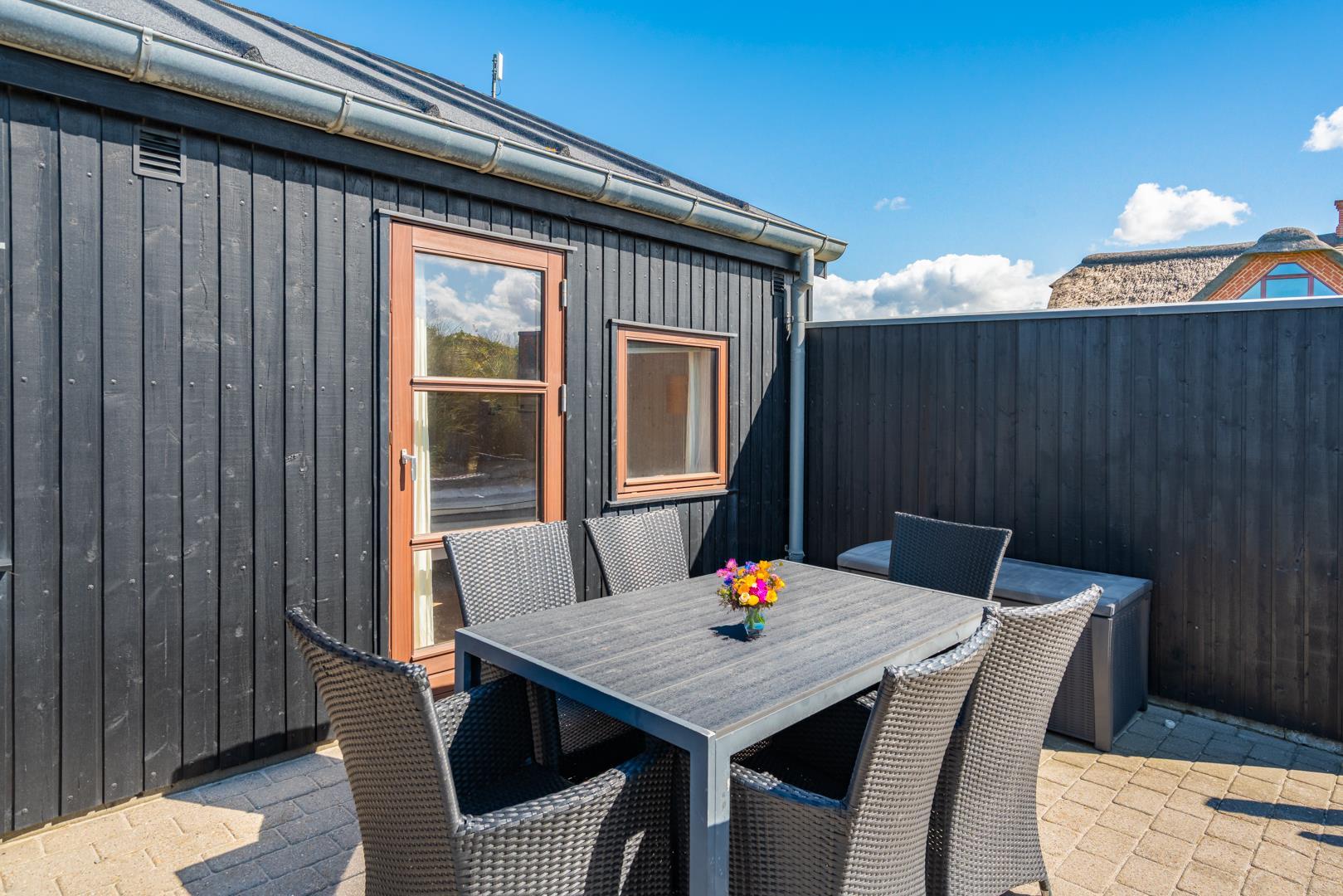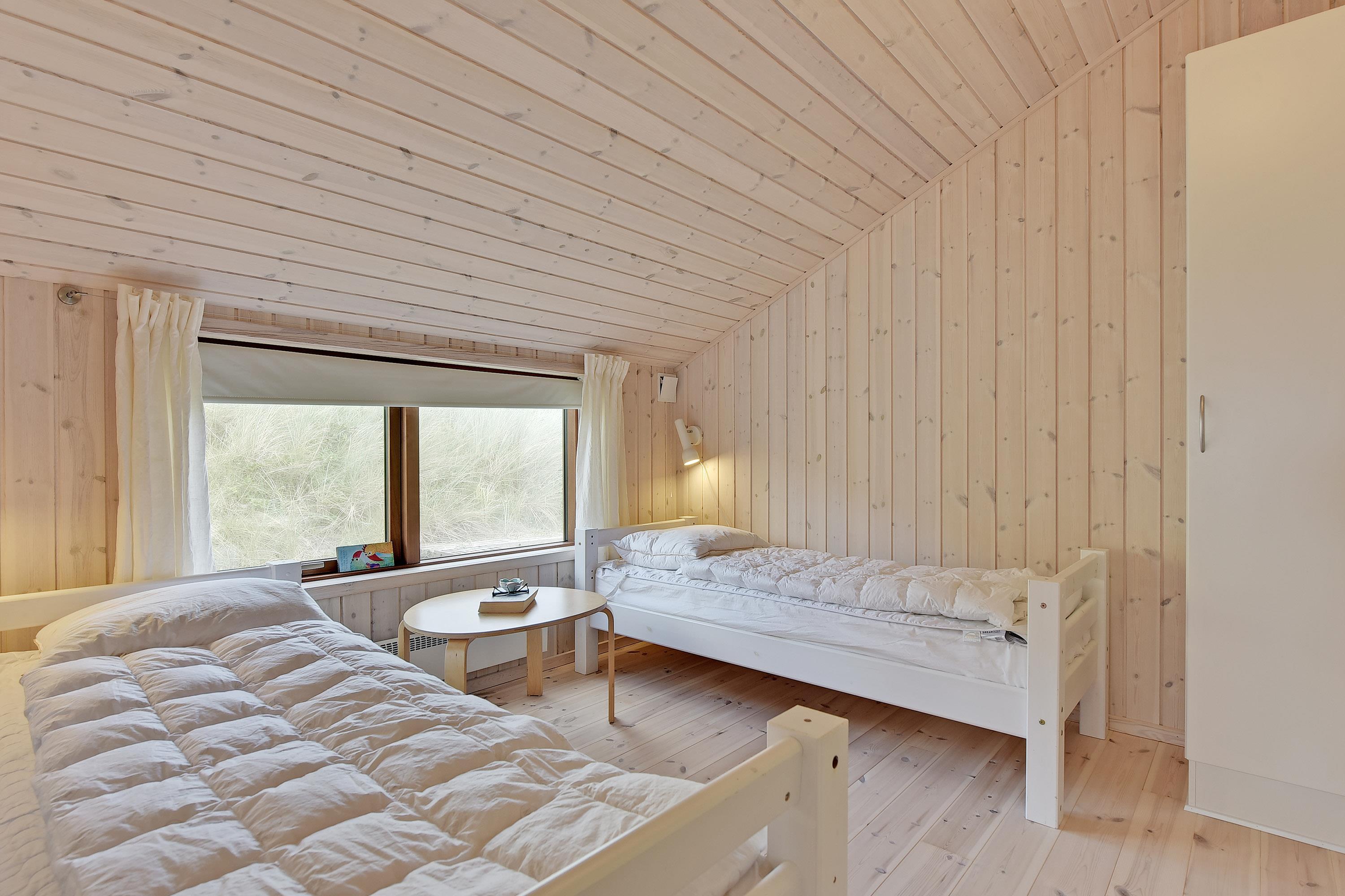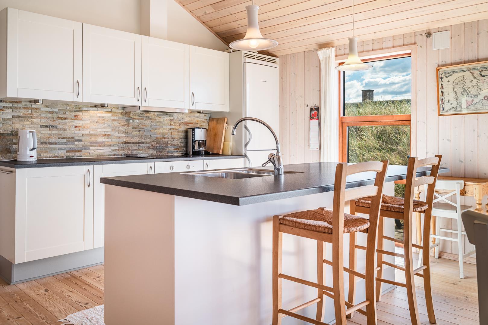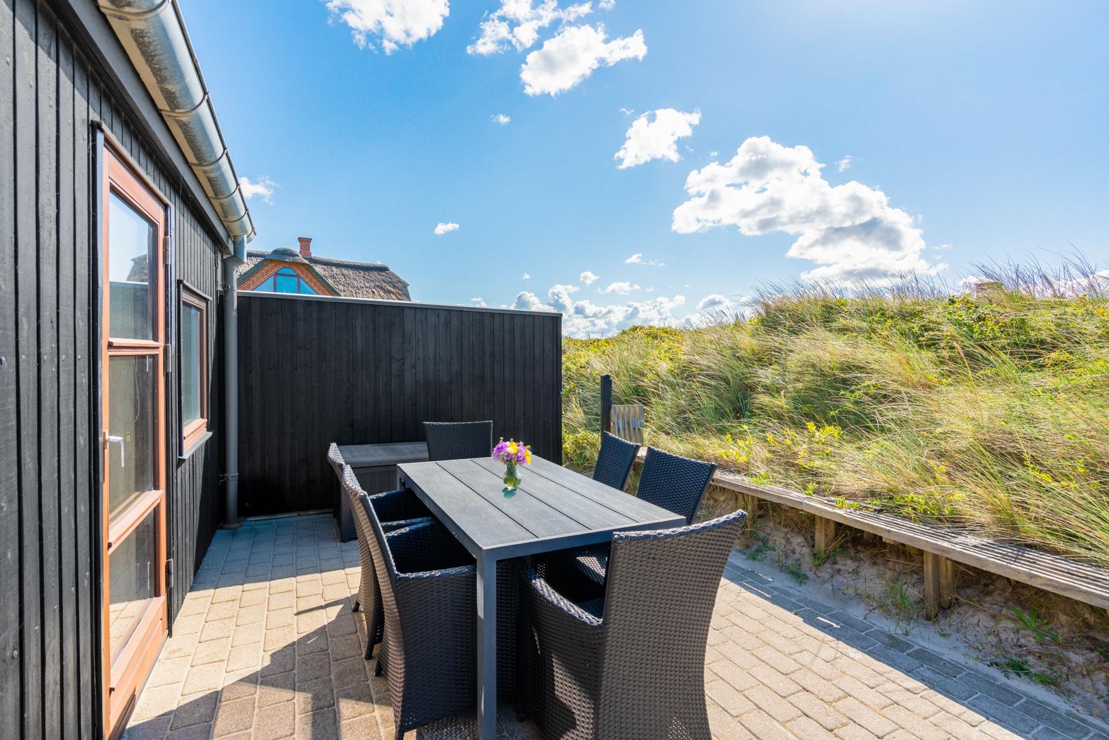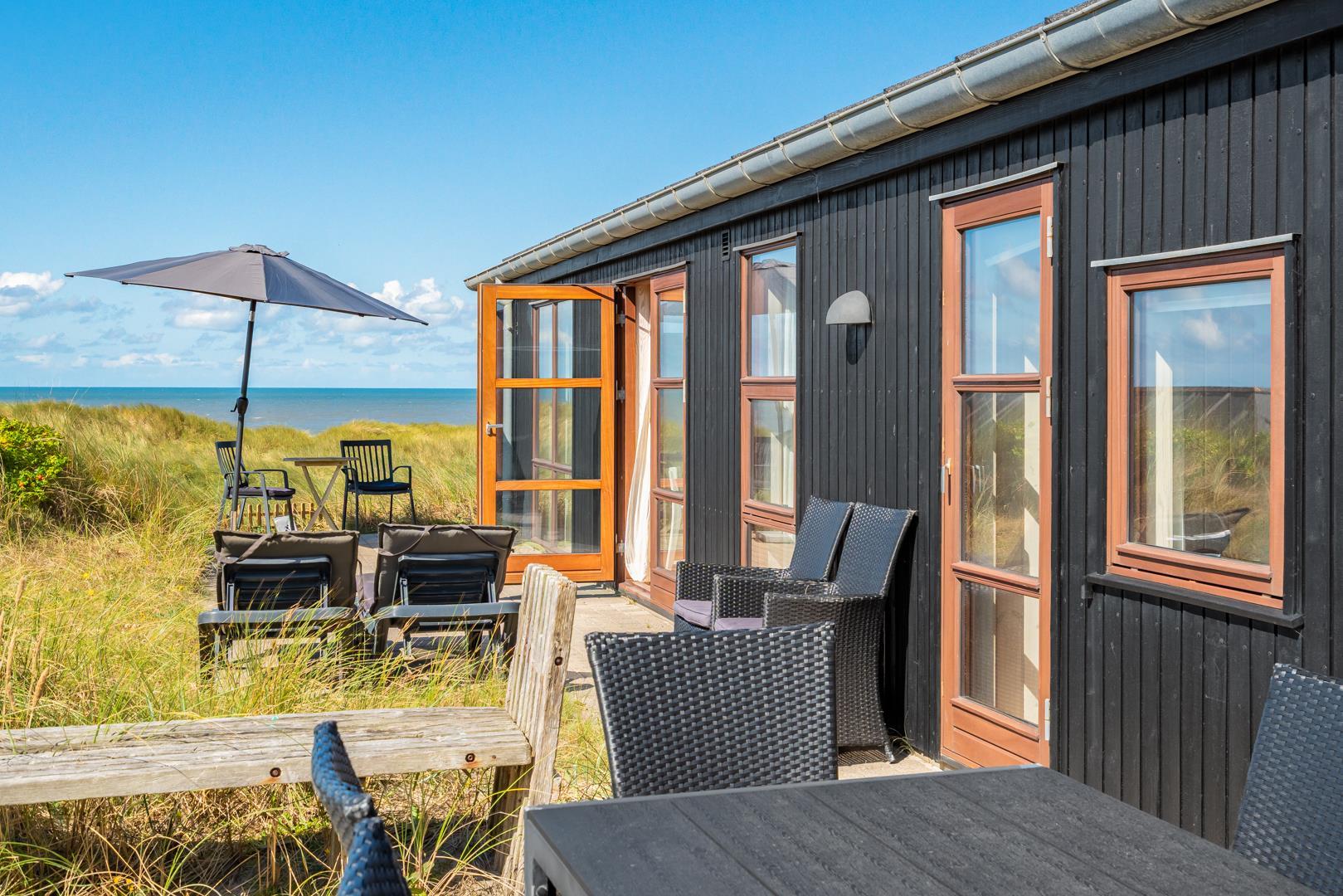 PANORAMUDSIGT. På en af Hennes bedst beliggende grunde, med direkte panorama udsigt over det storslåede Vesterhav og klitterne, tilbydes dette nyere træhus til udlejning. Huset ligger med kun 50 m til stranden, et stenkast fra vandet. Her er flere dejlige terrasser, hvoraf den ene er overdækket. Indendørs er der 4 soverum, hvorfra der fra 3 soverum er udgang. Pæn og hyggelig stue med stort vinduesparti med storslået udsigt over de marehalm beklædte klitter. Lyst køkken med opvaskemaskine og separat fryser på ca. 50 liter. Huset er inddelt i 2 afdelinger med 2 soverum og badeværelse i hver afdeling, det ene badeværelse har spa og sauna. Begge badeværelser er med gulvvarme. Der er TV såvel i stuen som i et soverum. Bryggers med adgang fra entreen med vaskemaskine og tørretumbler. Varmepumpe, som er miljøvenlig og strømbesparende, derudover hjælper brændeovn med at holde varmen på de kølige dage. Huset udlejes uden hund og rygning. Naturligvis er der gratis WIFI. Et pænt hus på en fantastisk, unik og enestående grund charmerende på alle årstider, hvad enten det er når Vesterhavet om sommeren viser sig fra sin pæneste side, eller det er om vinteren, hvor Vesterhavet viser tænder. Huset egner sig ikke for gangbesværede. Da huset ligger i klitterne, er der kun mulighed for parkering for 2 biler ved huset. Depotrum privat.