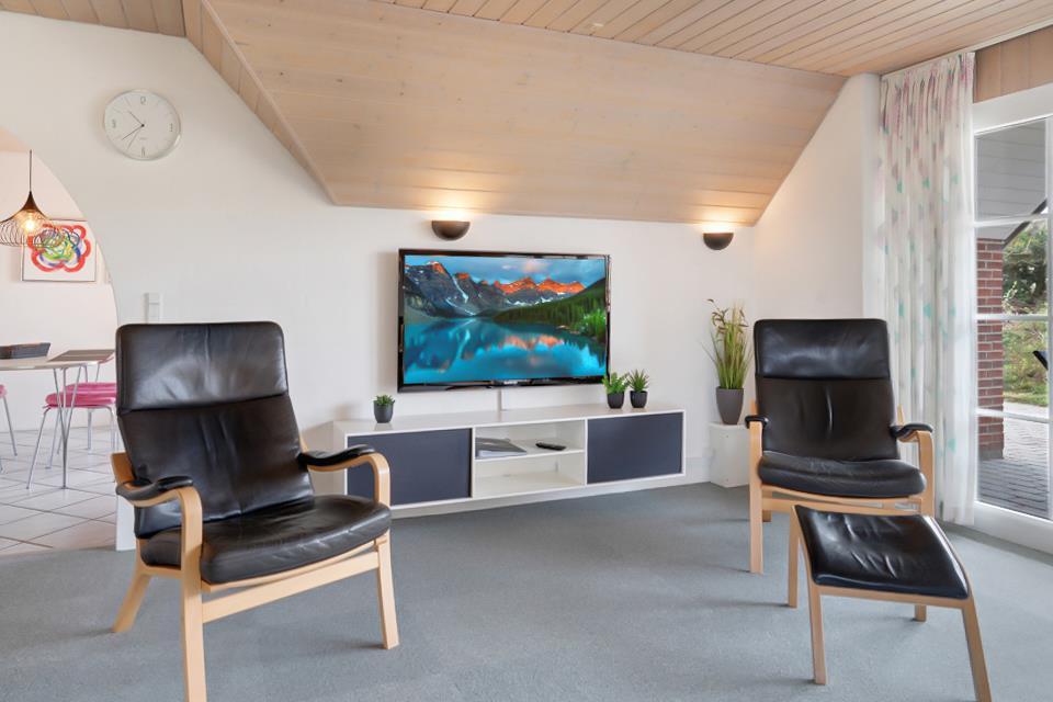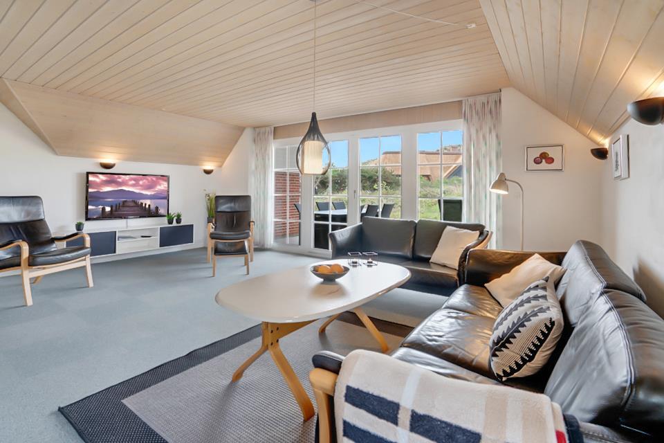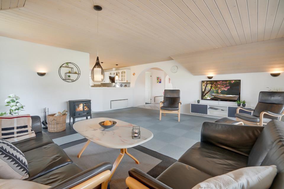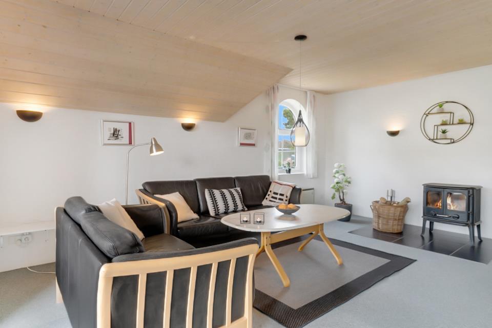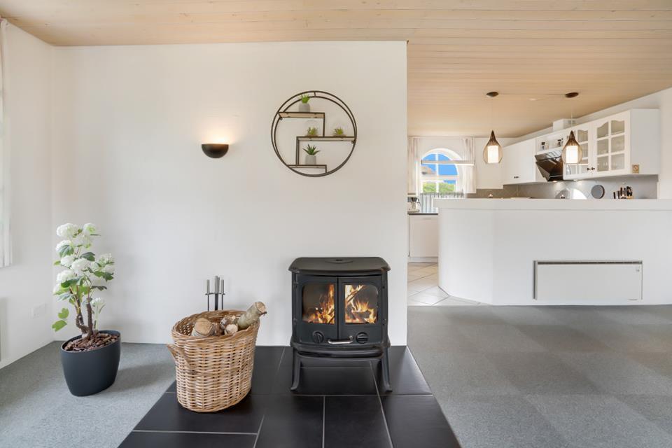 Lys stue med brændeovn – hygge til din ferie ved Nordsøen