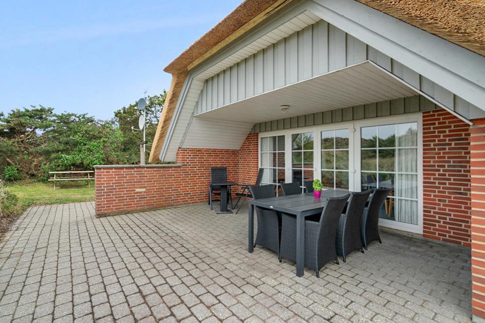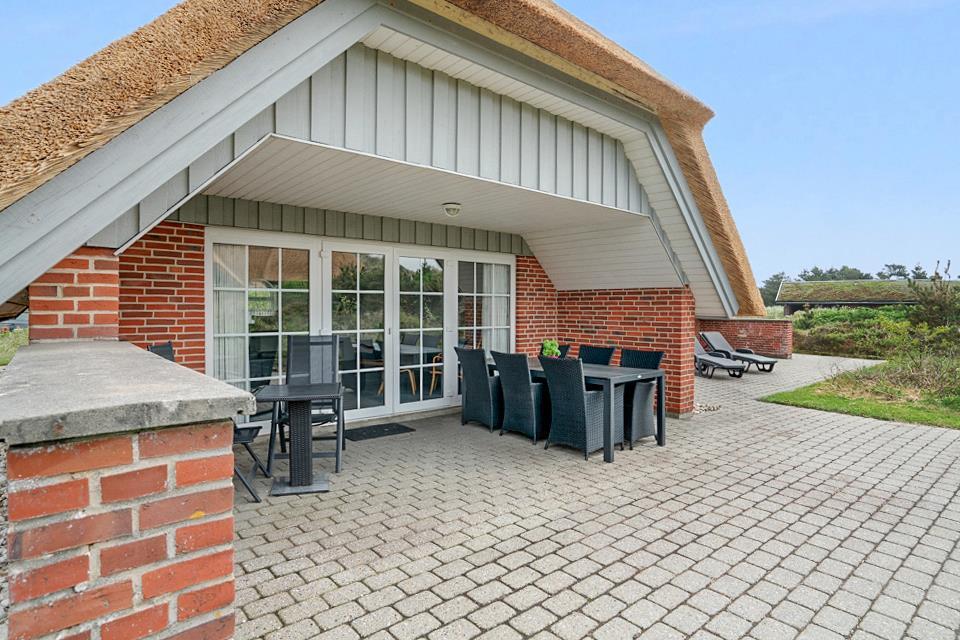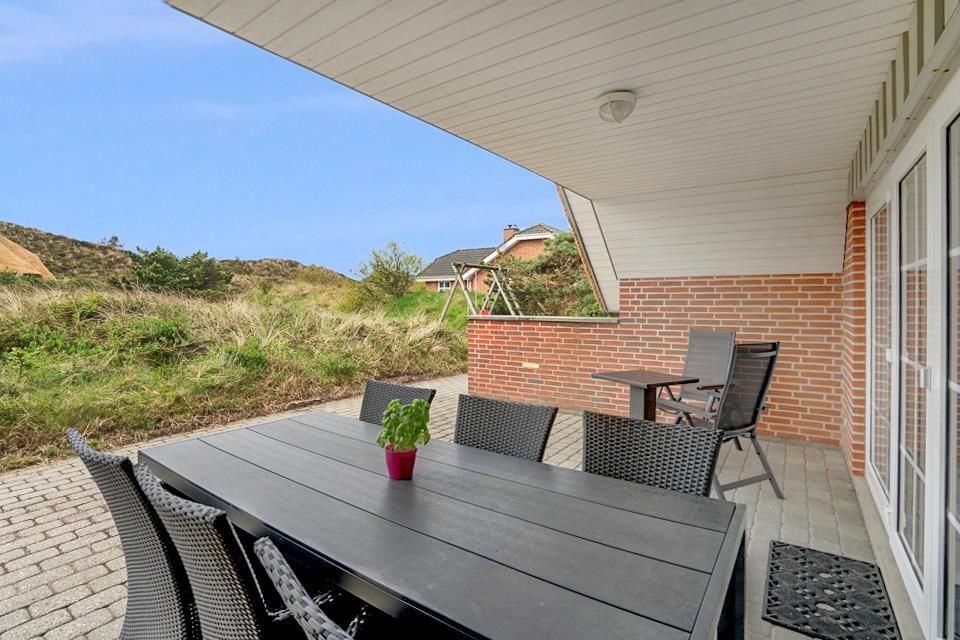 Udendørsområdet på feriehuset på Porsevej 34 i Henne Strand giver jer de bedste rammer for afslappede feriedage på den danske vestkyst. På den overdækkede terrasse kan I nyde den friske havluft fra morgenstunden eller slutte dagen af med en hyggelig middag. Den beskyttede beliggenhed gør terrassen behagelig at bruge – selv når det blæser lidt. Udsigten til den smukke natur omkring Henne Strand skaber med det samme ro og ægte feriestemning.