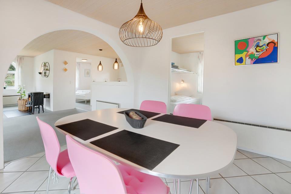 Den rummelige stue med brændeovn og gulvvarme skaber en hyggelig atmosfære – perfekt til afslapning efter strandture eller udflugter. Store vinduer lukker masser af lys ind og giver en åben og indbydende rumfornemmelse.