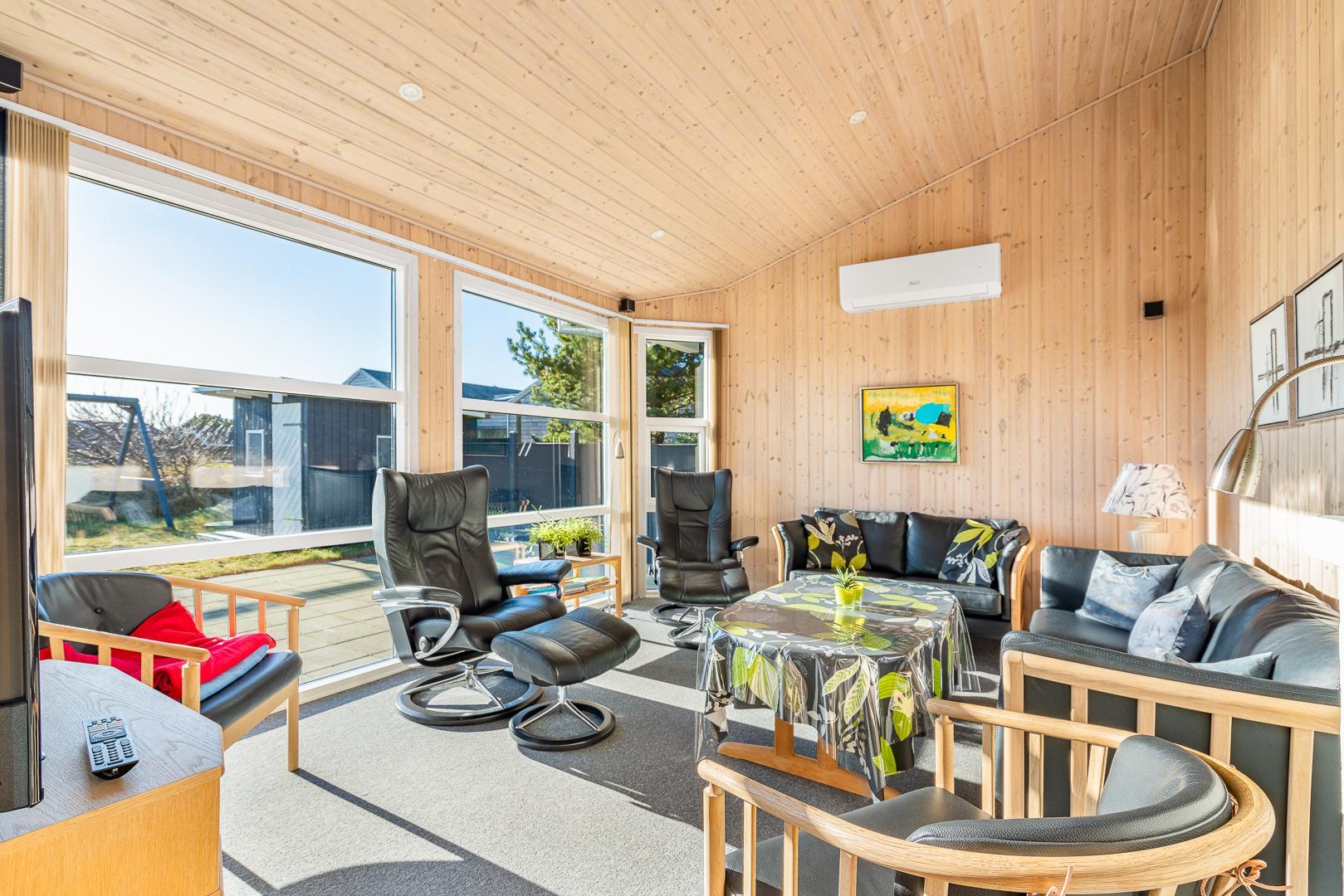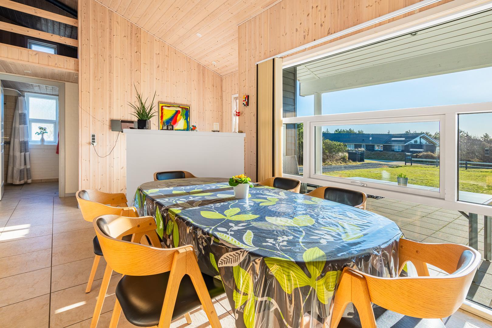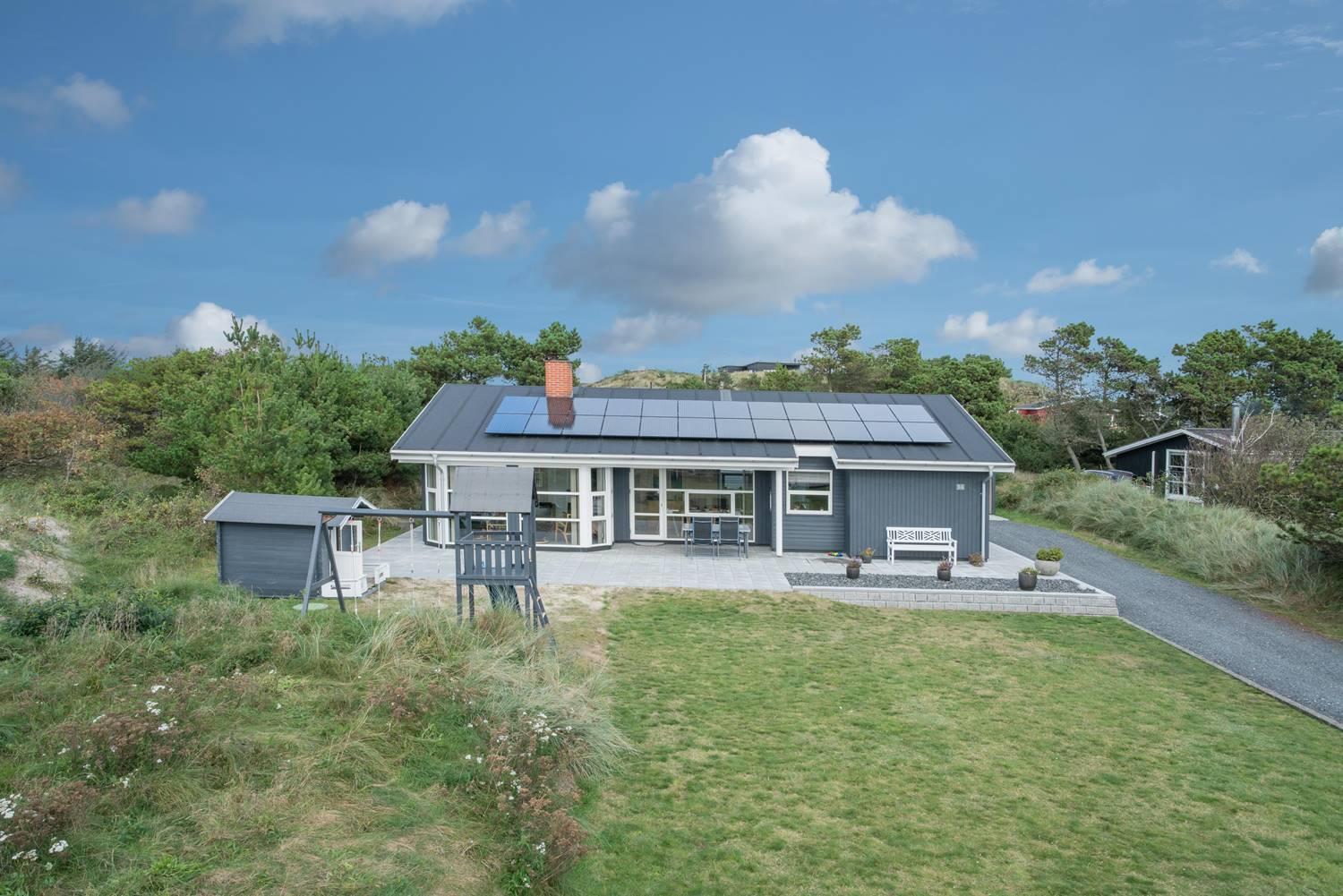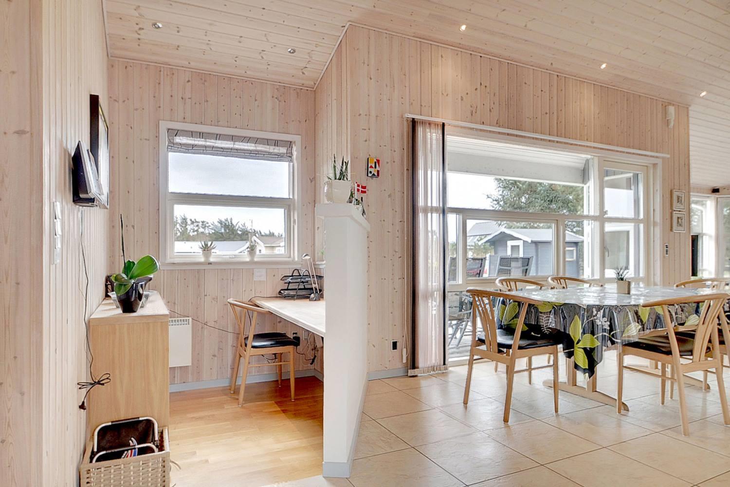 På en skøn naturgrund i roligt område - tæt på by og hav - ligger dette velholdte sommerhus med 4 værelser. Alle senge er kvalitets boxmadrasser. Der er 2 gode badeværelser med bruser og gulvvarme, det ene råder over stor sauna. Skøn, lys spisestue i åben forbindelse med veludstyret køkken, hvorfra den flotte udsigt over området kan nydes. Der er et lille kontor med både Wi-Fi og kablet net forbindelse. Hems med TV. Huset har endvidere et ventilationsanlæg, der sørger for et godt indeklima samt IHC (Flex-Control). Hoveddøren åbnes med en kode, som udleveres af Købmand Hansens Feriehusudlejning. Bagved huset er der dejlig og ugenert solterrasse. Huset vedligeholdes løbende for at sikre gæsterne en god ferie.