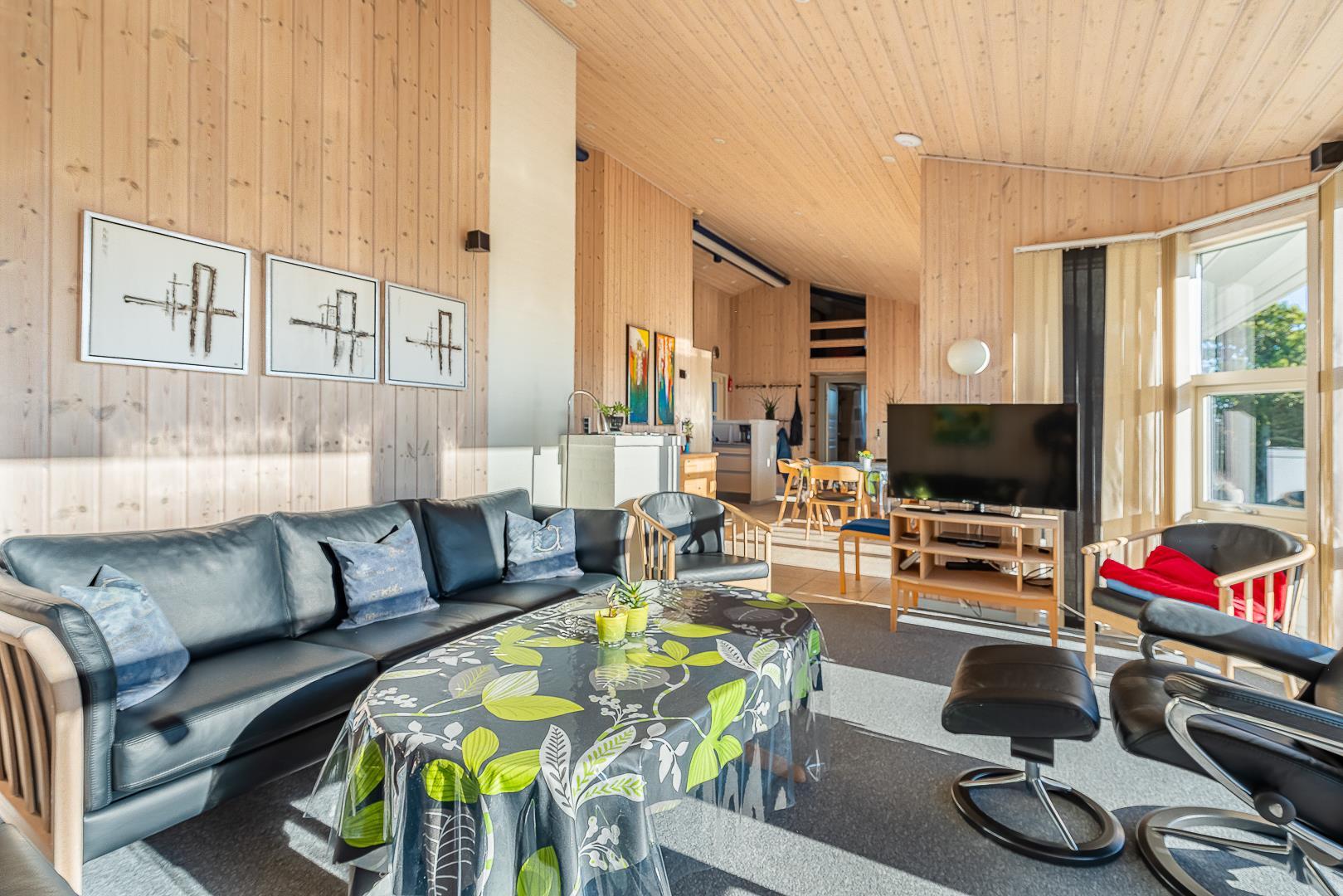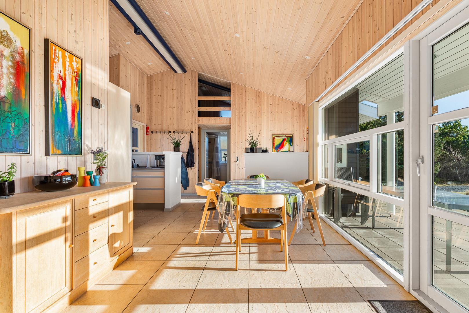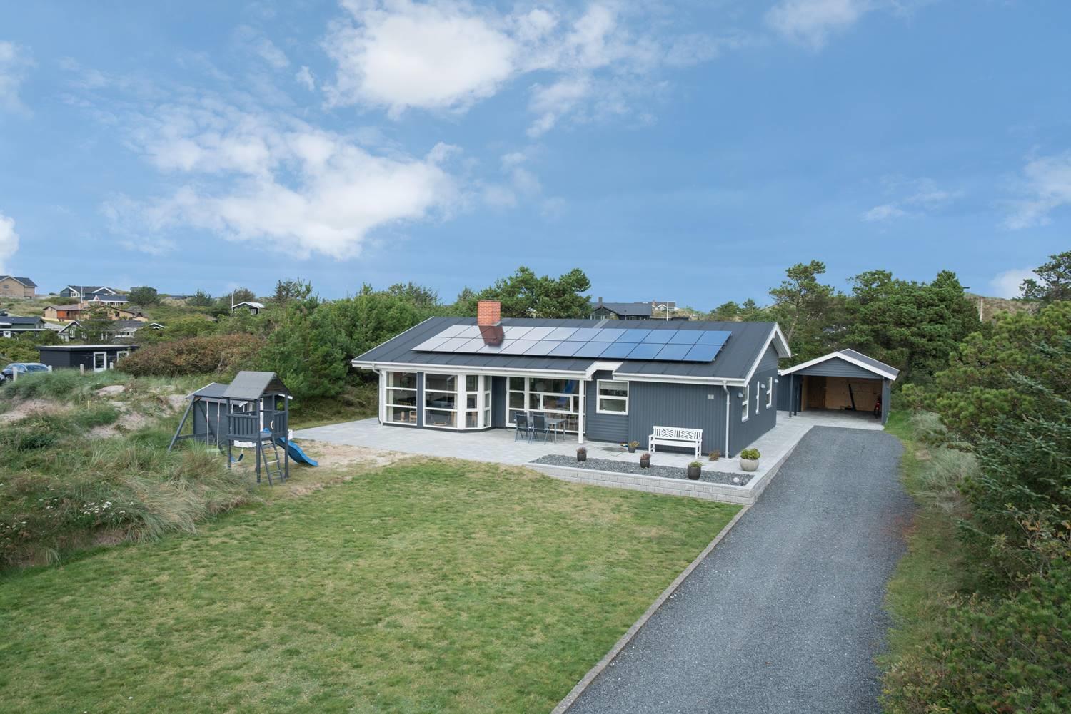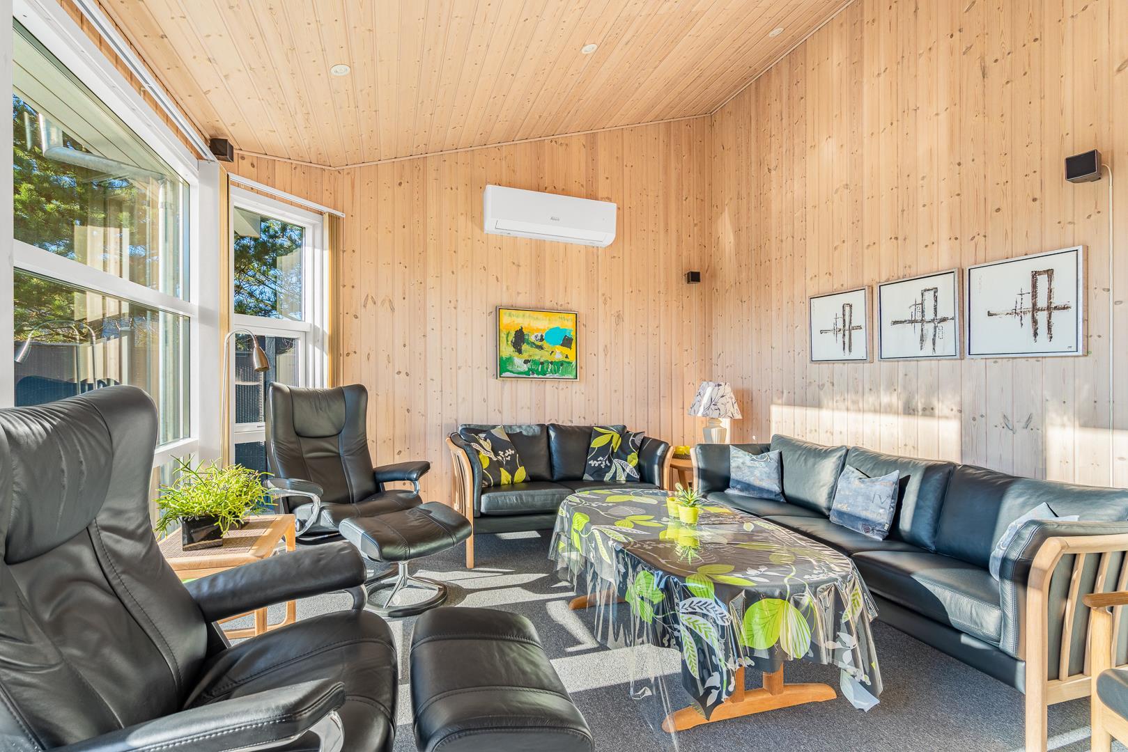 På en skøn naturgrund i roligt område - tæt på by og hav - ligger dette velholdte sommerhus med 4 værelser. Alle senge er kvalitets boxmadrasser. Der er 2 gode badeværelser med bruser og gulvvarme, det ene råder over stor sauna. Skøn, lys spisestue i åben forbindelse med veludstyret køkken, hvorfra den flotte udsigt over området kan nydes. Der er et lille kontor med både Wi-Fi og kablet net forbindelse. Hems med TV. Huset har endvidere et ventilationsanlæg, der sørger for et godt indeklima samt IHC (Flex-Control). Hoveddøren åbnes med en kode, som udleveres af Købmand Hansens Feriehusudlejning. Bagved huset er der dejlig og ugenert solterrasse. Huset vedligeholdes løbende for at sikre gæsterne en god ferie.
