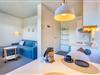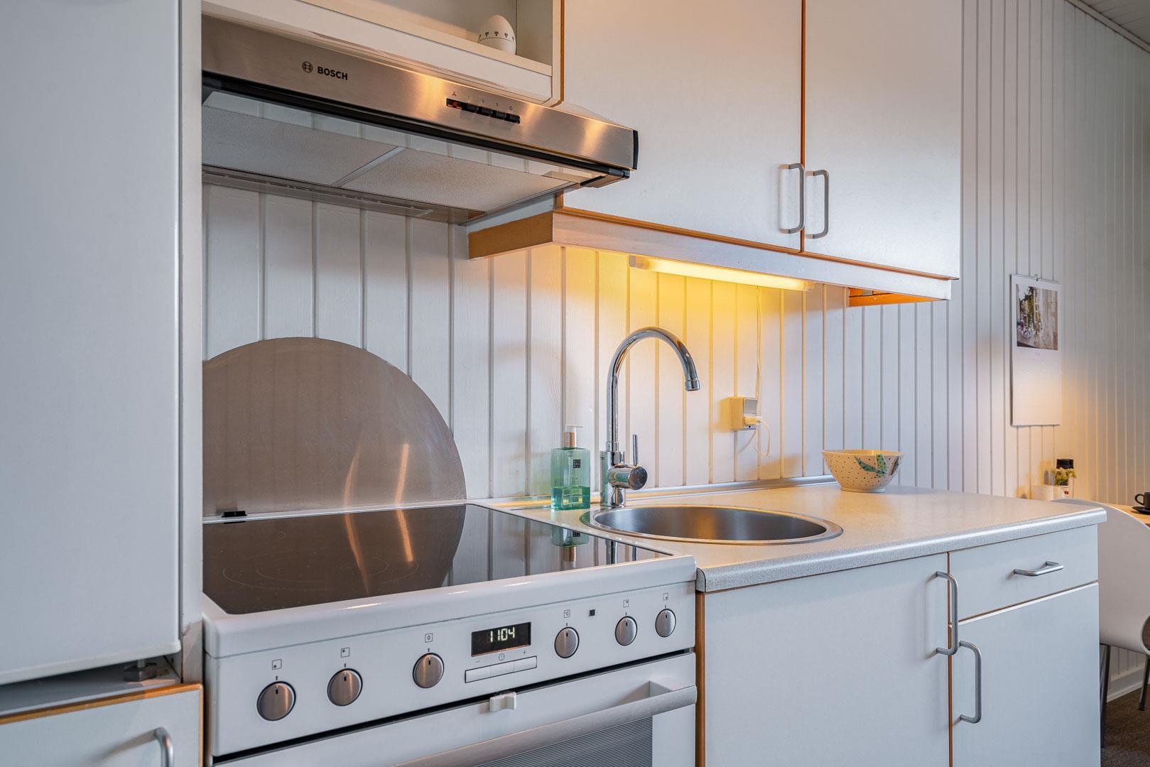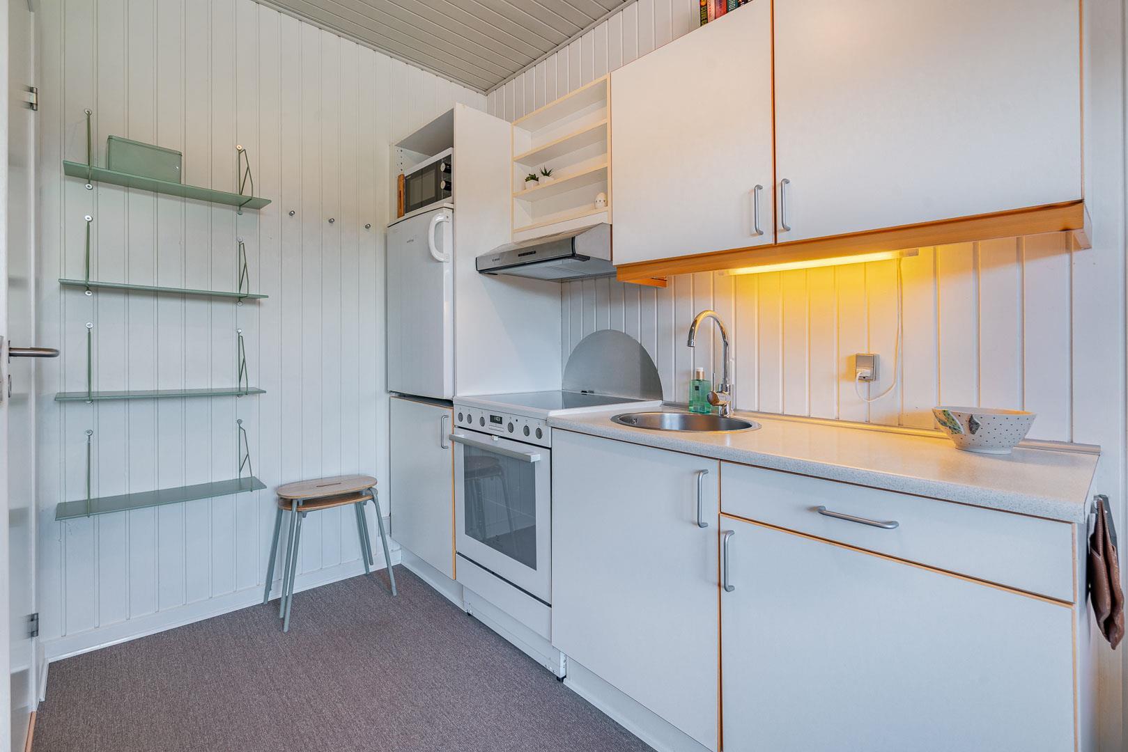 Lejligheden er 35 m2, fuldt udstyret og byder på et moderne køkken med alt, hvad I behøver til at lave lækre måltider, inklusive opdateret ovn, mikrobølgeovn og køle/fryseskab. Det renoverede badeværelse (2022) har gulvvarme og håndklædevarmer, som sikrer ekstra komfort efter en dag ved stranden.
