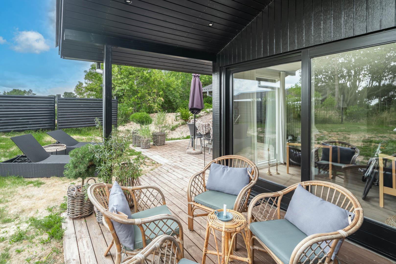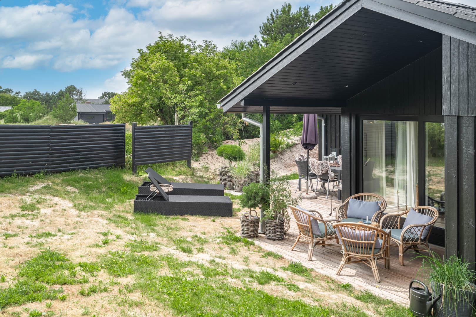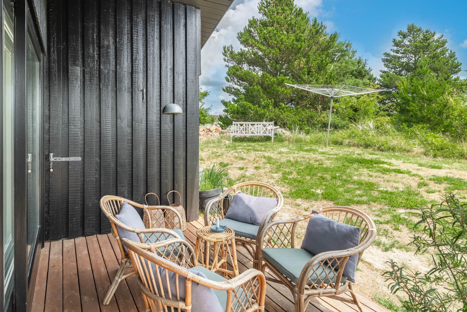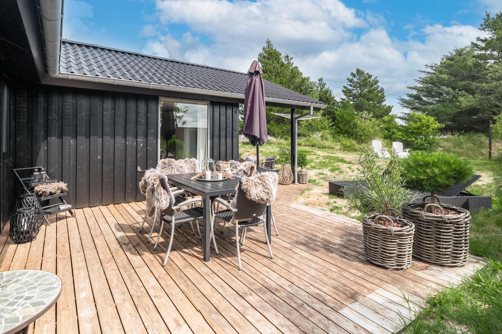 Fra stuen er der direkte adgang til en delvist overdækket terrasse, hvor morgenkaffen, frokosten eller aftensmaden kan nydes i læ for vinden, uanset vejret. Terrassen er indrettet med fokus på hygge og komfort, og her kan hele familien samles og nyde de stille sommeraftener, mens solen går ned over klitterne.