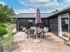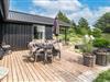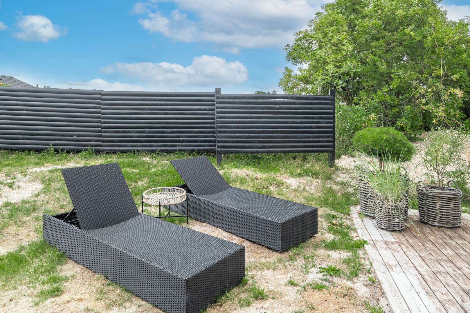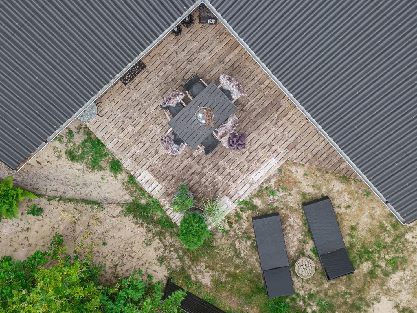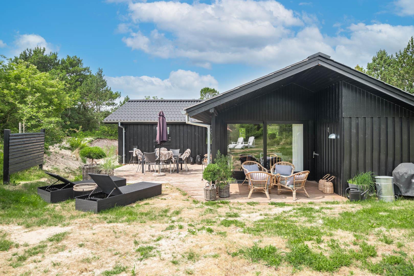 Fra stuen er der direkte adgang til en delvist overdækket terrasse, hvor morgenkaffen, frokosten eller aftensmaden kan nydes i læ for vinden, uanset vejret. Terrassen er indrettet med fokus på hygge og komfort, og her kan hele familien samles og nyde de stille sommeraftener, mens solen går ned over klitterne.