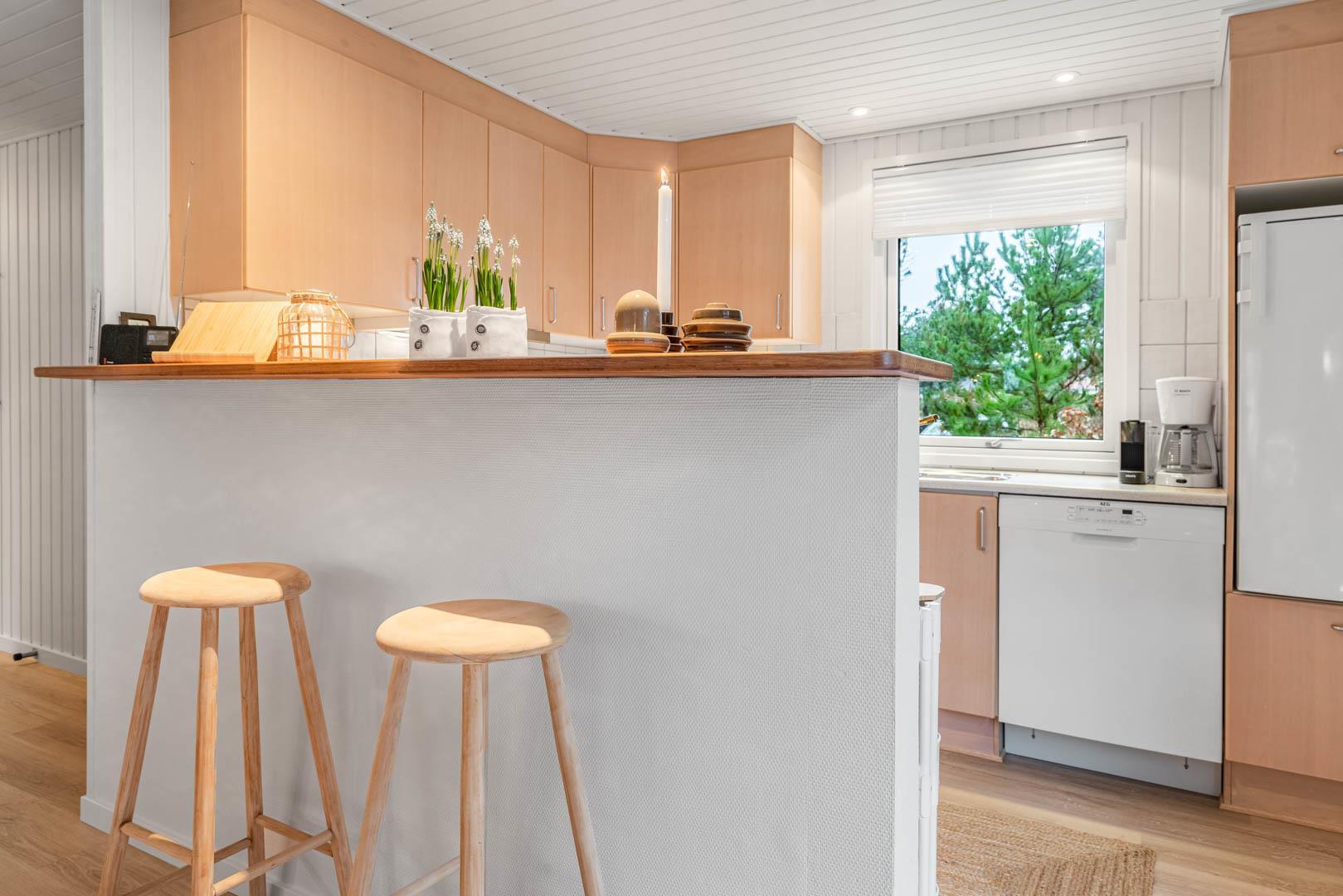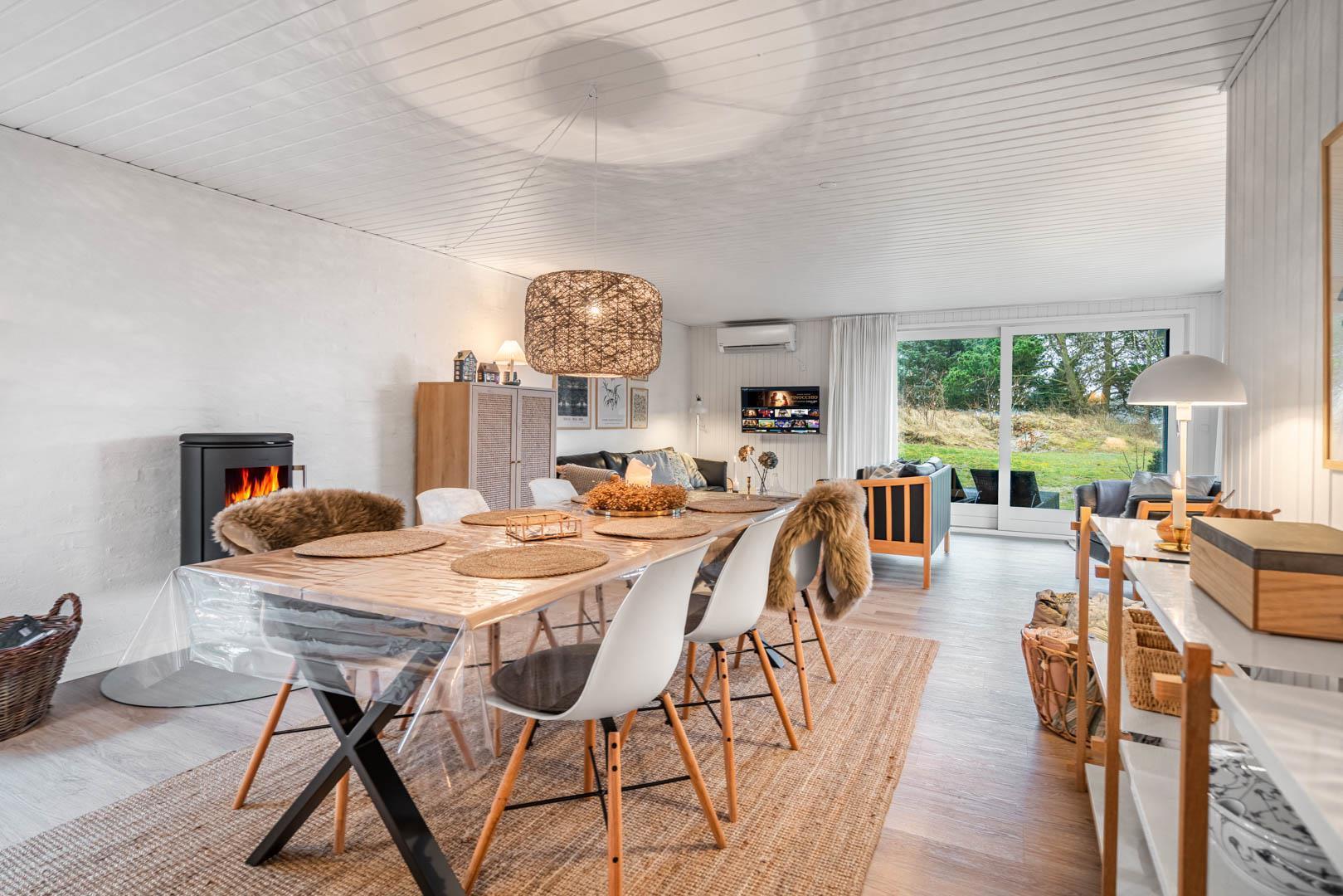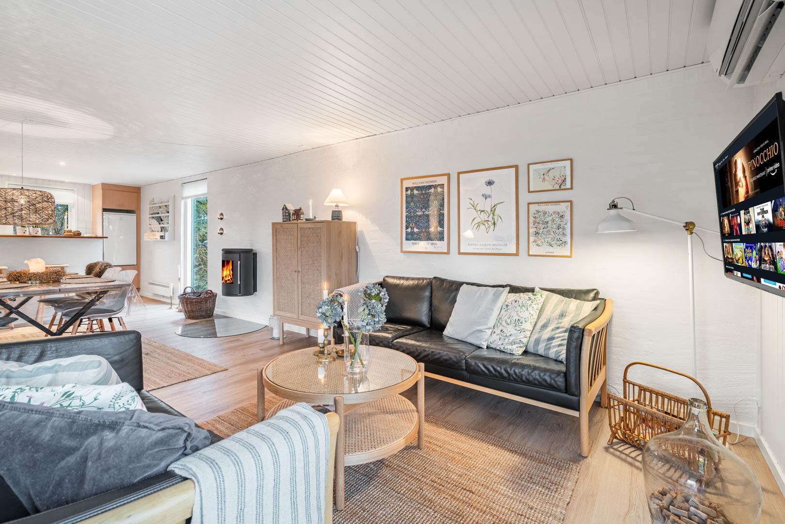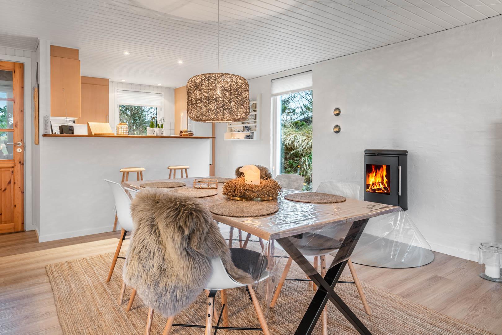 Indendørs byder sommerhuset på et skønt, åbent opholdsområde, hvor et veludstyret køkken står i åben forbindelse med en smukt indrettet stue. Her er komfortable og pæne møbler, brændeovn og en effektiv varmepumpe, som tilsammen skaber den perfekte stemning året rundt. Brændeovnen knitrer hyggeligt på de køligere aftener og varmer huset op, så du kan slappe af i en hjemlig og behagelig atmosfære. Sommerhuset er smagfuldt indrettet og skabt til, at du føler dig hjemme fra det øjeblik, du træder ind ad døren.