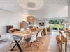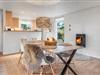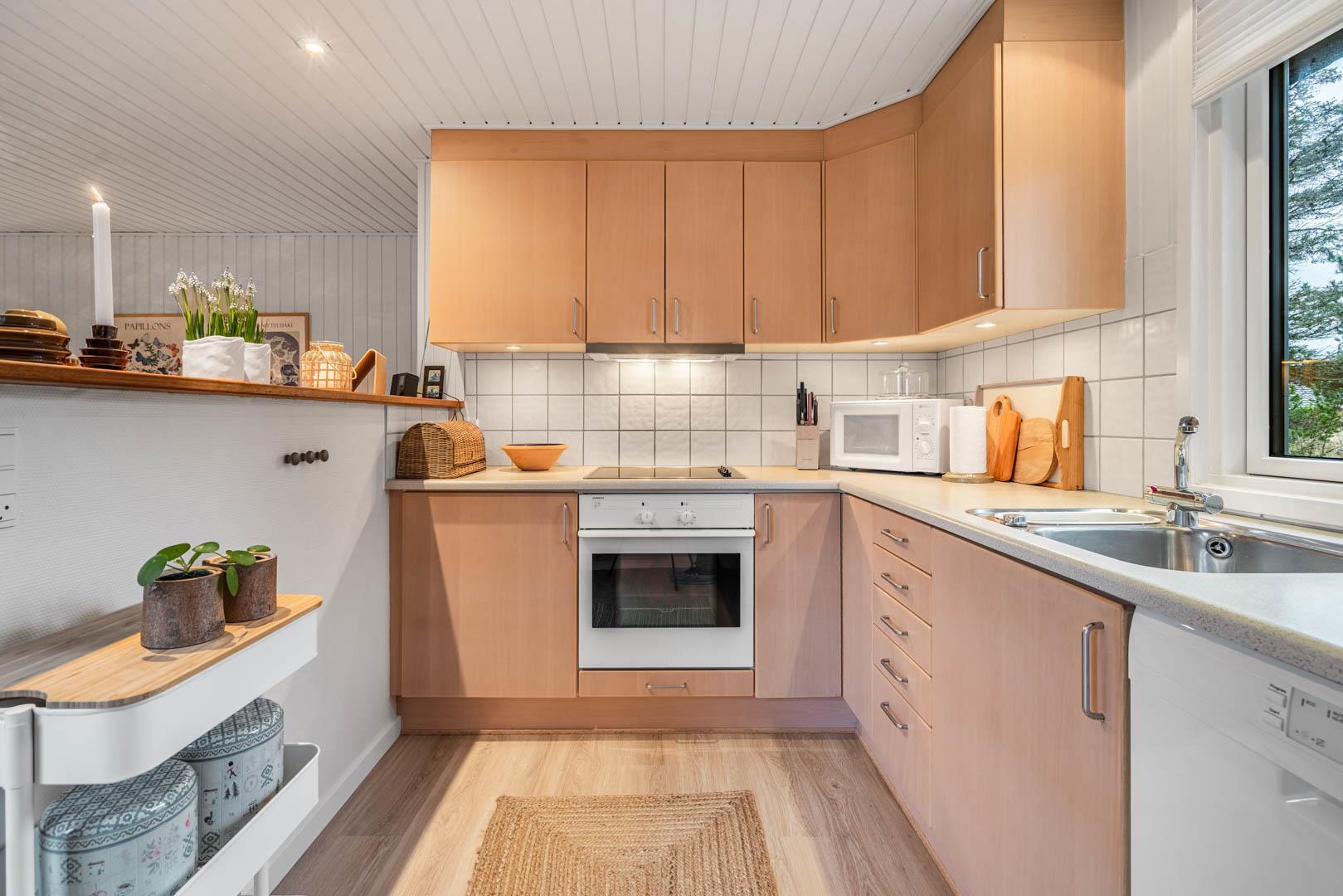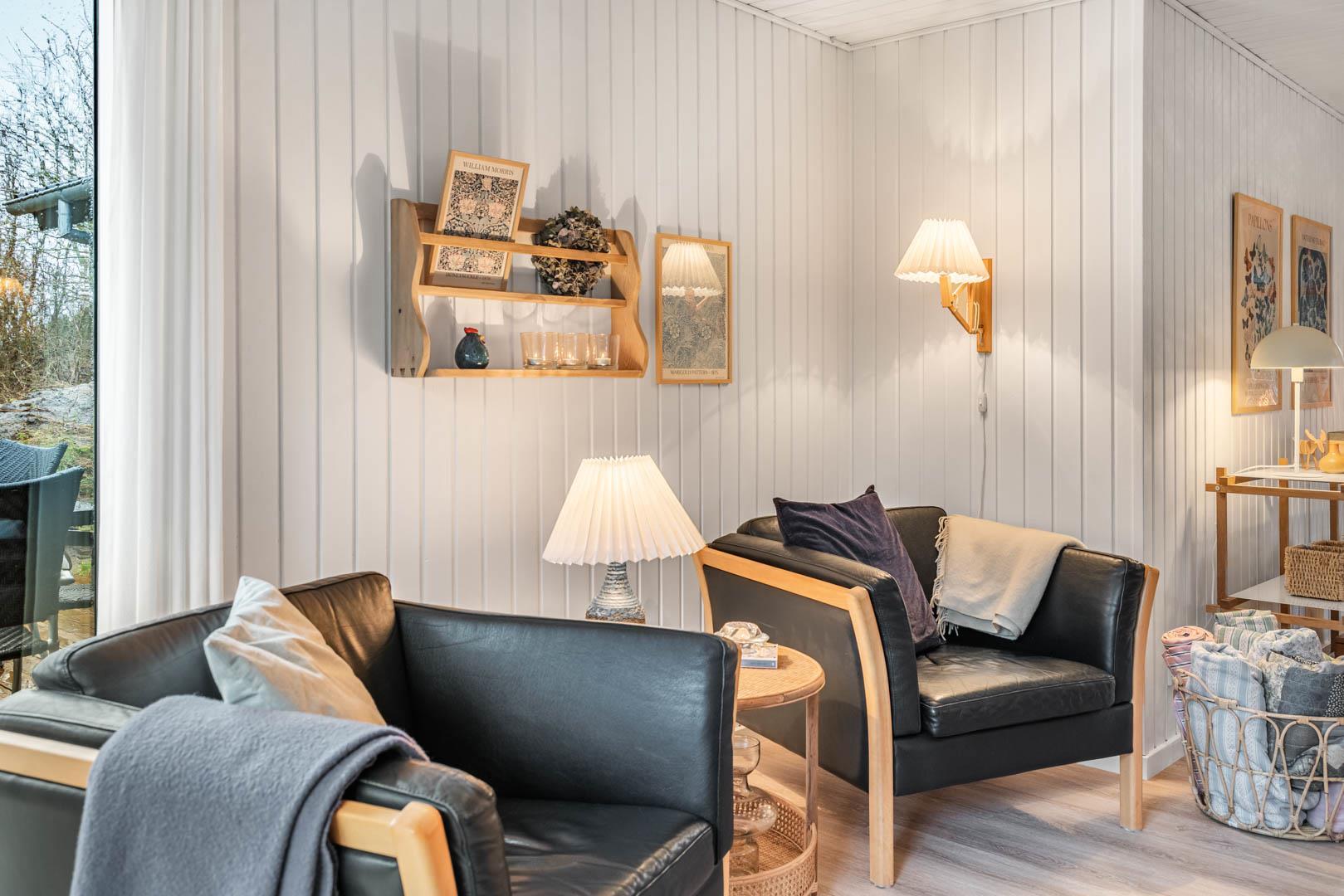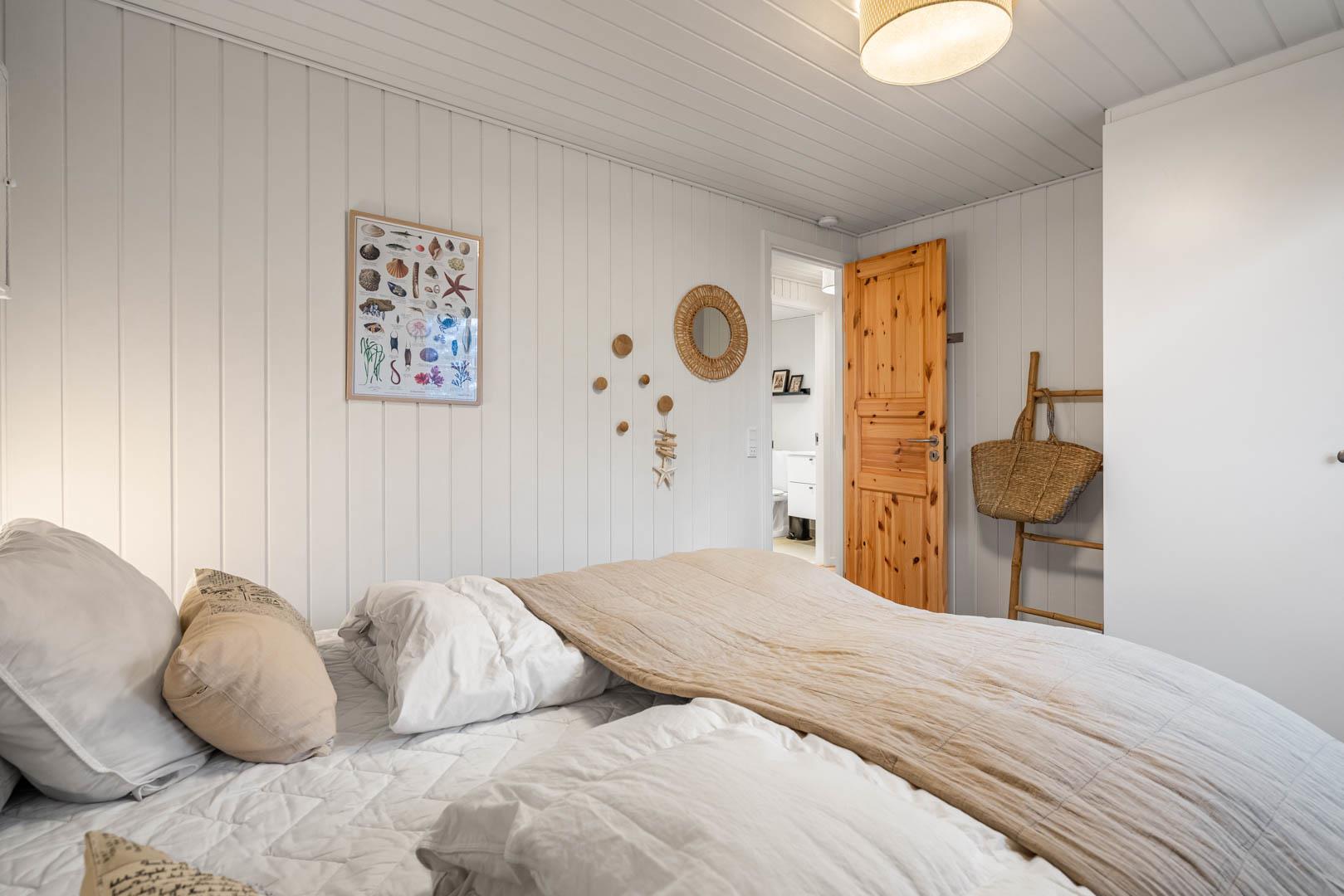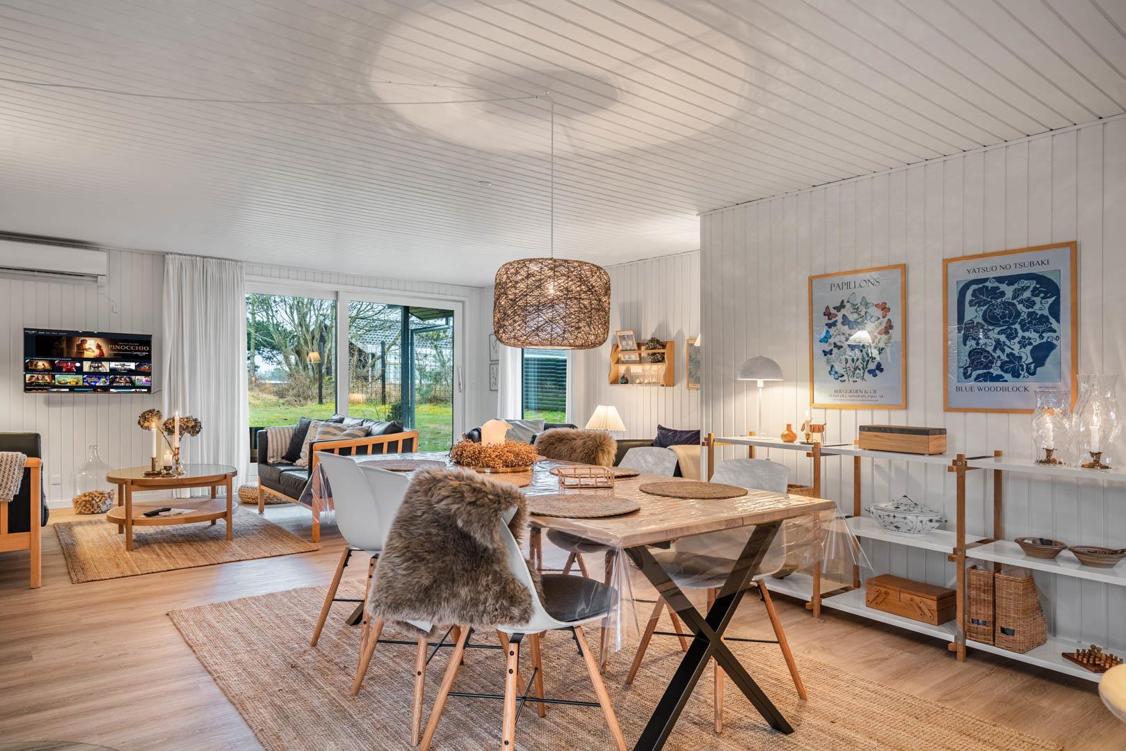 Indendørs byder sommerhuset på et skønt, åbent opholdsområde, hvor et veludstyret køkken står i åben forbindelse med en smukt indrettet stue. Her er komfortable og pæne møbler, brændeovn og en effektiv varmepumpe, som tilsammen skaber den perfekte stemning året rundt. Brændeovnen knitrer hyggeligt på de køligere aftener og varmer huset op, så du kan slappe af i en hjemlig og behagelig atmosfære. Sommerhuset er smagfuldt indrettet og skabt til, at du føler dig hjemme fra det øjeblik, du træder ind ad døren.