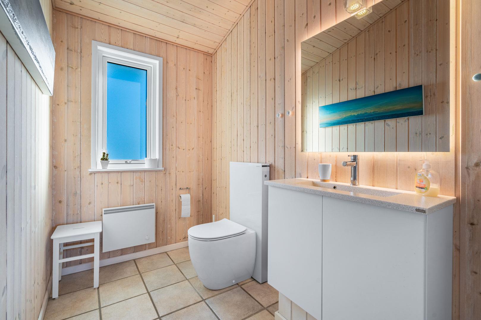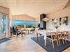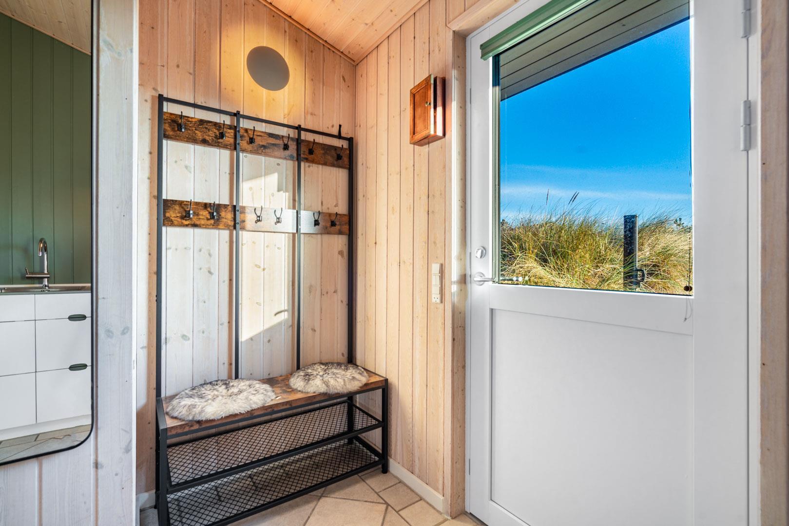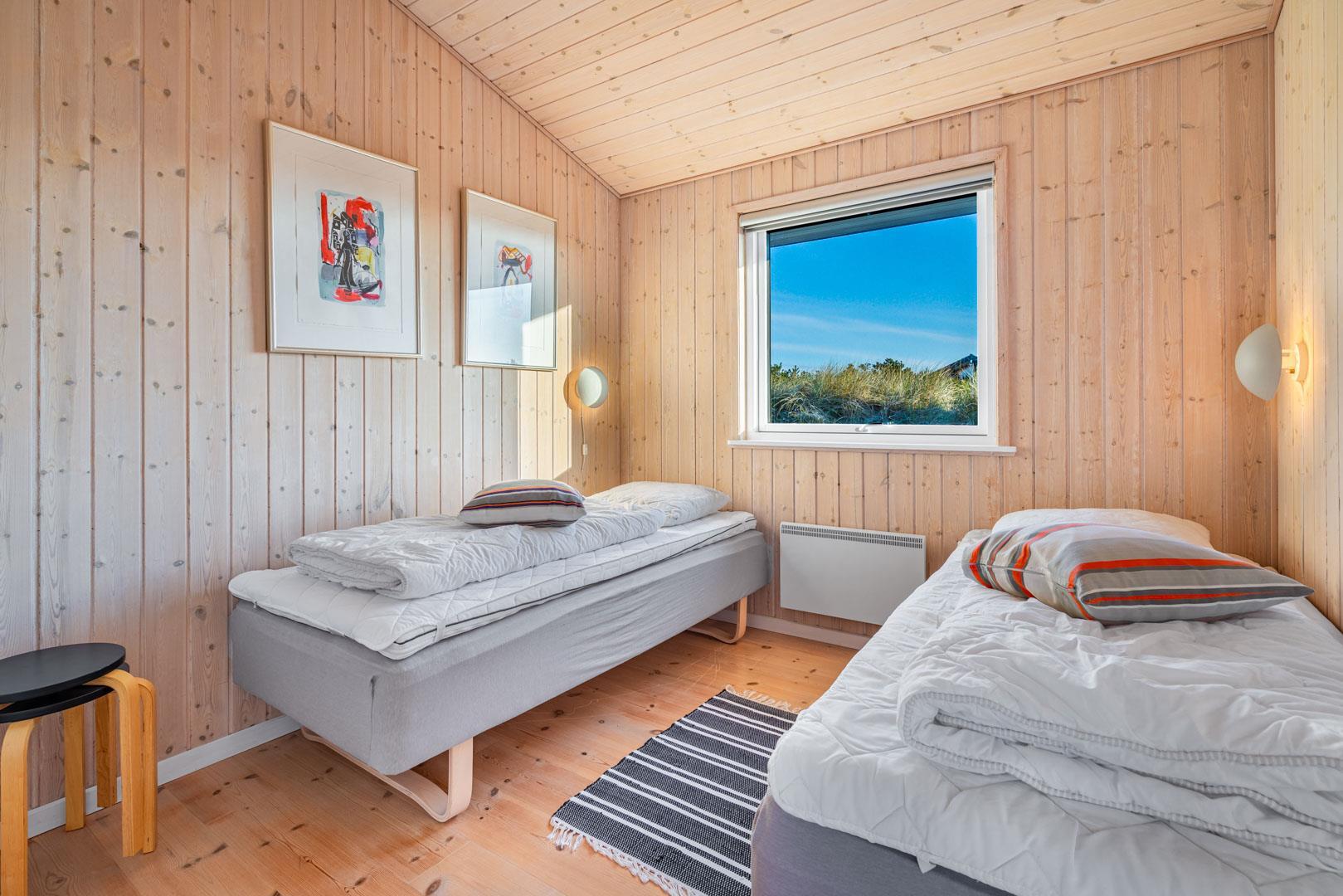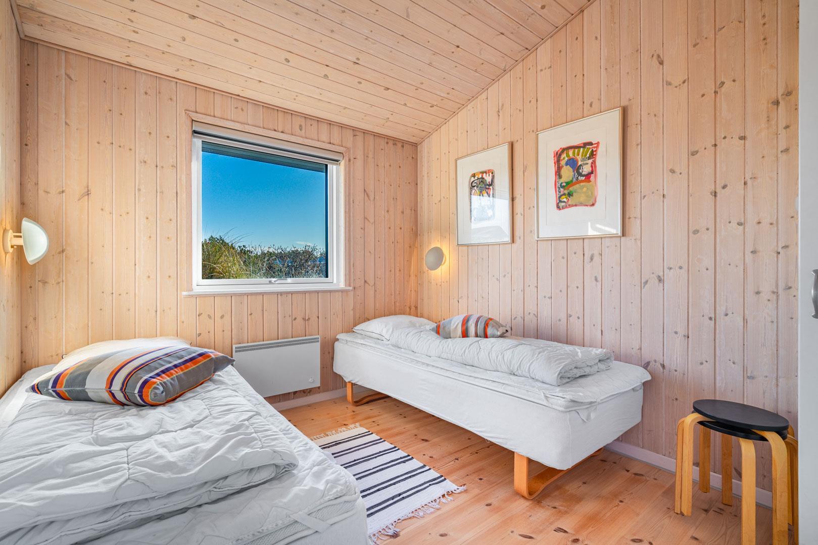 Huset er indrettet med seks faste sovepladser, som fordeler sig på tre soverum et med dobbeltseng (med elevation) og to med enkeltsenge. Stuen og køkkenet ligger i åben forbindelse og danner et åbent opholdsmiljø med brændeovn, og huset fuldendes af toilet og badeværelse samt entré med vaskefaciliteter.