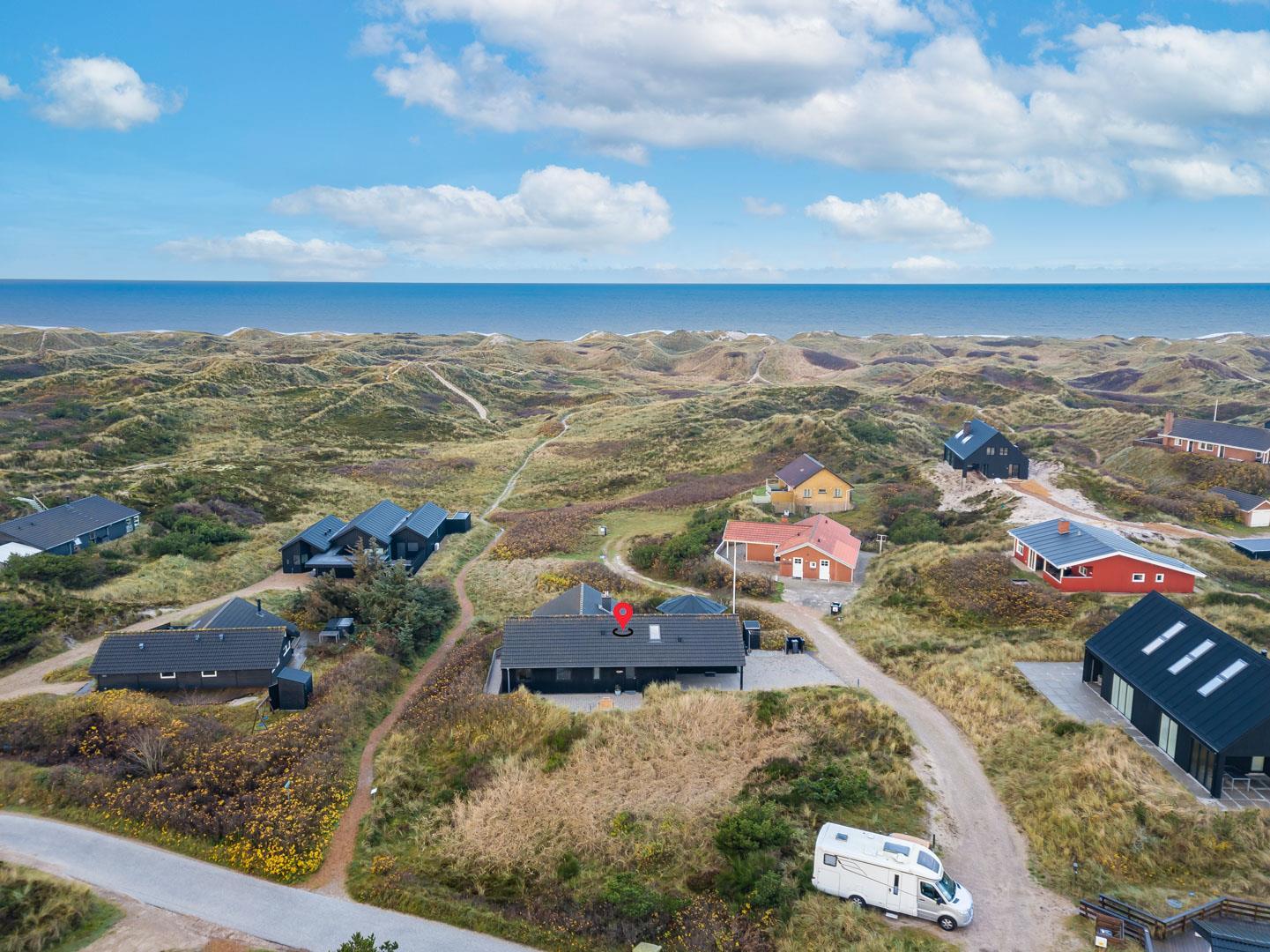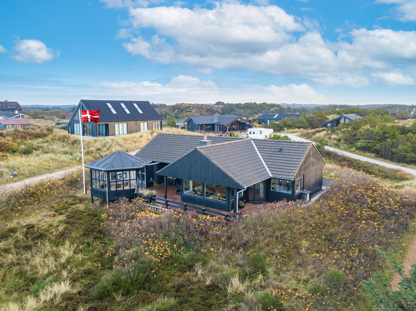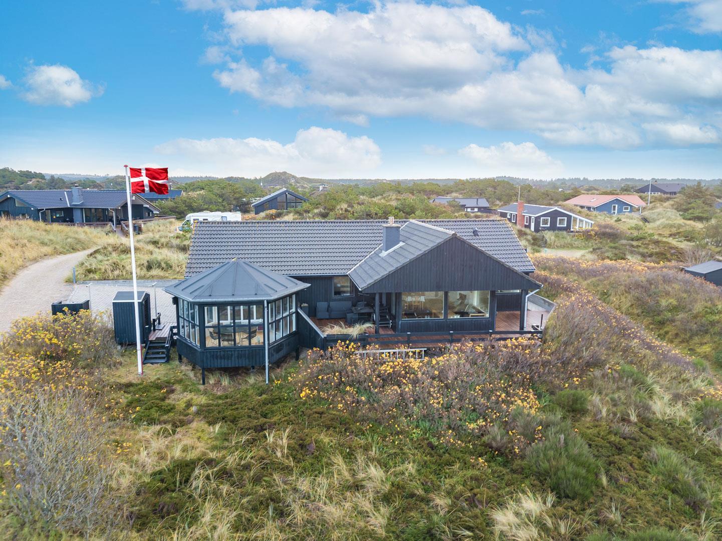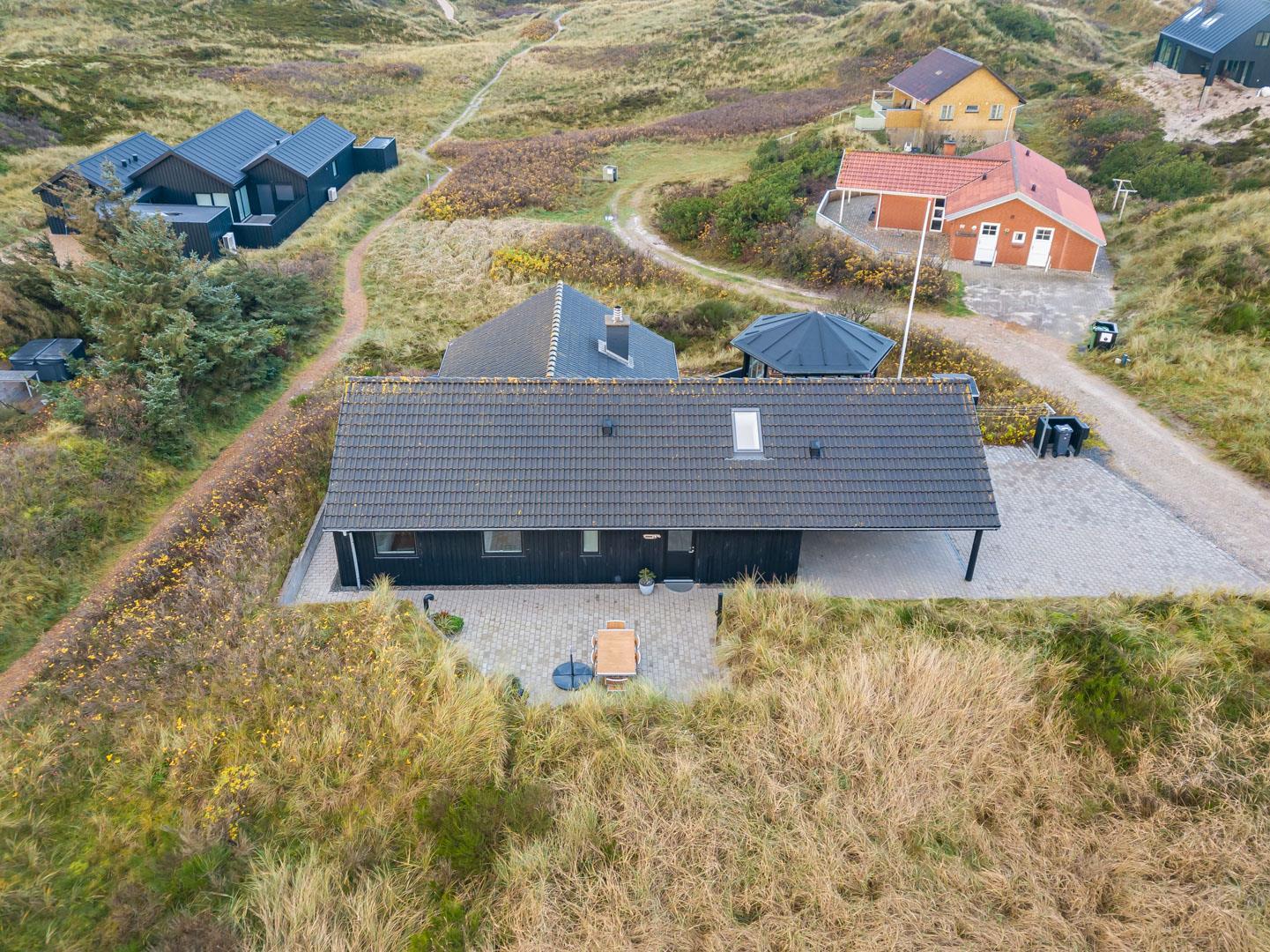 Feriehuset ligger helt fredeligt og velplaceret på en pragtfuld klitgrund, og det er opført med tanke på at optimere både lysindfald og udsigt. I kan derfor glæde jer til at nyde udsigten, mens I griller røde bøffer på terrassen, se frem til at følge med i vindens lette rusken i marehalmen, mens I drikker kaffe i pavillonen og ikke mindst håbe på regnvejr, så I kan lytte til dråberne, der trommer på ruderne i stuens kæmpestore vinduesparti.