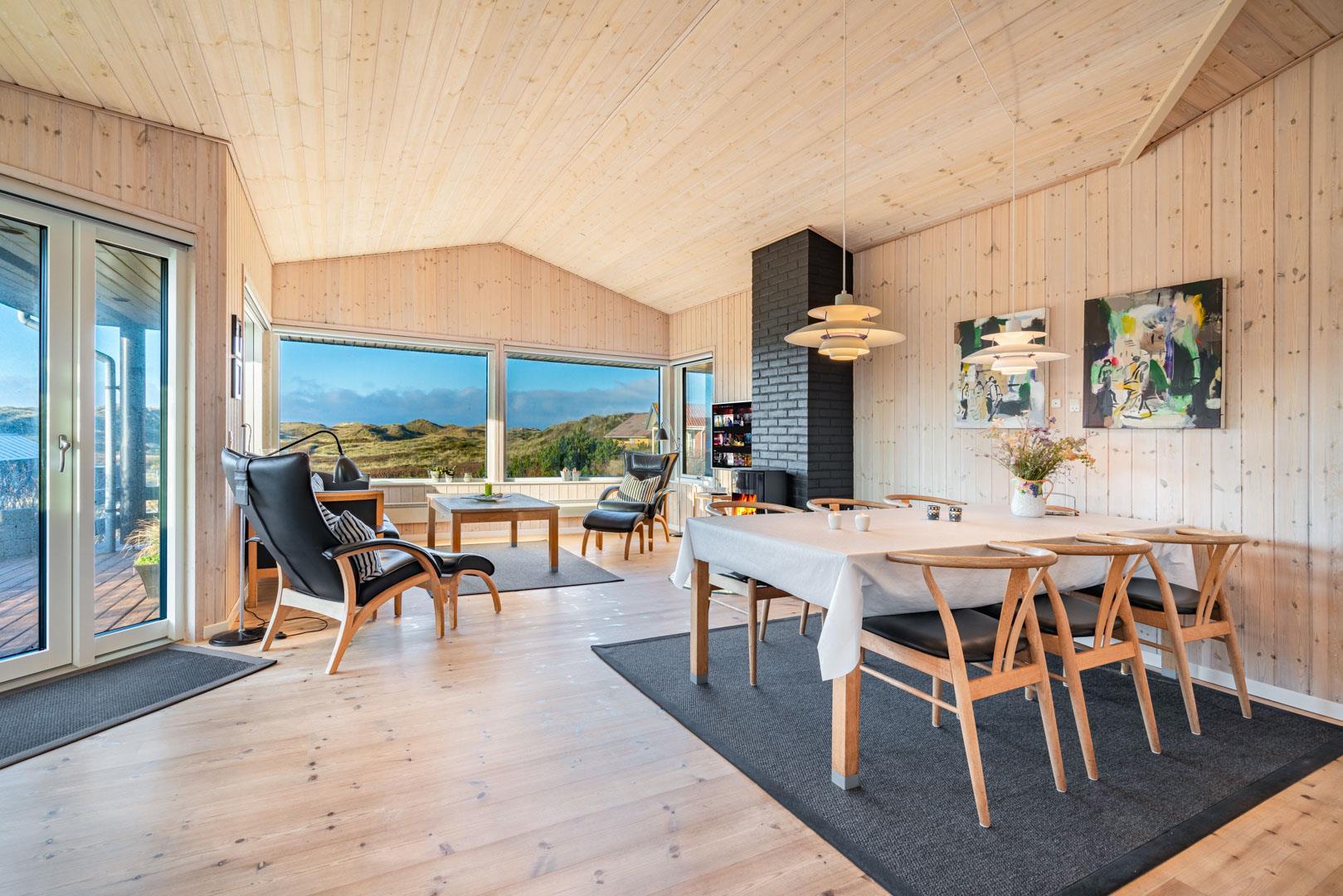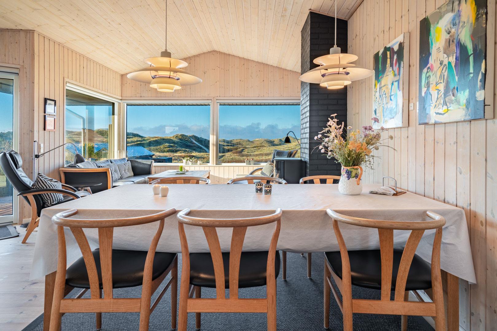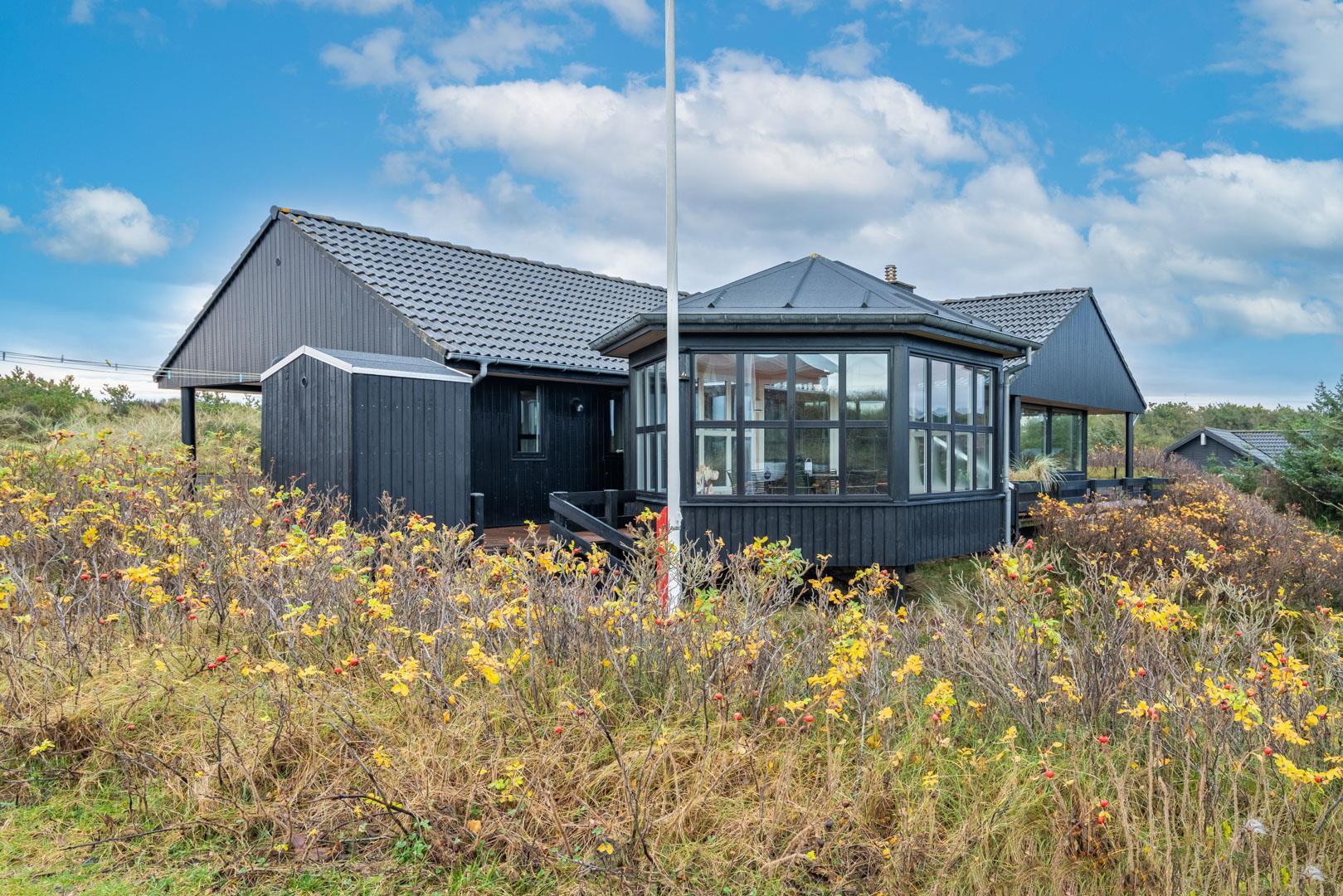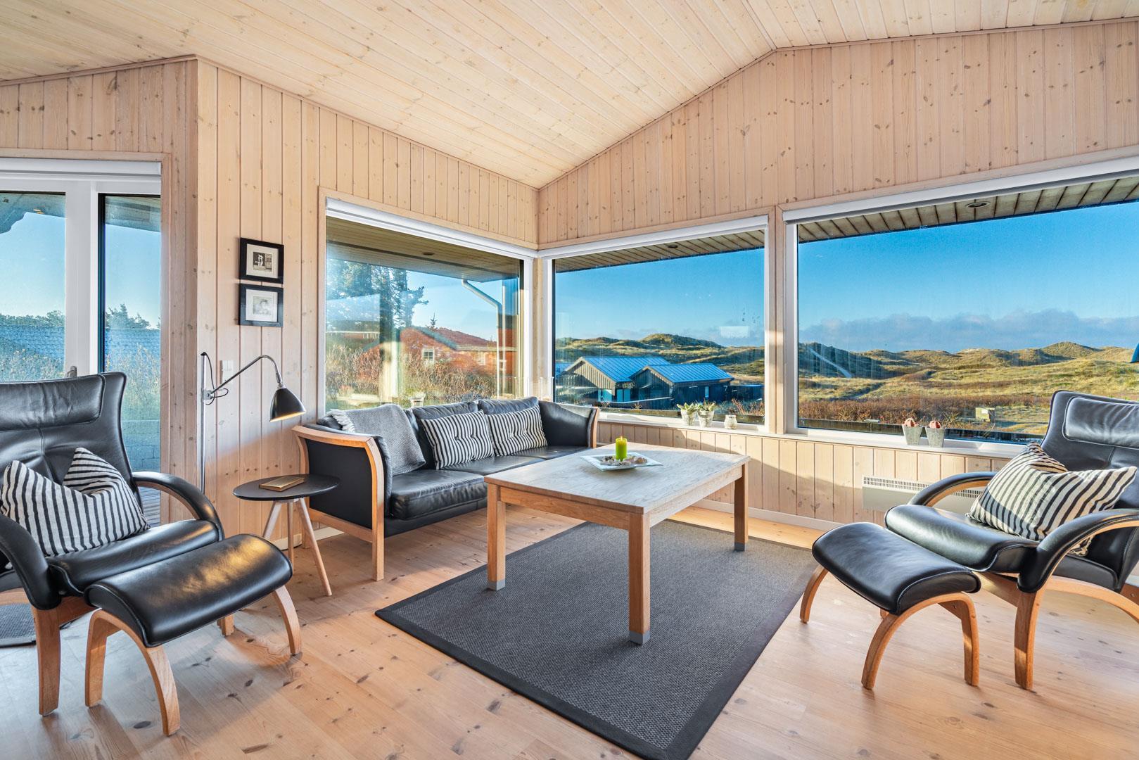 Feriehuset ligger helt fredeligt og velplaceret på en pragtfuld klitgrund, og det er opført med tanke på at optimere både lysindfald og udsigt. I kan derfor glæde jer til at nyde udsigten, mens I griller røde bøffer på terrassen, se frem til at følge med i vindens lette rusken i marehalmen, mens I drikker kaffe i pavillonen og ikke mindst håbe på regnvejr, så I kan lytte til dråberne, der trommer på ruderne i stuens kæmpestore vinduesparti.
