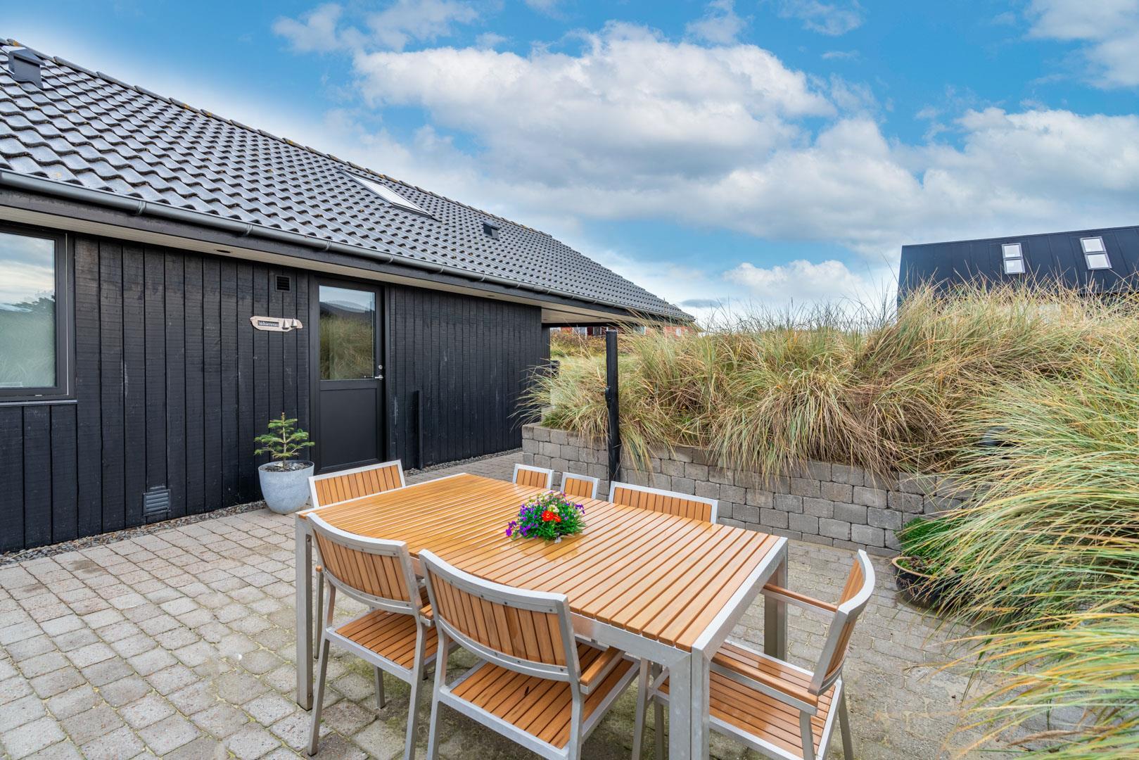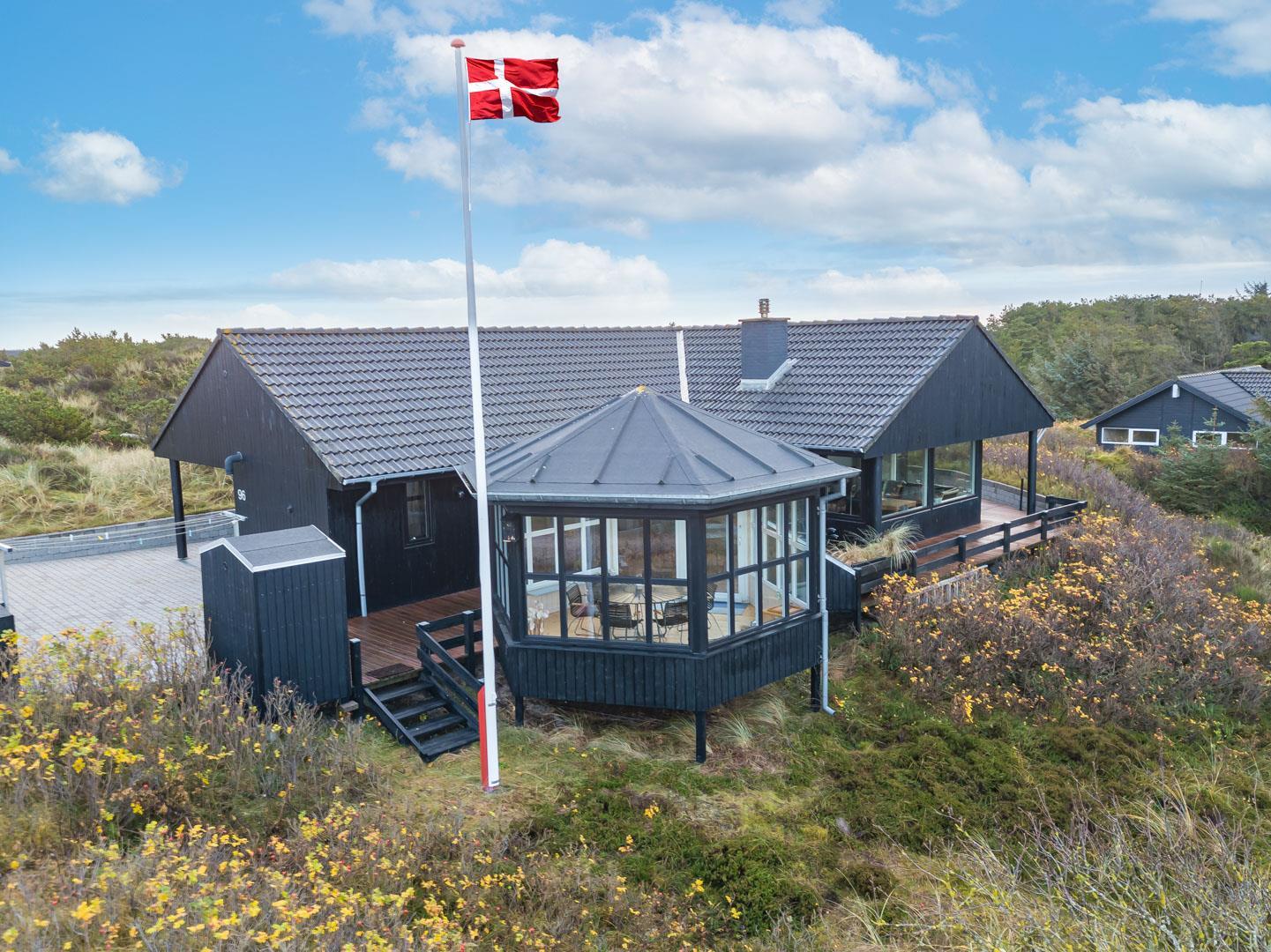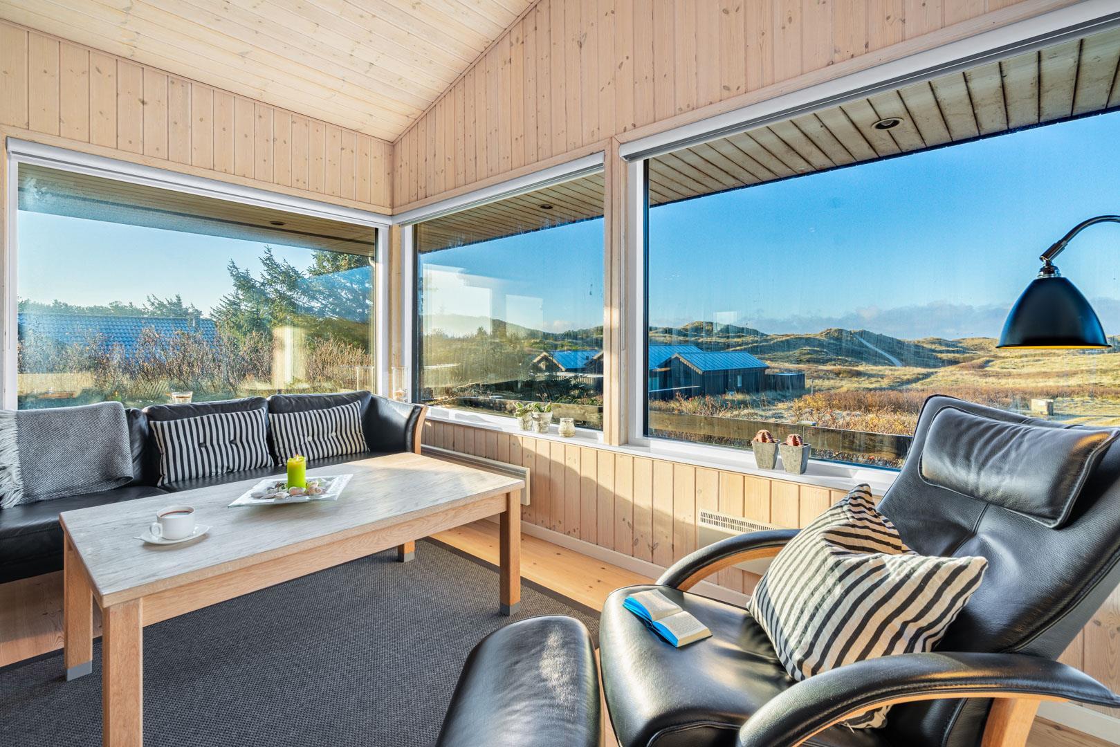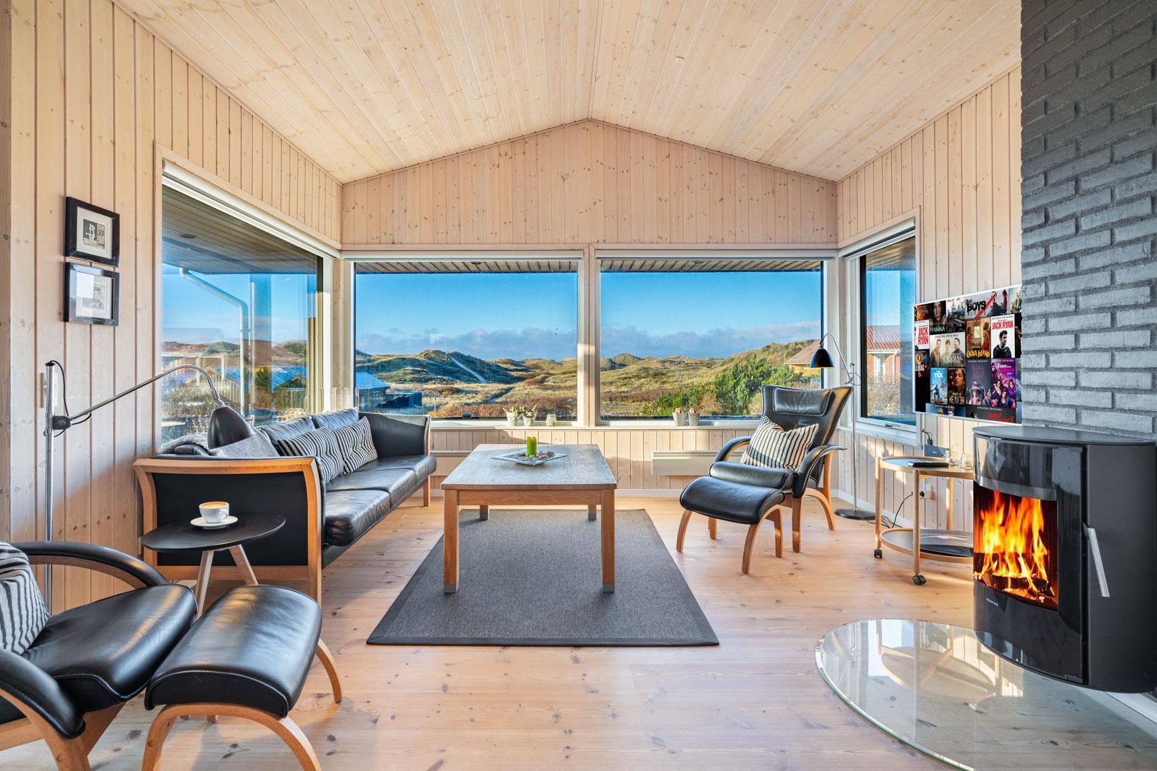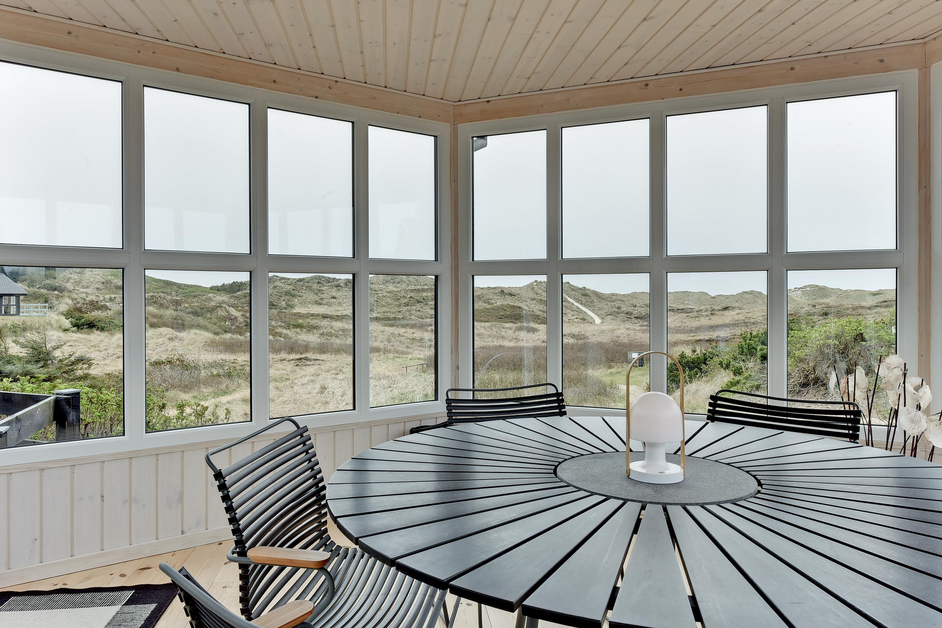 Feriehuset ligger helt fredeligt og velplaceret på en pragtfuld klitgrund, og det er opført med tanke på at optimere både lysindfald og udsigt. I kan derfor glæde jer til at nyde udsigten, mens I griller røde bøffer på terrassen, se frem til at følge med i vindens lette rusken i marehalmen, mens I drikker kaffe i pavillonen og ikke mindst håbe på regnvejr, så I kan lytte til dråberne, der trommer på ruderne i stuens kæmpestore vinduesparti.