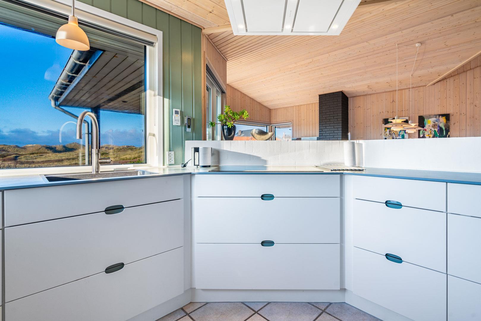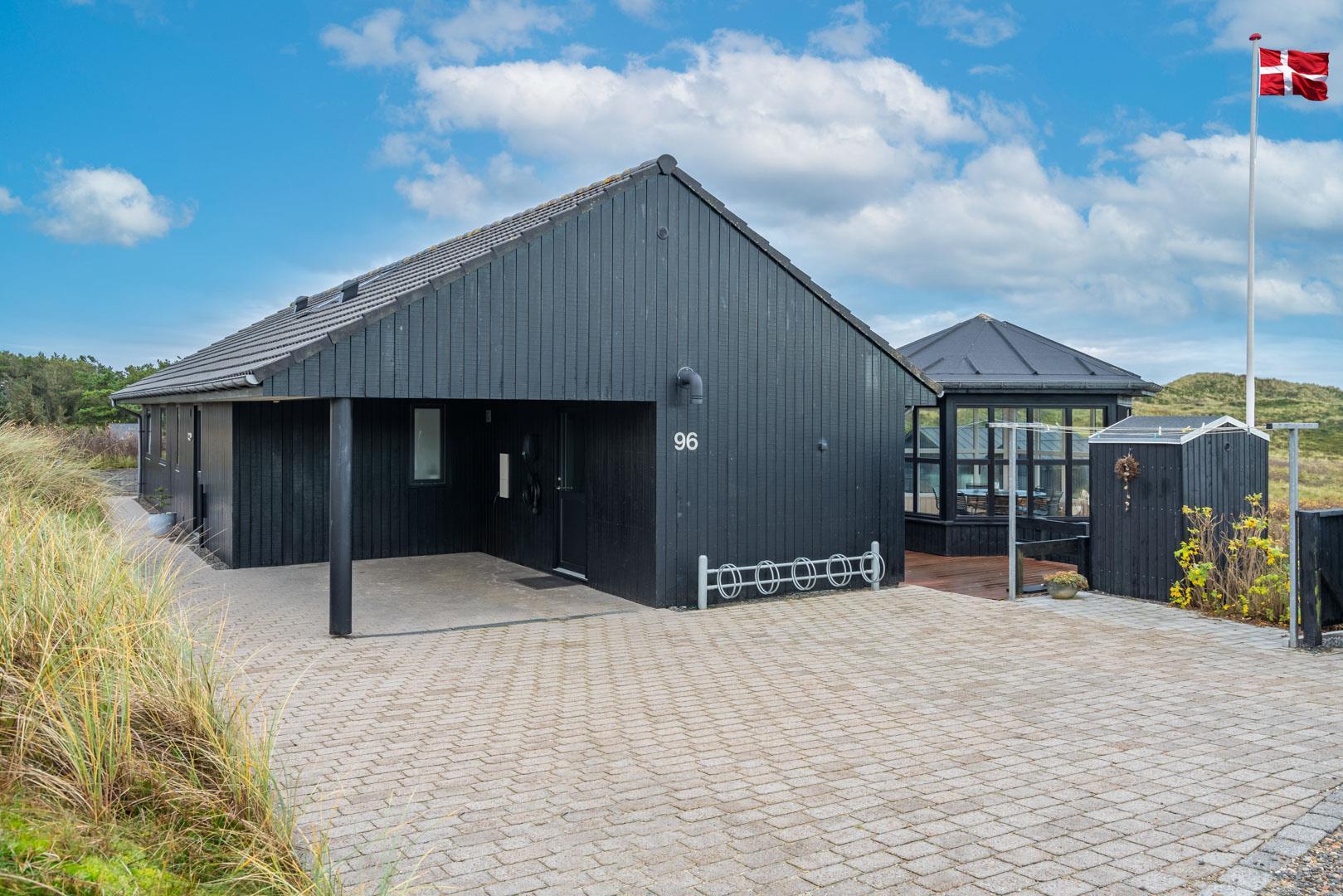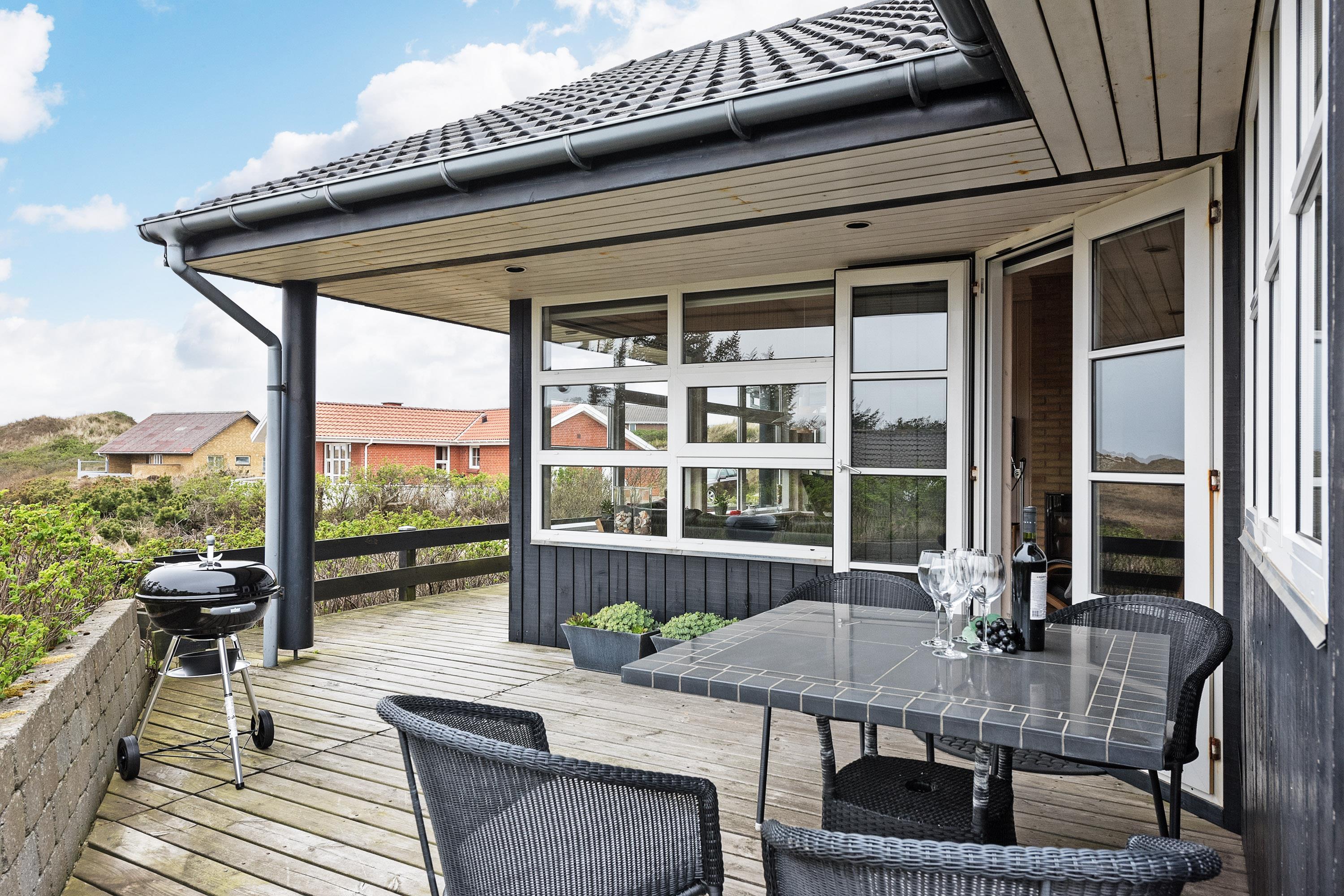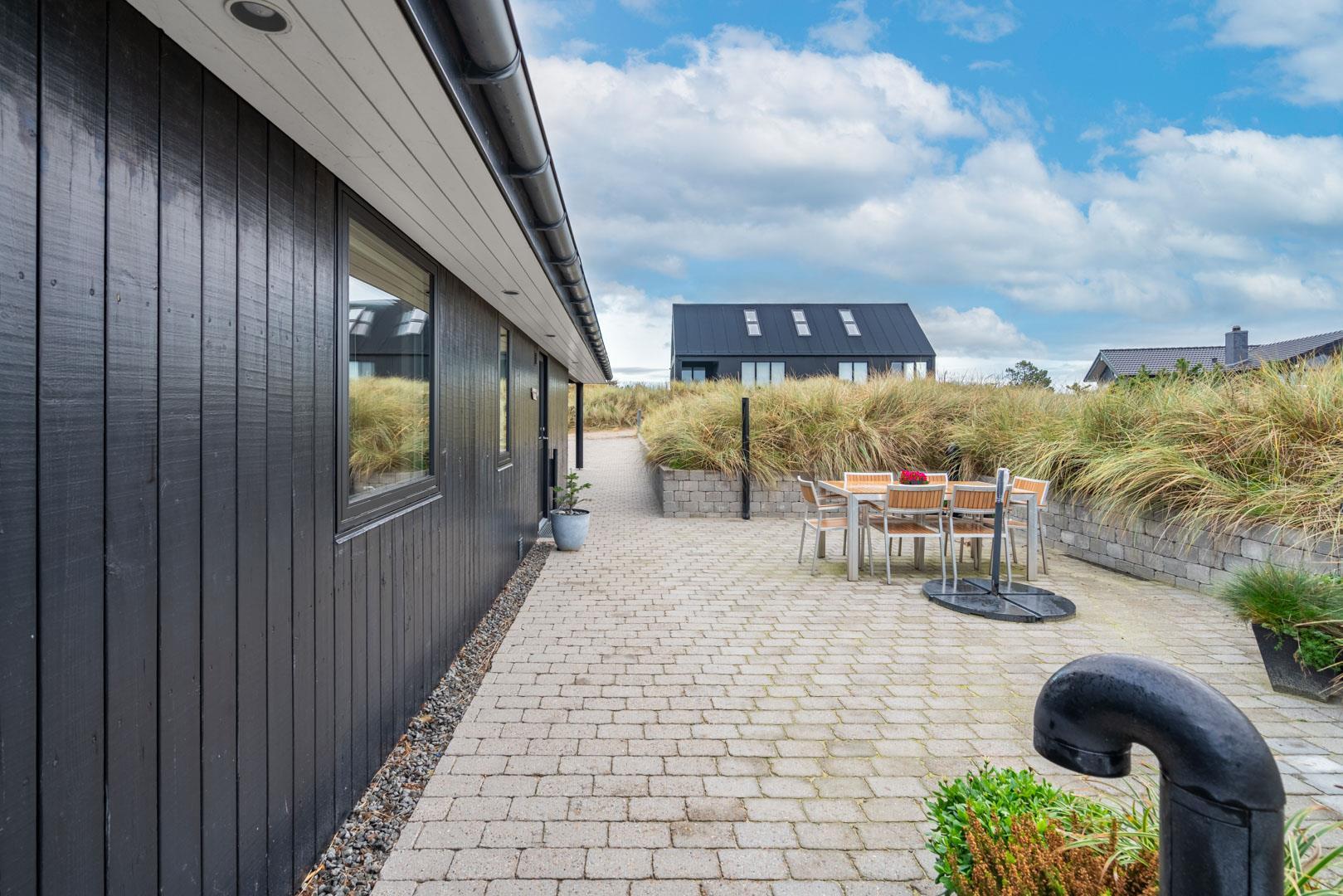 Feriehuset ligger helt fredeligt og velplaceret på en pragtfuld klitgrund, og det er opført med tanke på at optimere både lysindfald og udsigt. I kan derfor glæde jer til at nyde udsigten, mens I griller røde bøffer på terrassen, se frem til at følge med i vindens lette rusken i marehalmen, mens I drikker kaffe i pavillonen og ikke mindst håbe på regnvejr, så I kan lytte til dråberne, der trommer på ruderne i stuens kæmpestore vinduesparti.