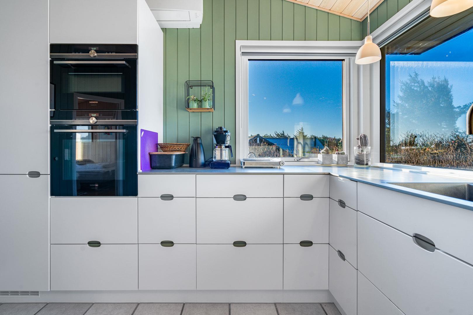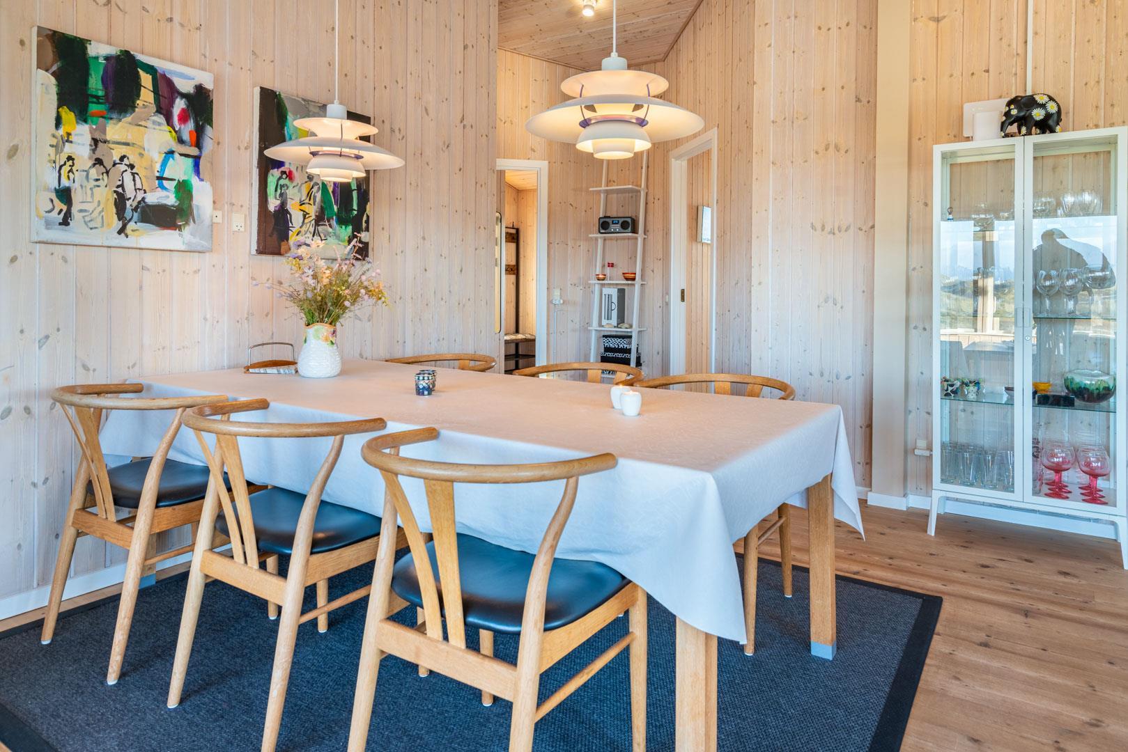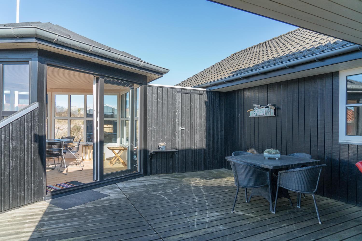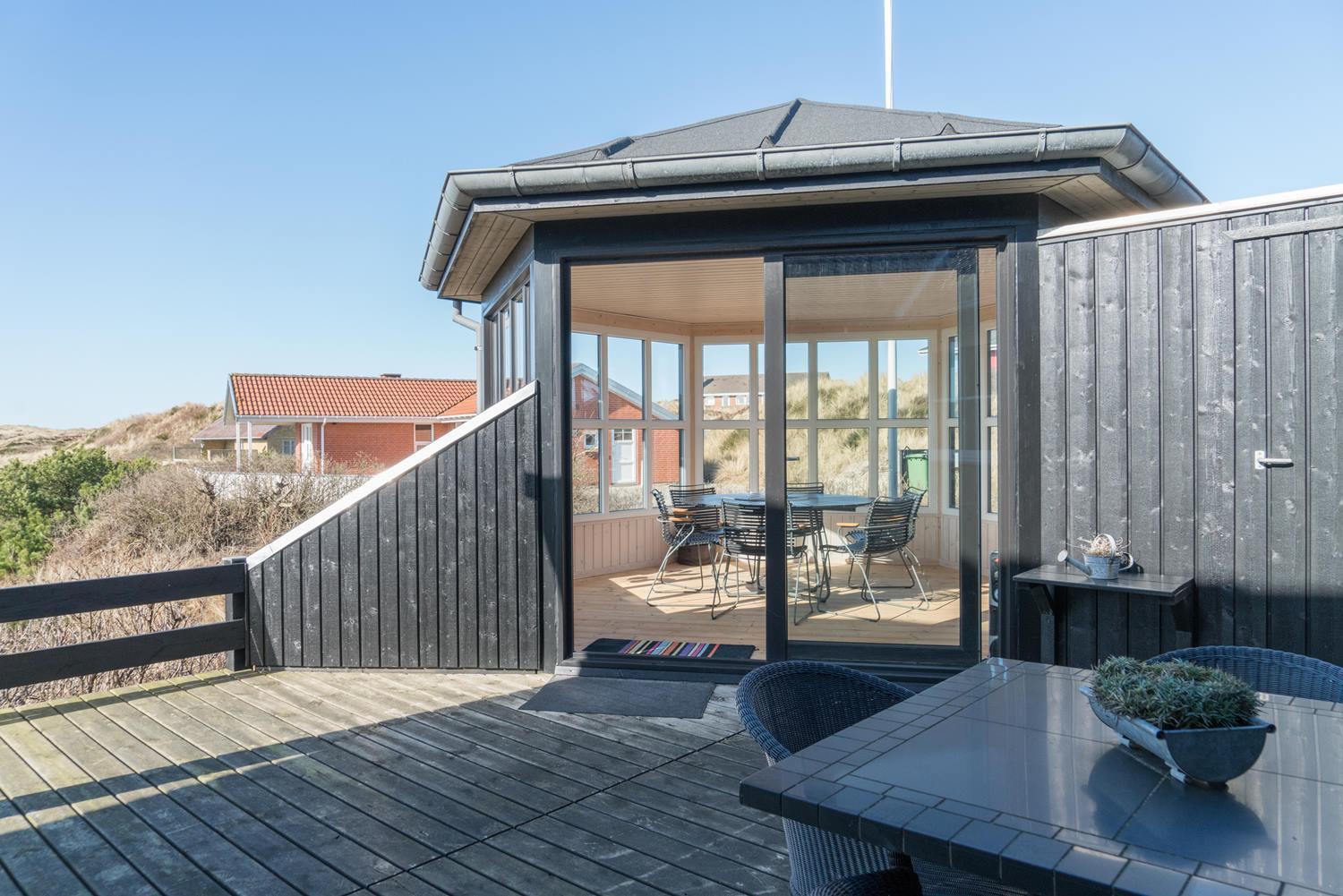 Feriehuset ligger helt fredeligt og velplaceret på en pragtfuld klitgrund, og det er opført med tanke på at optimere både lysindfald og udsigt. I kan derfor glæde jer til at nyde udsigten, mens I griller røde bøffer på terrassen, se frem til at følge med i vindens lette rusken i marehalmen, mens I drikker kaffe i pavillonen og ikke mindst håbe på regnvejr, så I kan lytte til dråberne, der trommer på ruderne i stuens kæmpestore vinduesparti.