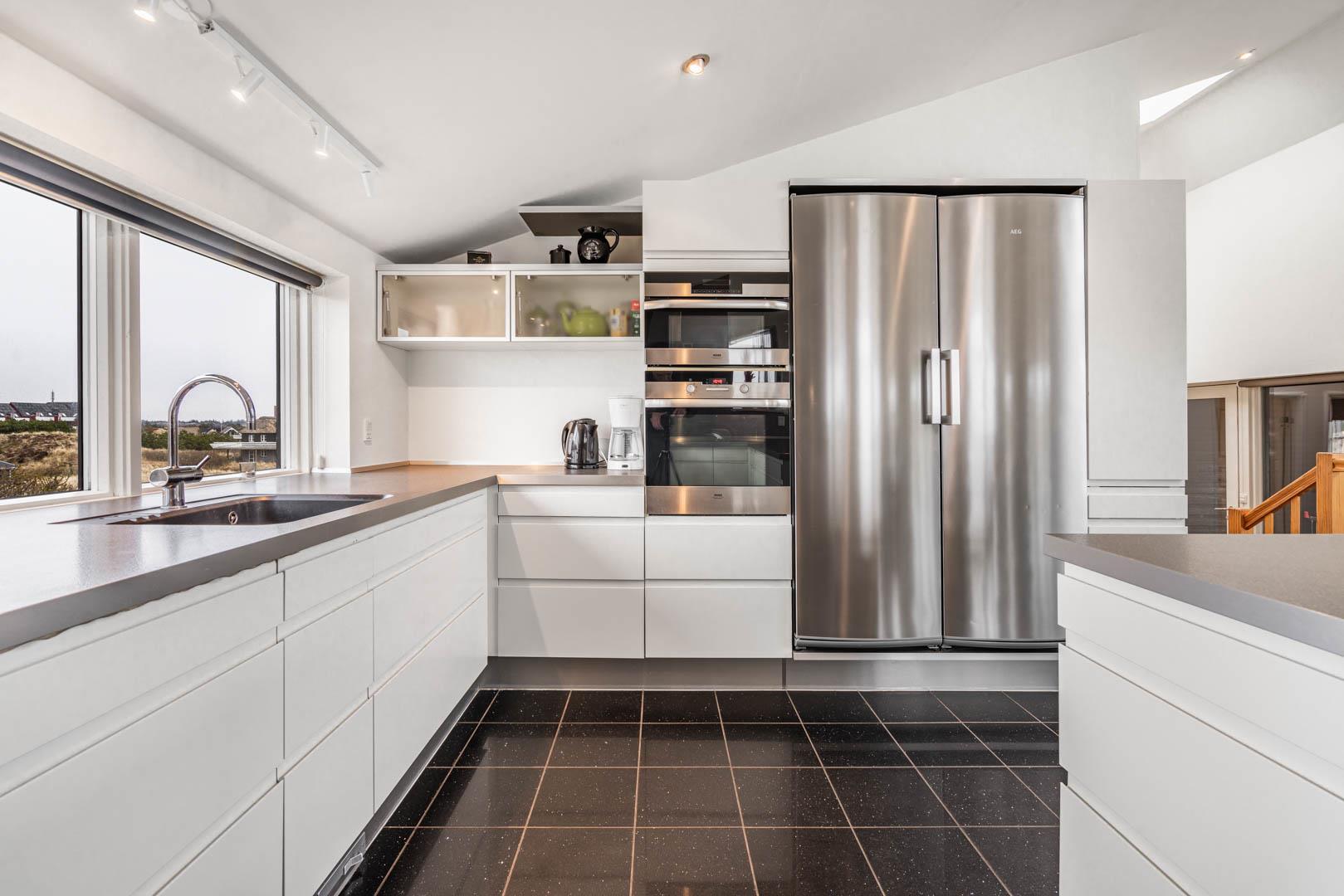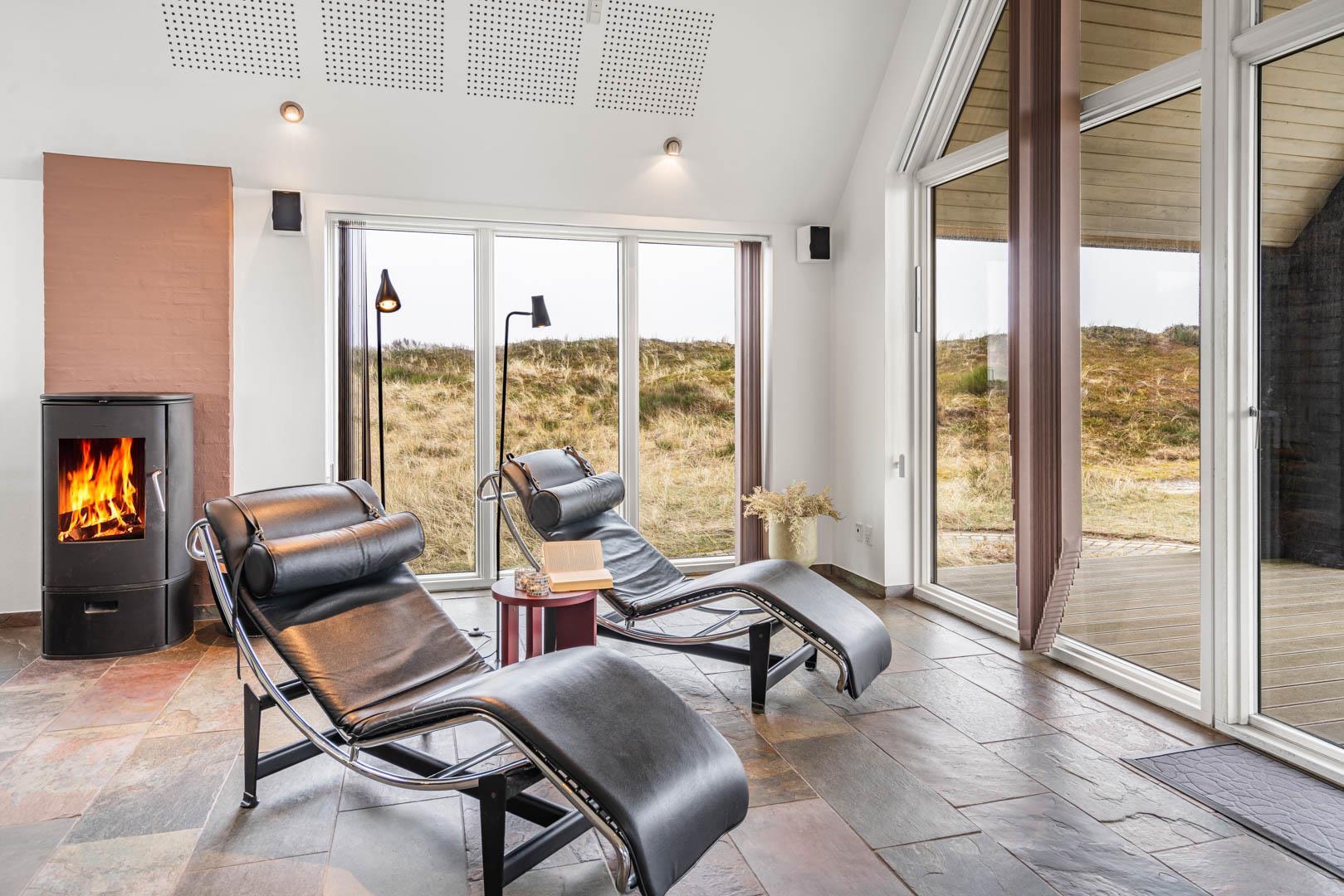 Fra stuen er der direkte adgang til en stor overdækket terrasse og den grønklædte naturgrund, der ofte besøges af hjorte ved daggry og skumring. Omgivelserne giver i det hele taget perfekte betingelser for at nyde naturen: Lige bag klitterne åbner den kridhvide sandstrand sig, og de blå bølger lover feriestemning på højde med Sydeuropa, og der er kort køreafstand til Blåbjerg Plantage, Kærgård Plantage og Filsø med mere.