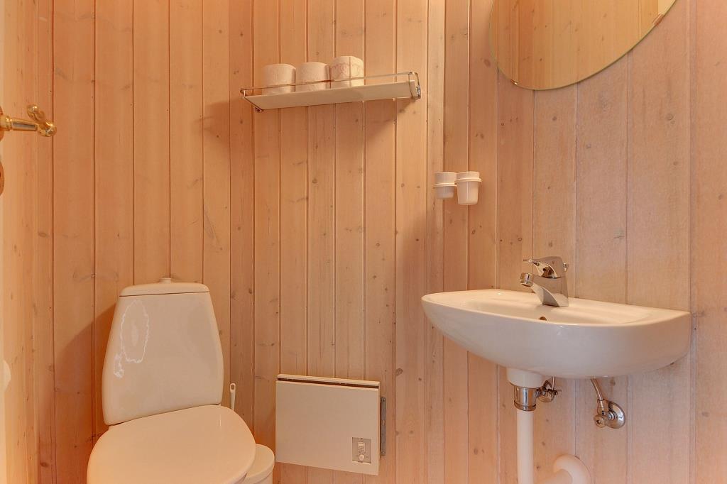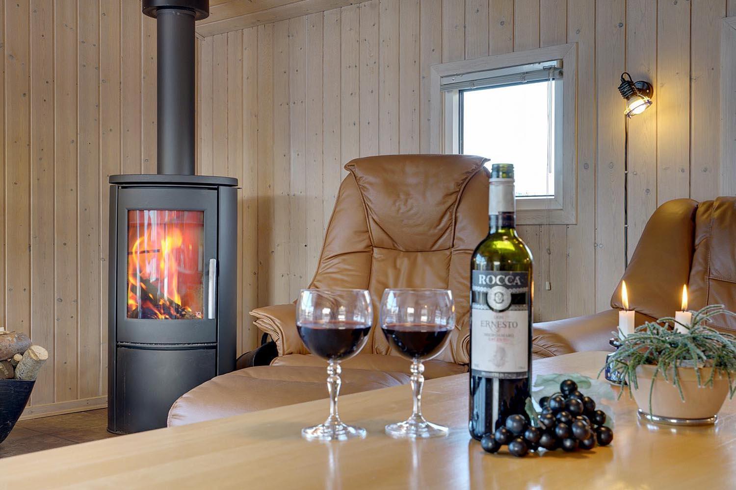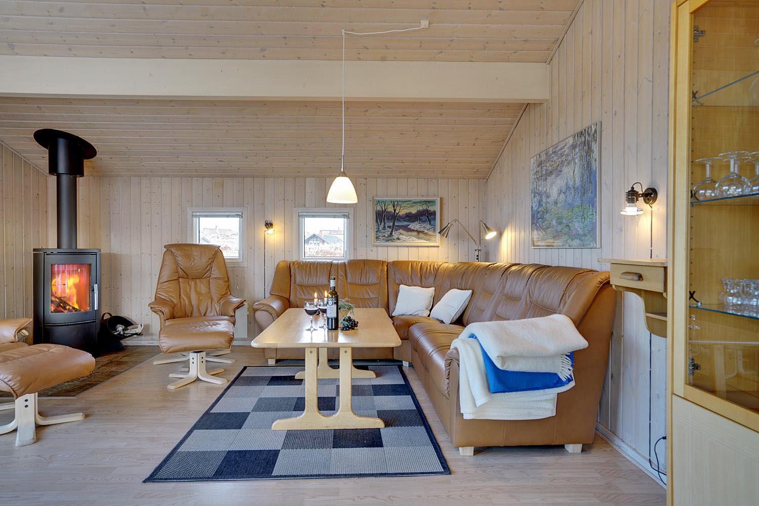 Selve huset er pænt møbleret med behagelige lædersofaer og et langt spisebord med otte spisepladser. Seks af de spisende gæster kan overnatte i faste senge + en barneseng, som er fordelt på tre soverum.