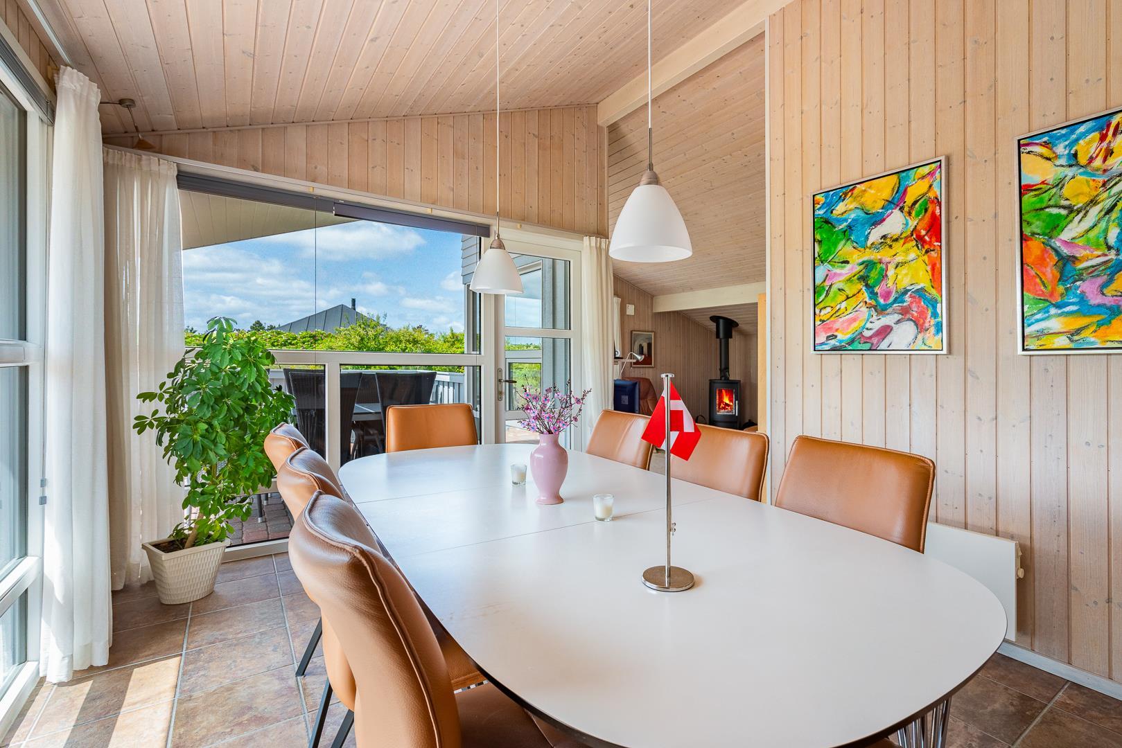 Feriehuset er indrettet med terrasser langs de syd- og vestlige facader, så du til fulde kan nyde solen og udsigten til den lave klitbeplantning, der læner sig blidt i sommerbrisen. Ikke mere end et par kilometer herfra afløses det åbne terræn af dyb, fascinerende skov med smukke vandre- og ridestier samt mountainbikeruter i forskellige sværhedsgrader. Stranden ligger blot omkring 800 meter fra feriehuset, så når du har nydt skovens mange farver, kan du slappe af på stranden hele eftermiddagen.
