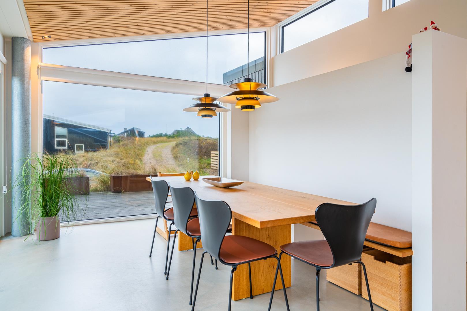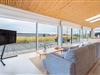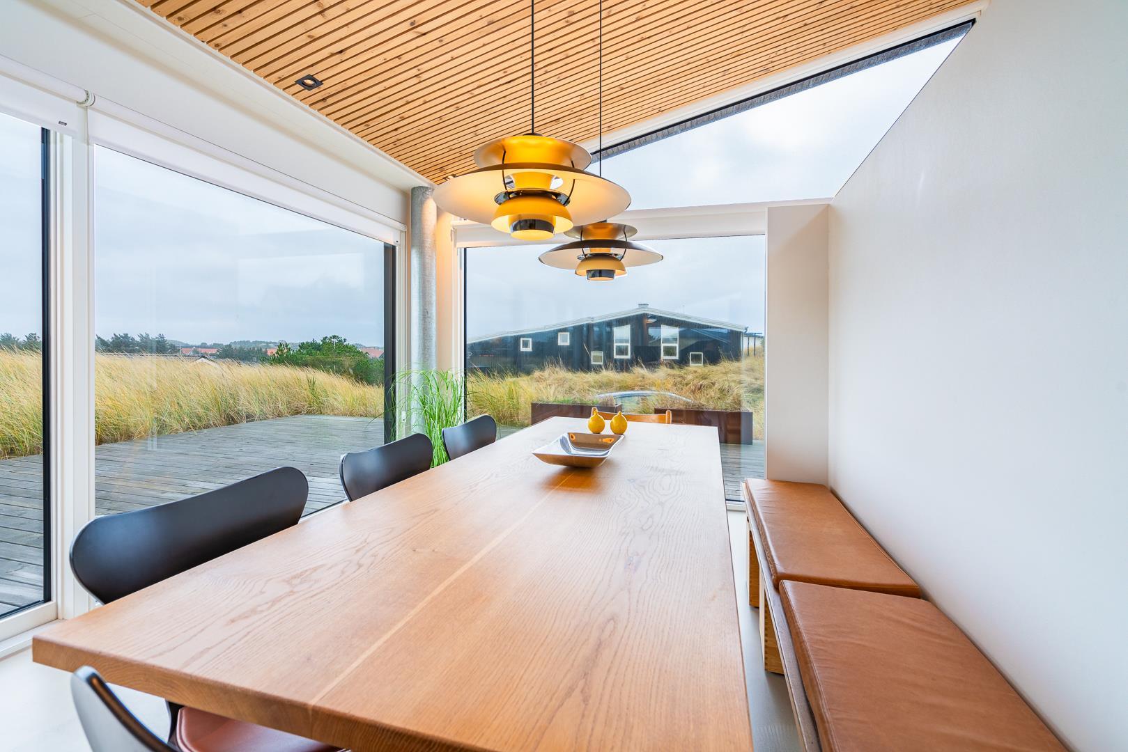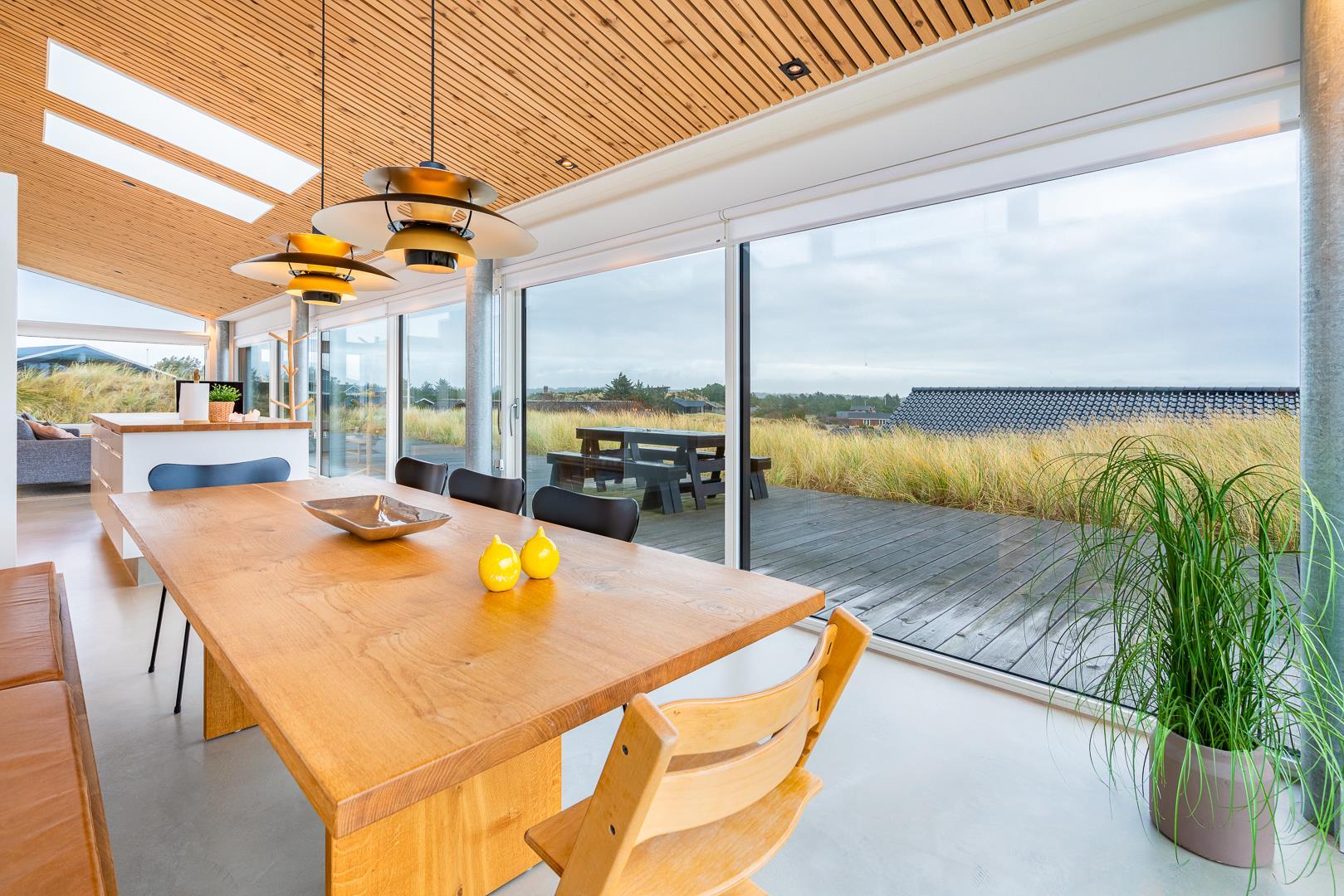 Det store køkken/alrum åbner op til den betagende træbelagte terrasse gennem store panoramavinduer, der kan foldes sammen og dermed give følelsen af at bringe naturen og udsigten ind i stuen og køkkenet.