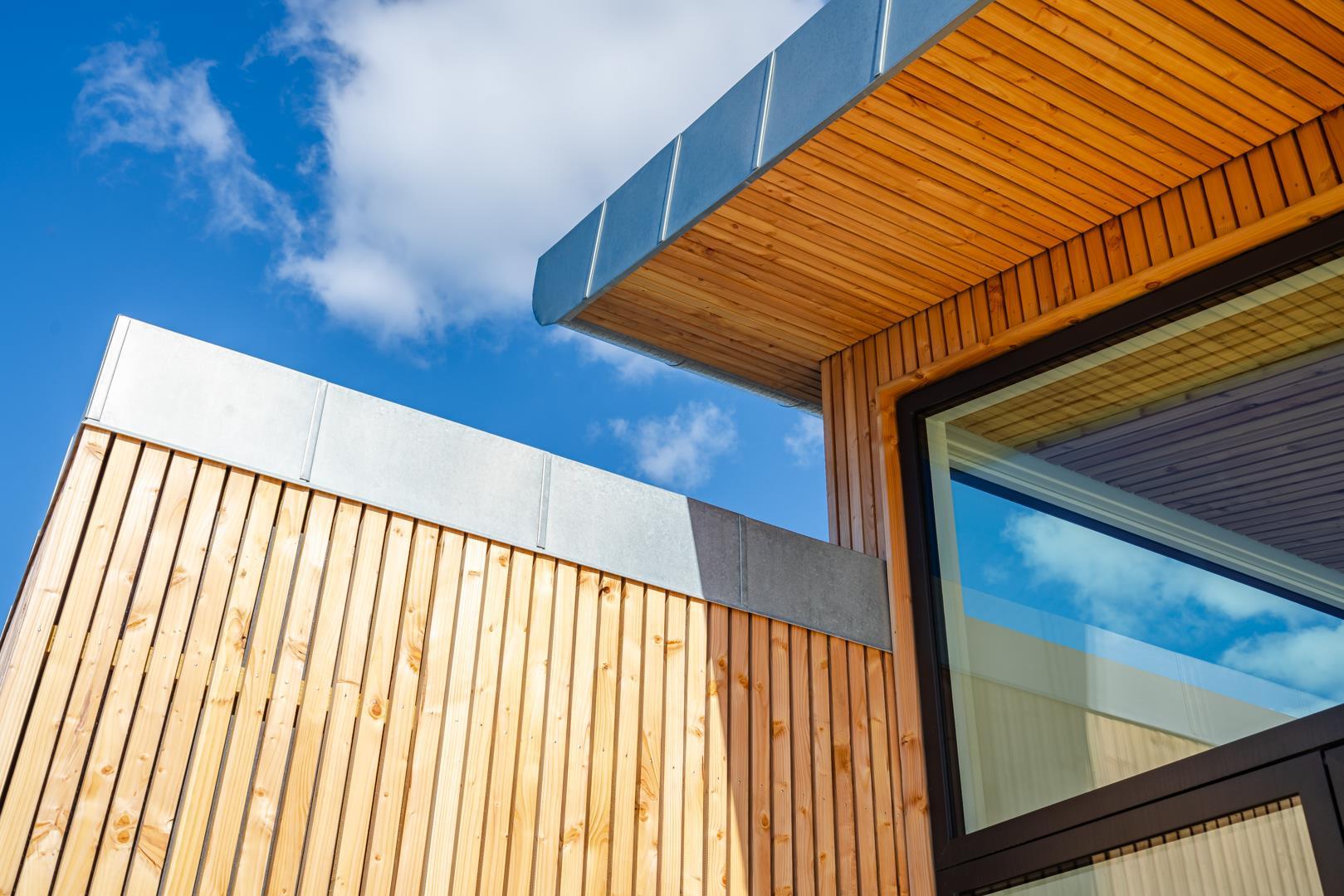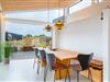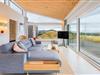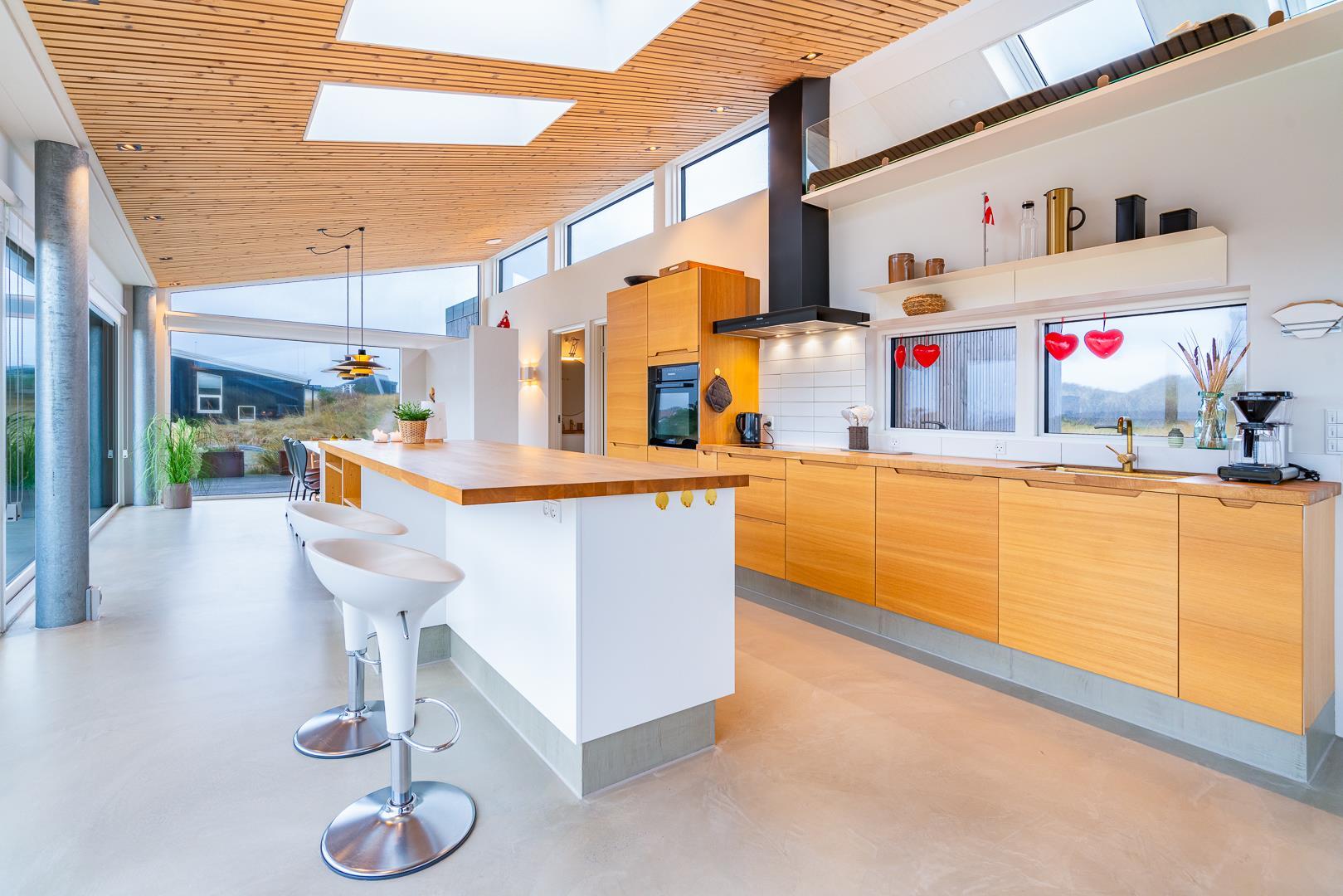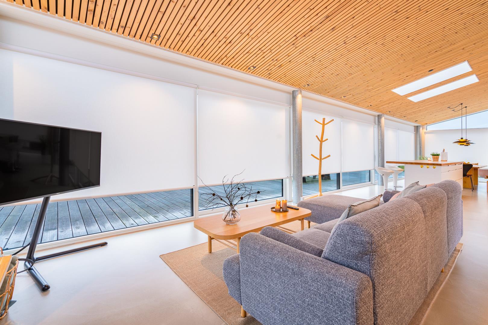 Det store køkken/alrum åbner op til den betagende træbelagte terrasse gennem store panoramavinduer, der kan foldes sammen og dermed give følelsen af at bringe naturen og udsigten ind i stuen og køkkenet.