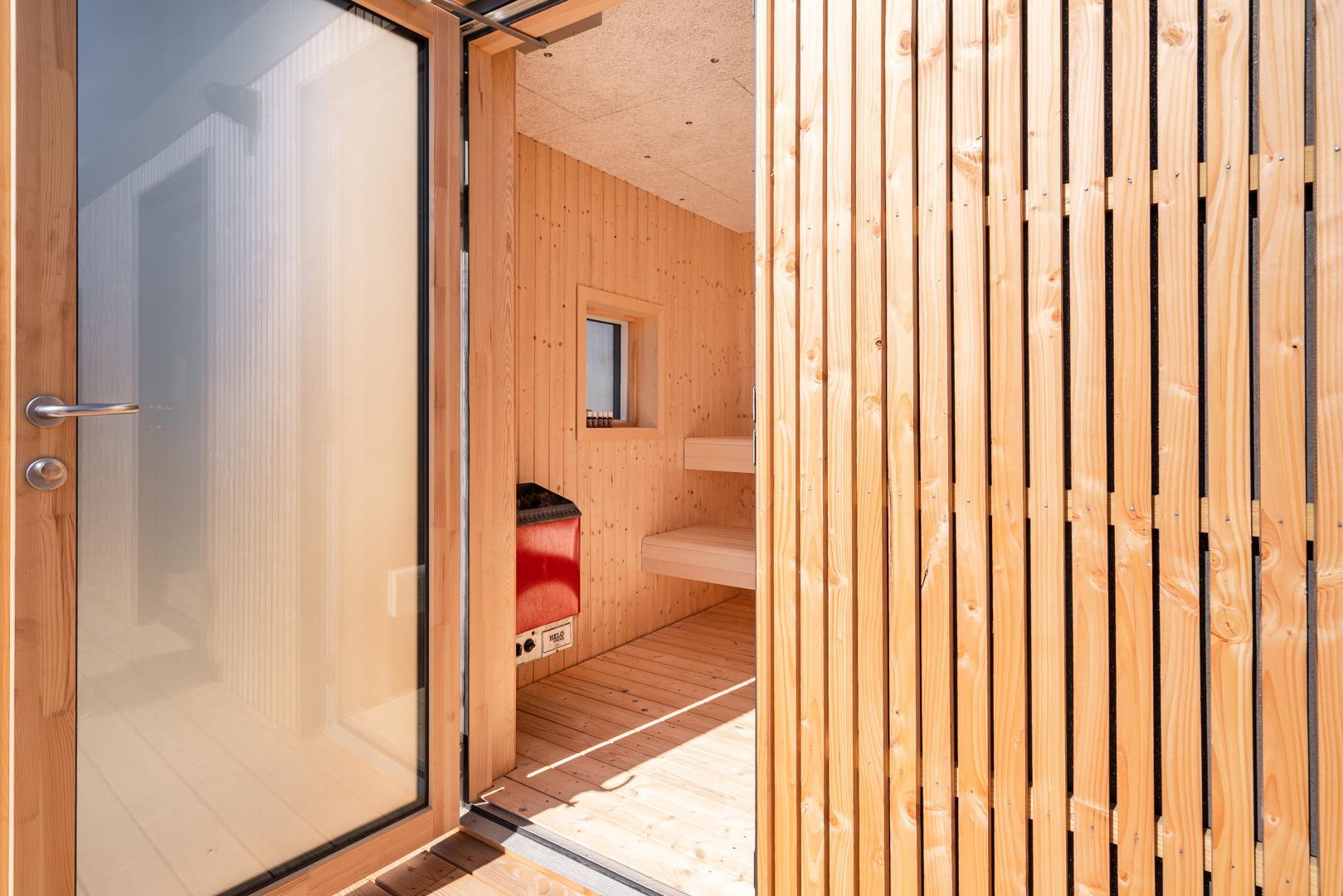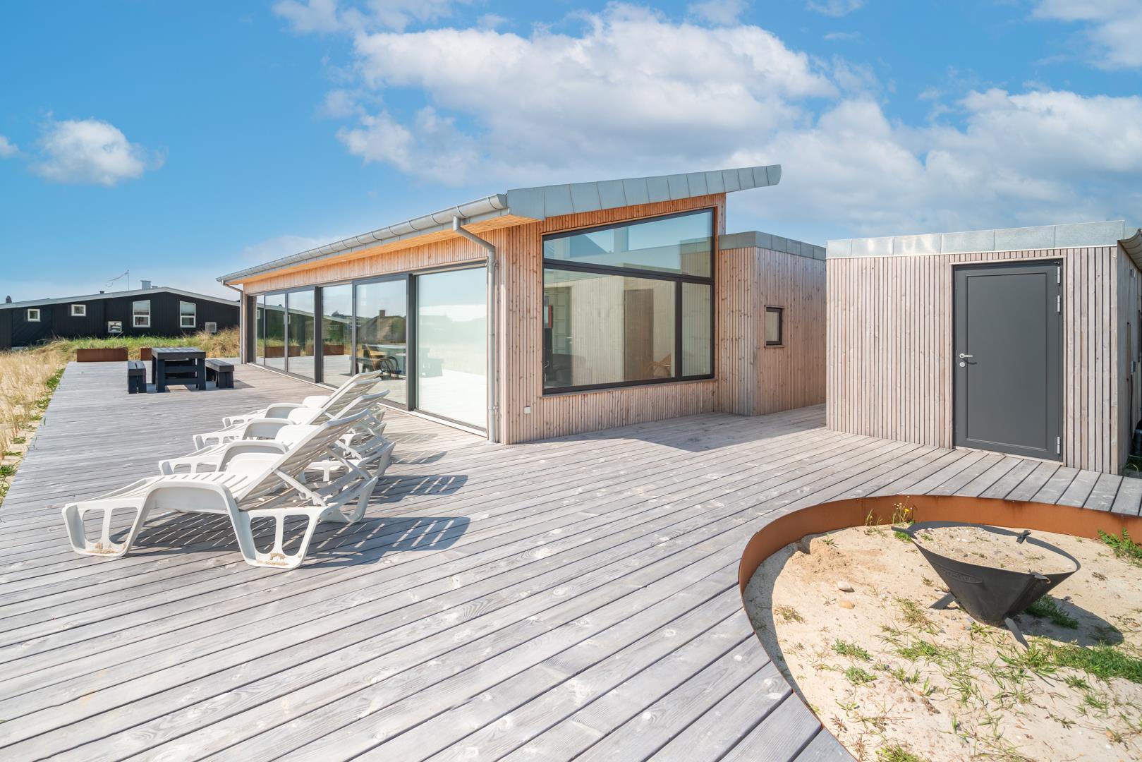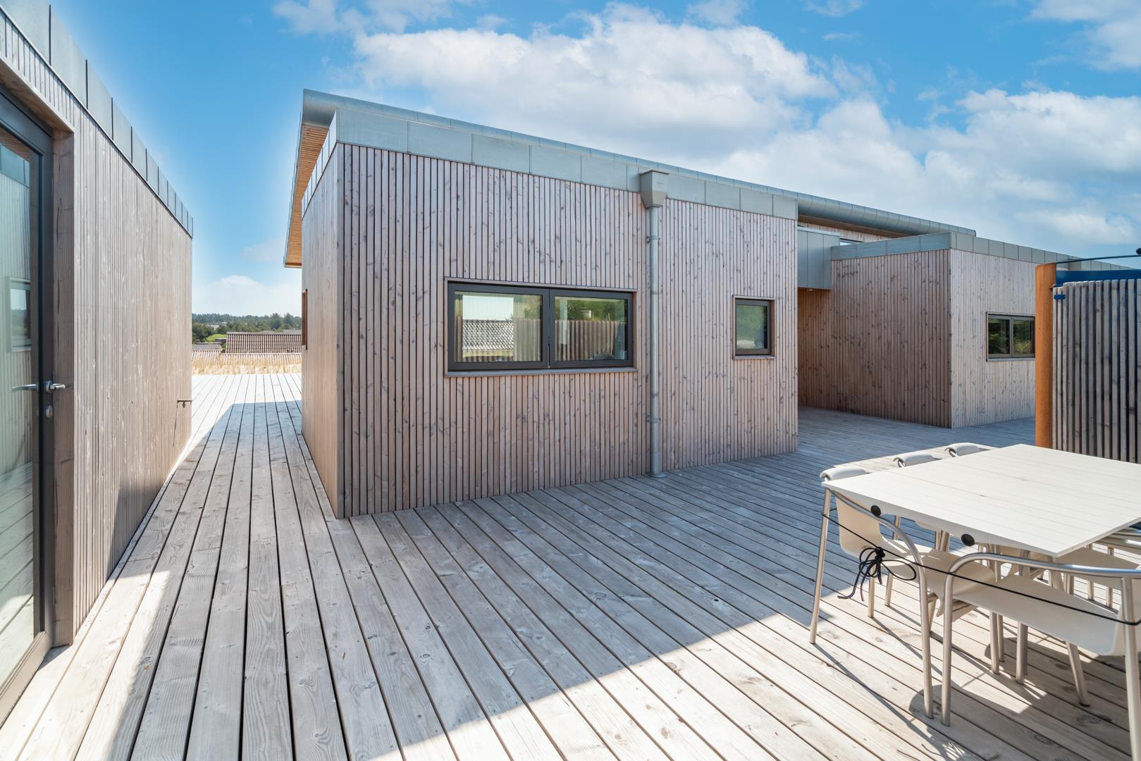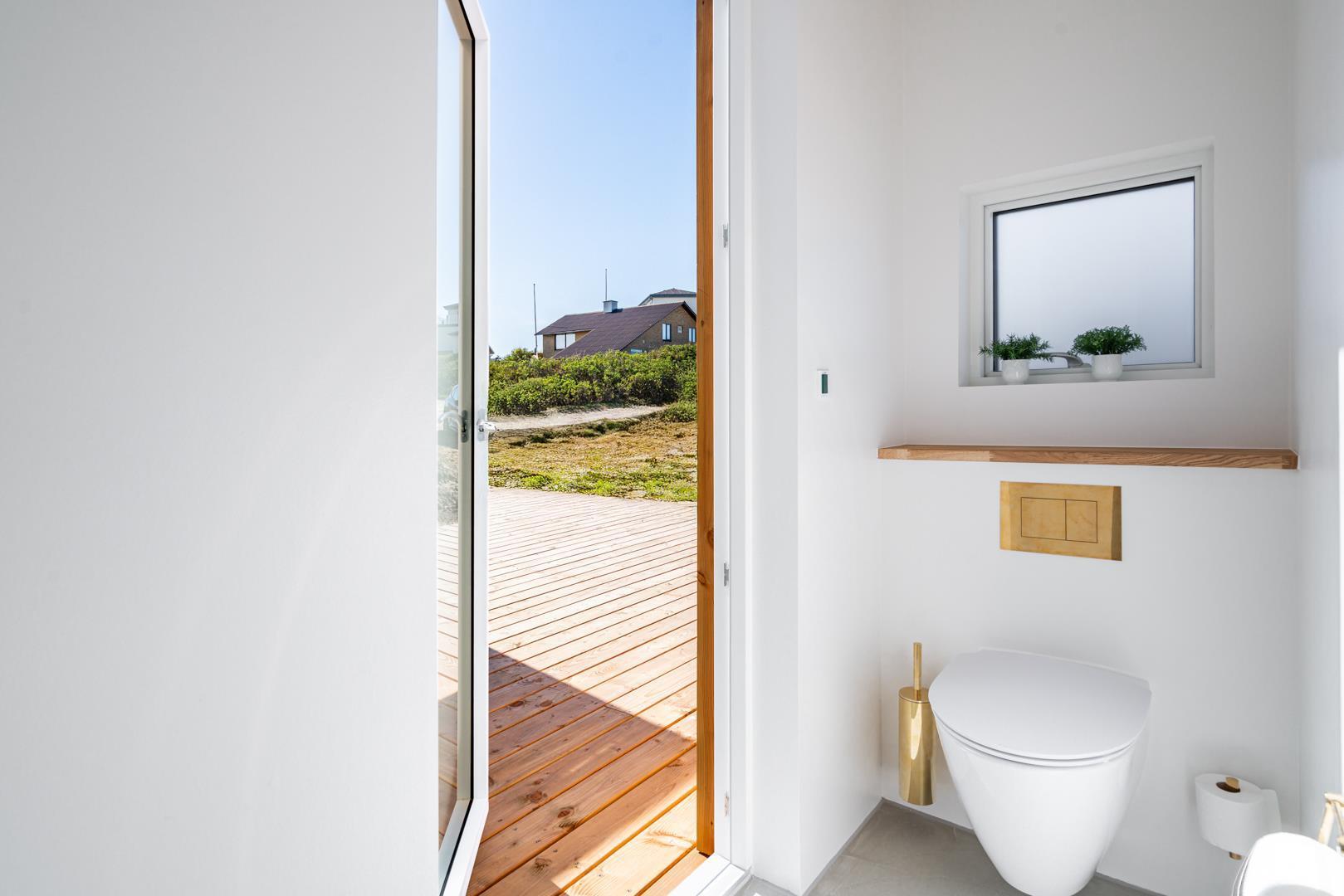 Fra ekstratoilettet er der direkte udgang til terrassen hvor du kan forkæle dine sanser med en afslappende stund i saunaen efter et forfriskende bad i udendørsbrusersen. Her kan du stå helt ugeneret og stadig under åben himmel. Udforsk de mange hyggelige terrasser omkring sommerhuset med fine havemøbler og liggestole – her kan du finde det perfekte spot til afslapning med en kop kaffe og en god bog.