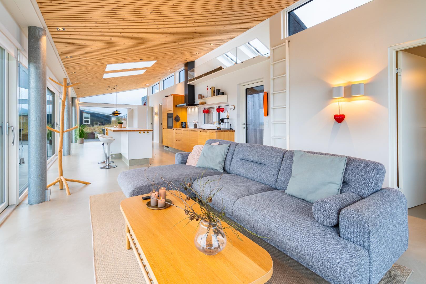 Træd ind i et moderne paradis på Falkevej 12, hvor luksus møder enestående panoramaudsigt over Henne Strand.