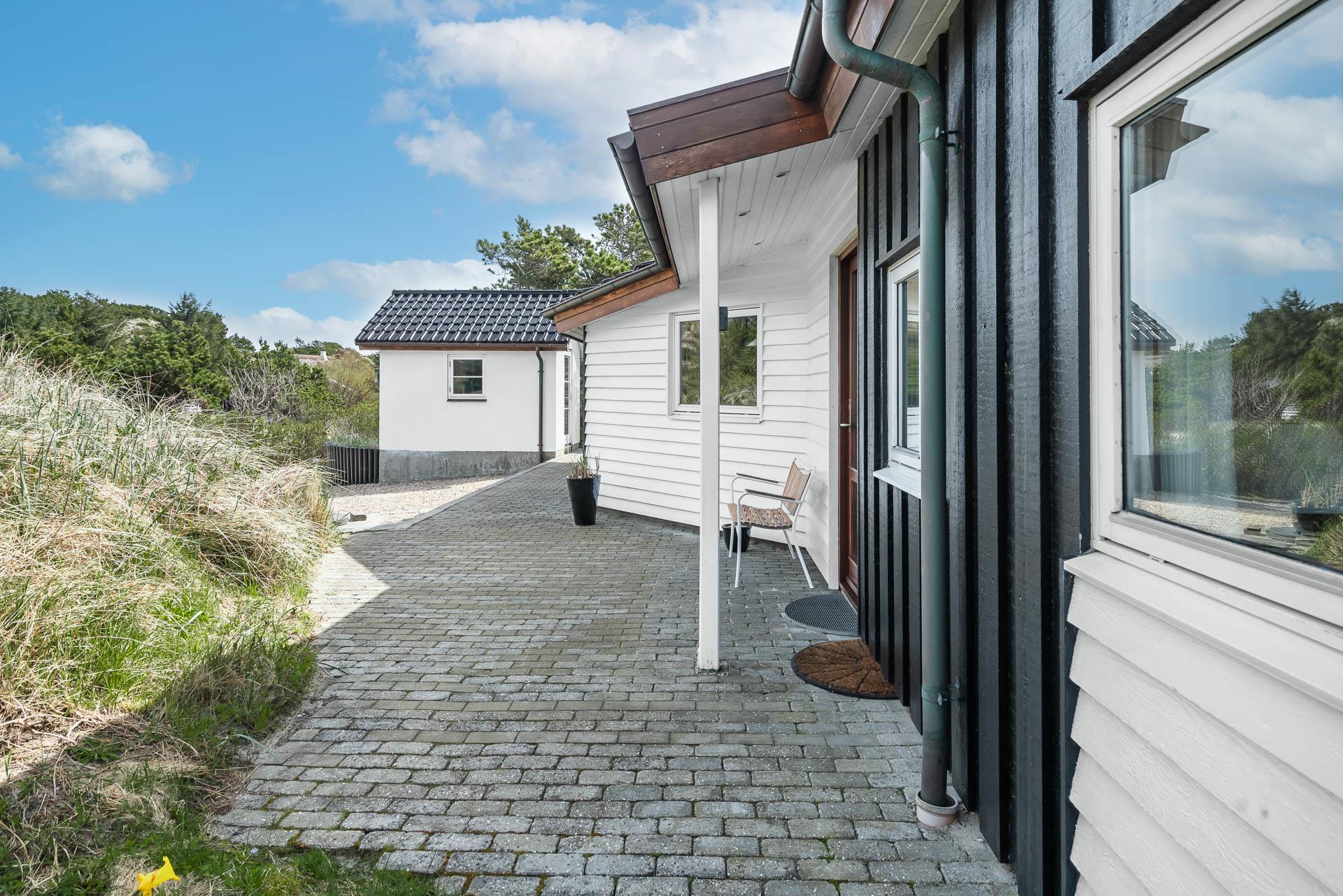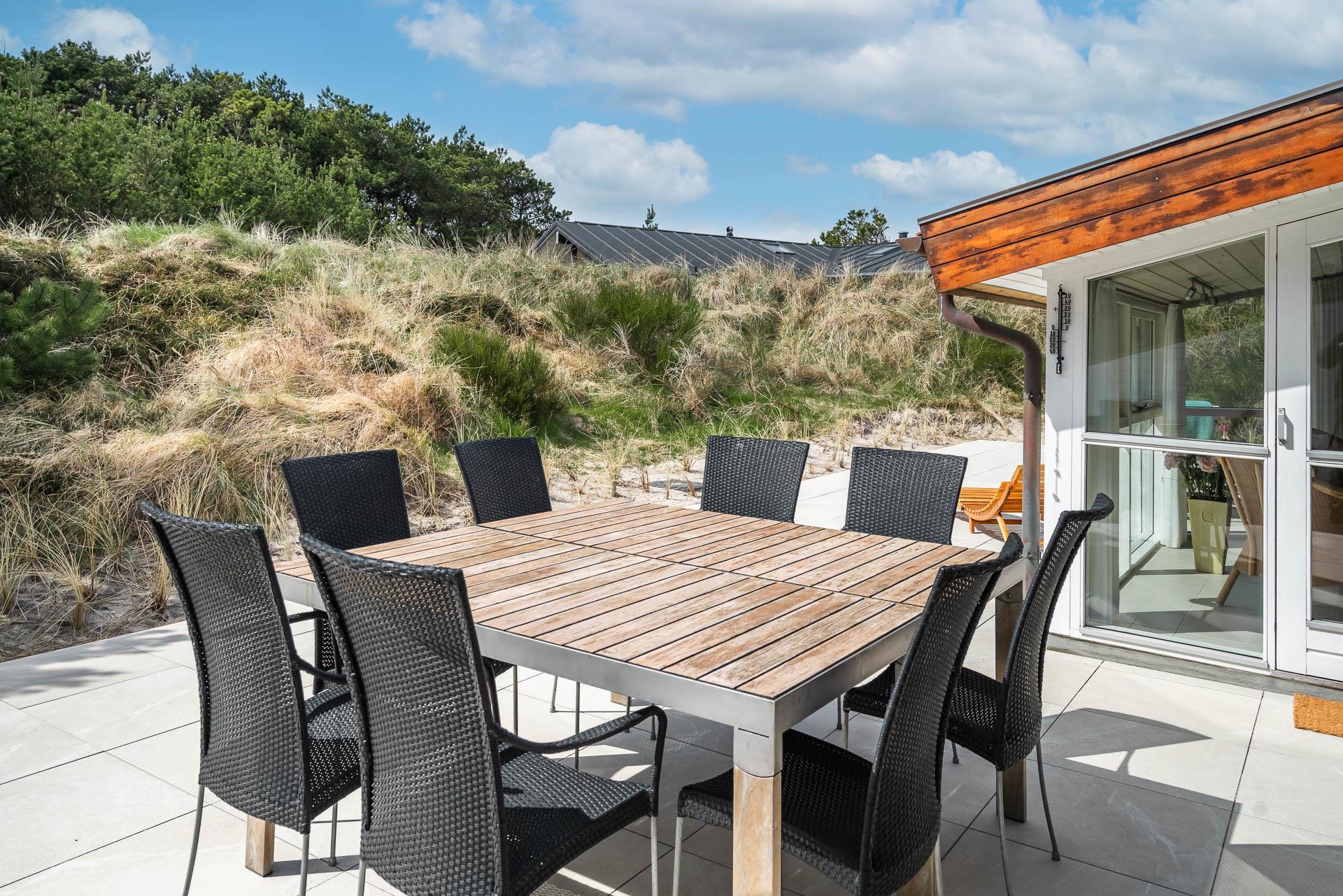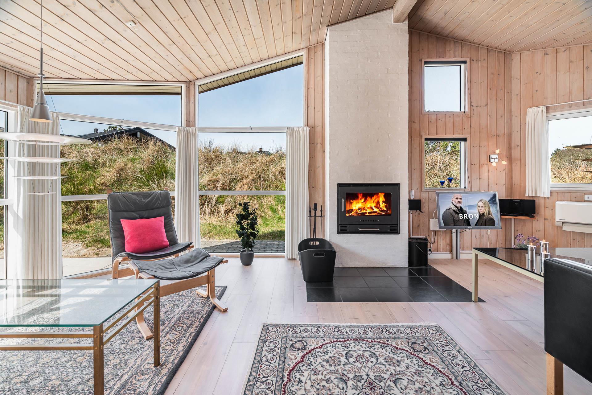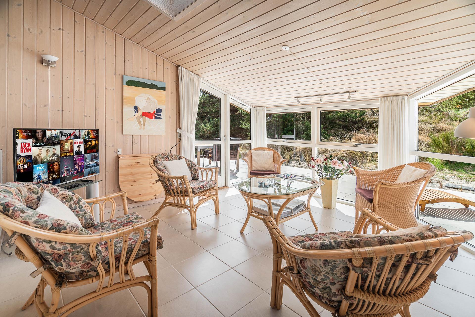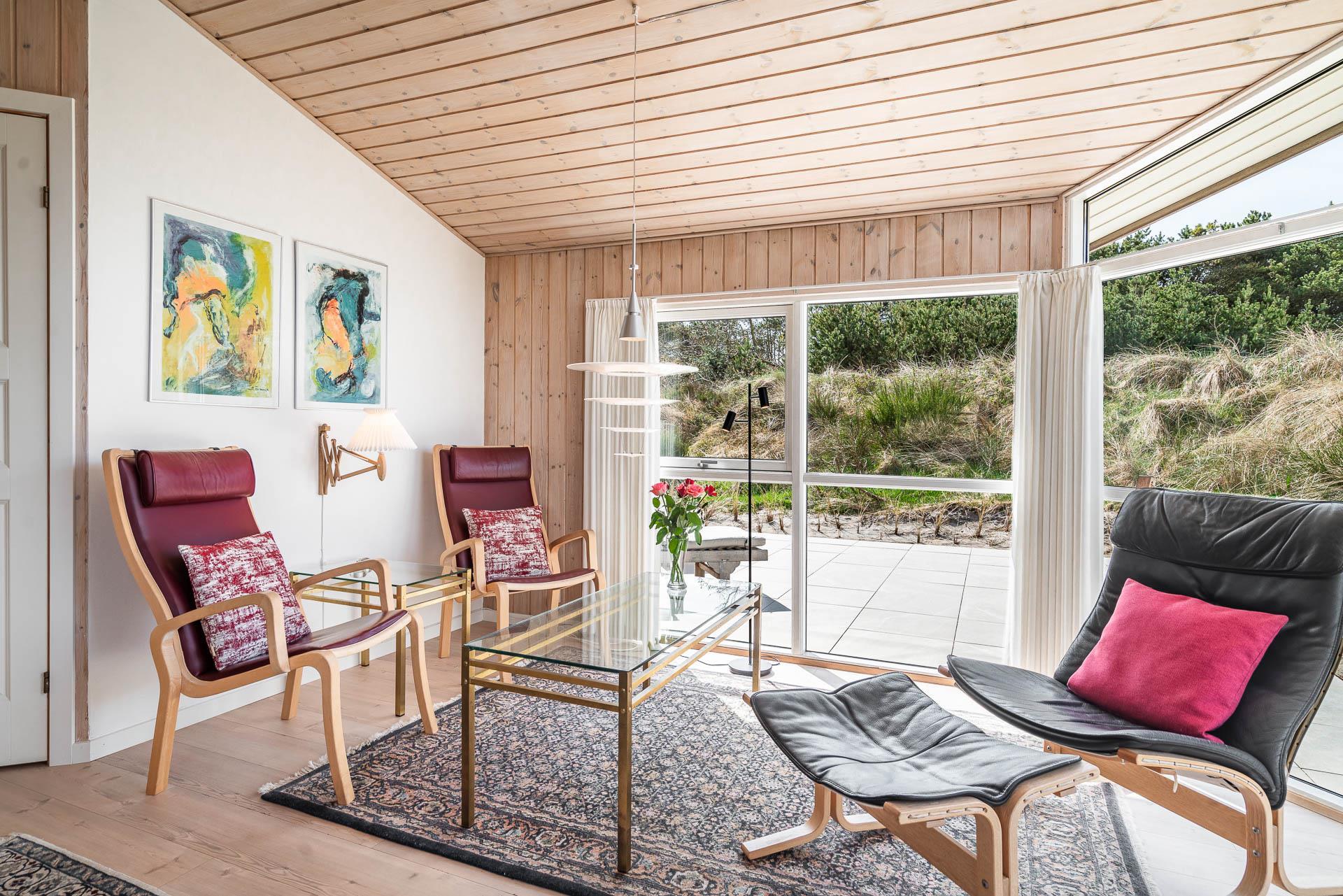 Med en unik beliggenhed og ikke langt fra strand og Henne Strand By ligger dette dejlige og meget vedligeholdte sommerhushus med en dejlig lyst udestue. Hyggelig smagfuldt møbleret pejsestue, hvor I kan slappe af og nyde den behagelige varme med udsigt til den kupere naturgrund. Flot lyst funktionelt køkken med kogeø. En halvmur fra køkken til havestuen adskiller spisestuen fra den hyggelige udestue. Omkring feriehuset er der anlagt flere dejlige terrasser, hvor der altid er mulighed for at finde læ og dermed nyde døgnets lyse timer. Godt redskabsrum til cykler, golfsæt og lignende hvor disse kan opbevares. Gratis golf på Henne samt Outrup Golfklub.