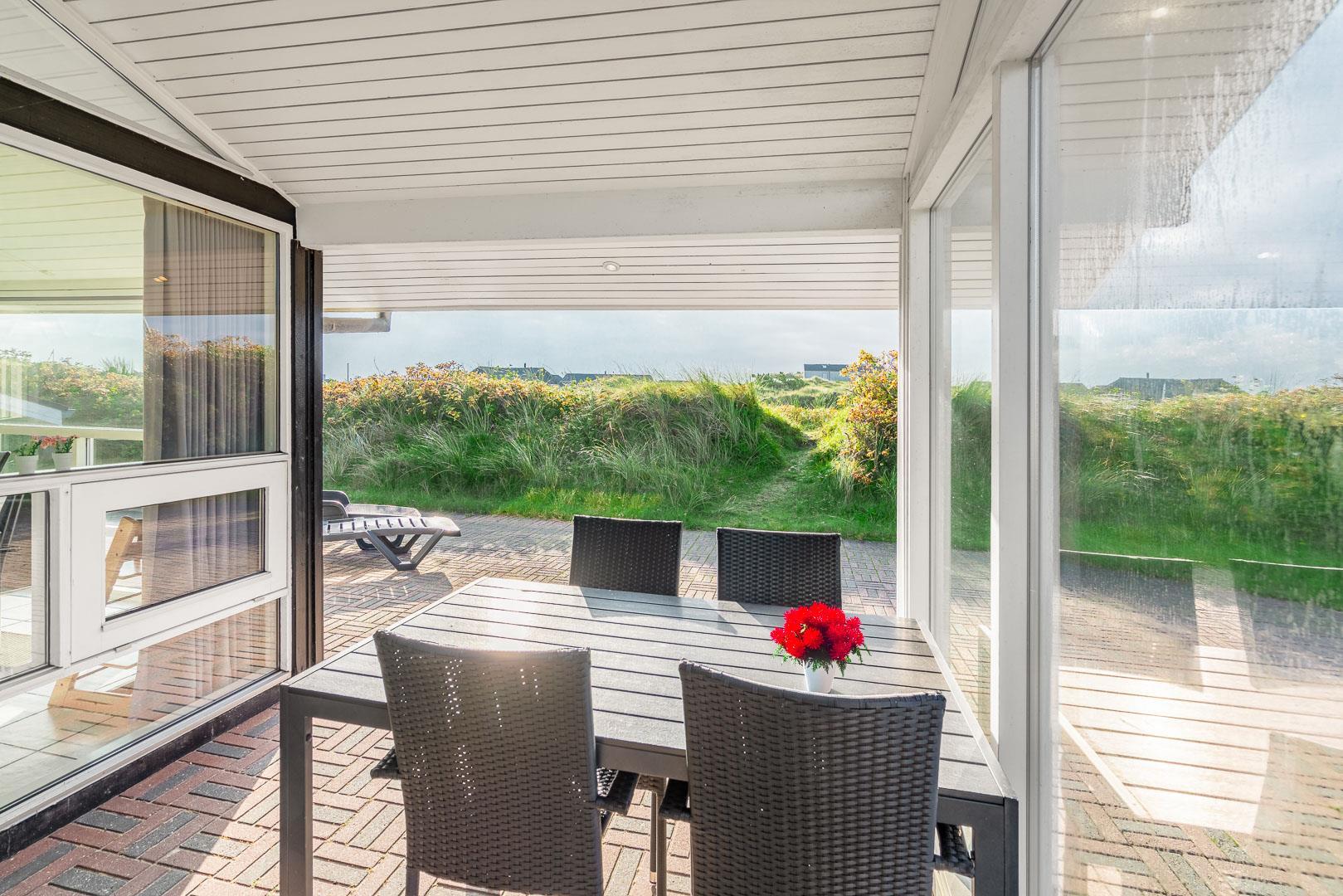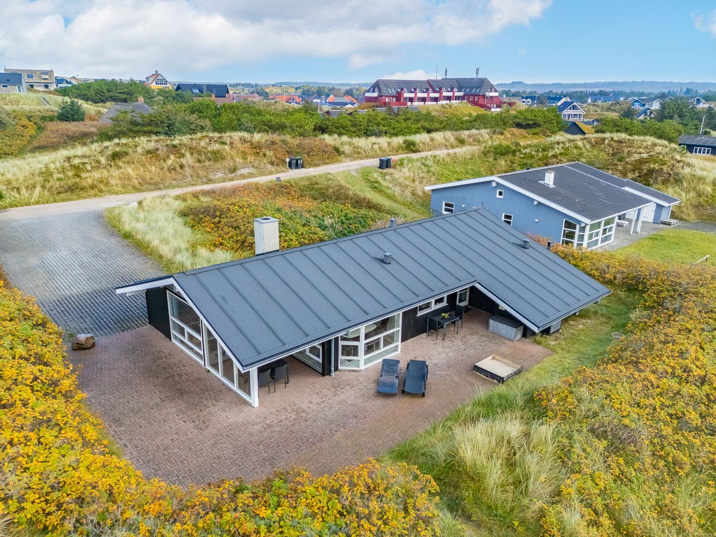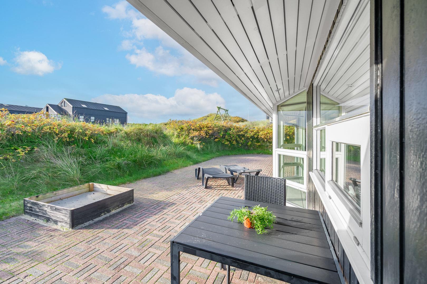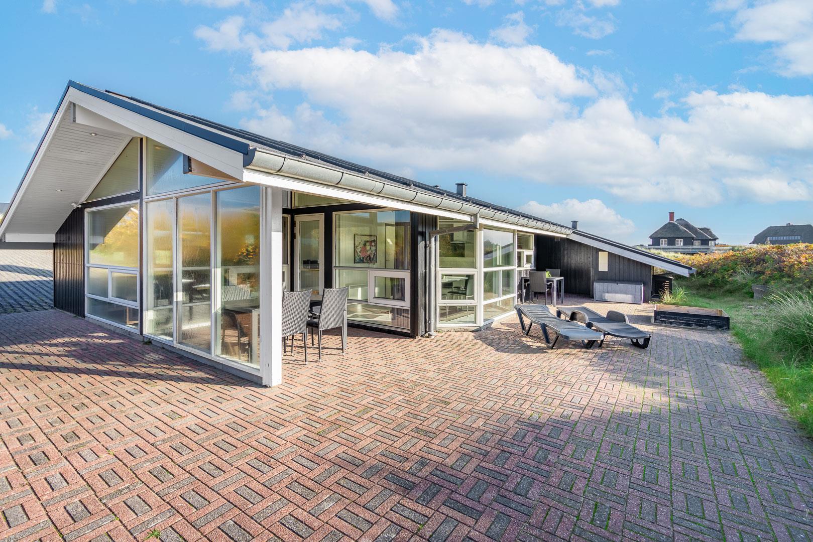 Velholdt feriehus nær Vesterhavet med spa, sauna og stor overdækket terrasse på en ugeneret klitgrund.