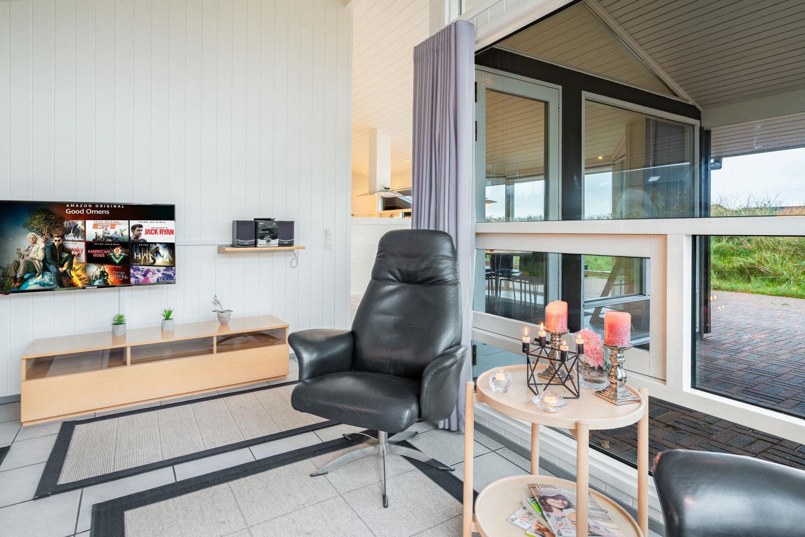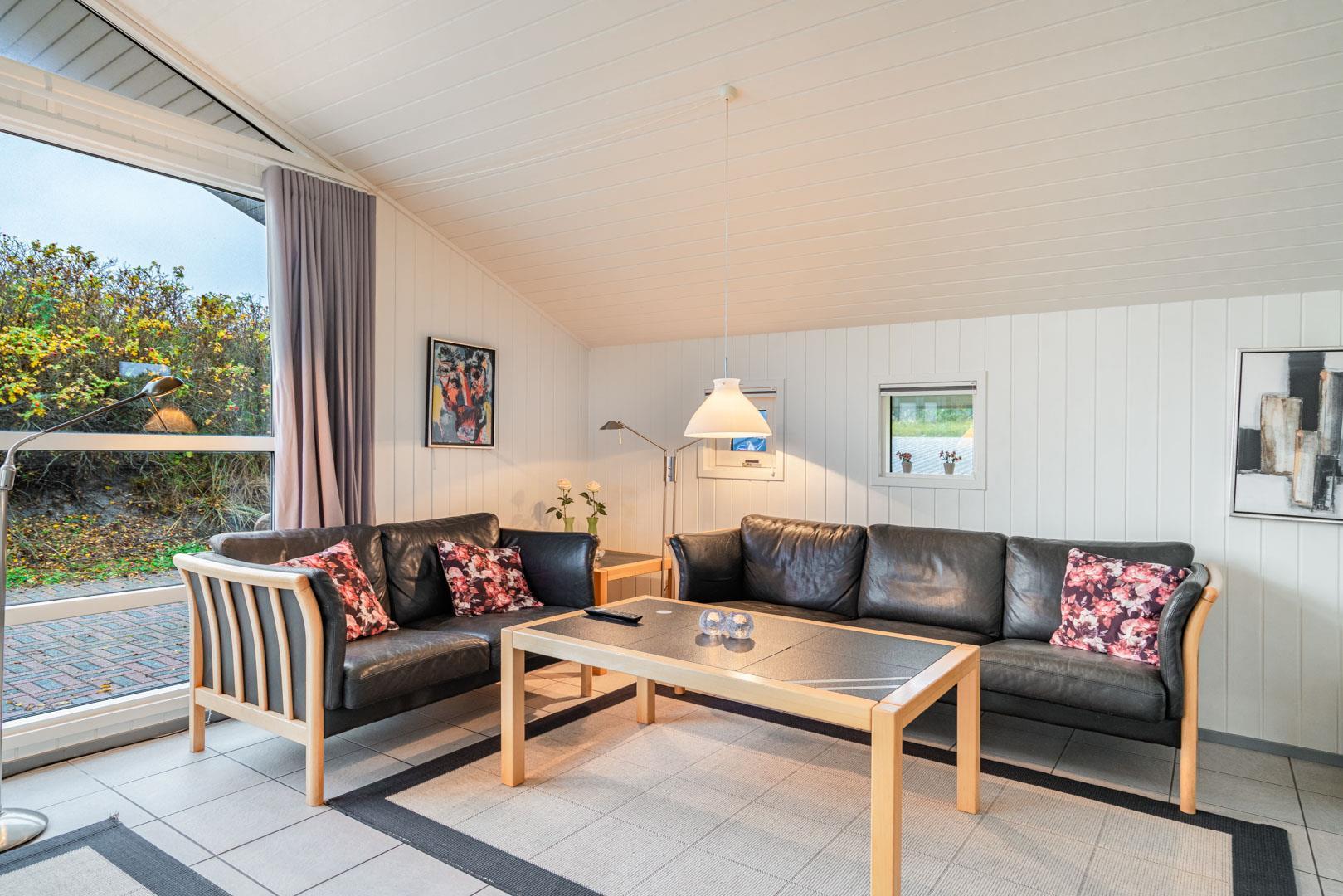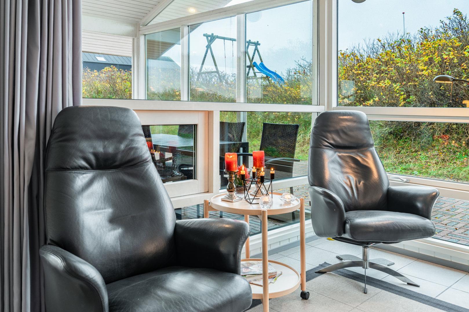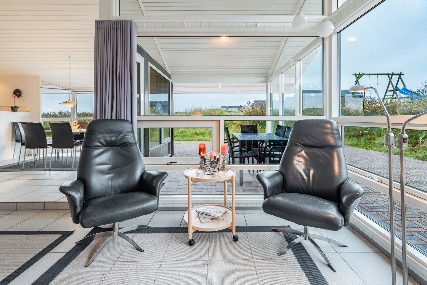 Velholdt feriehus nær Vesterhavet med spa, sauna og stor overdækket terrasse på en ugeneret klitgrund.