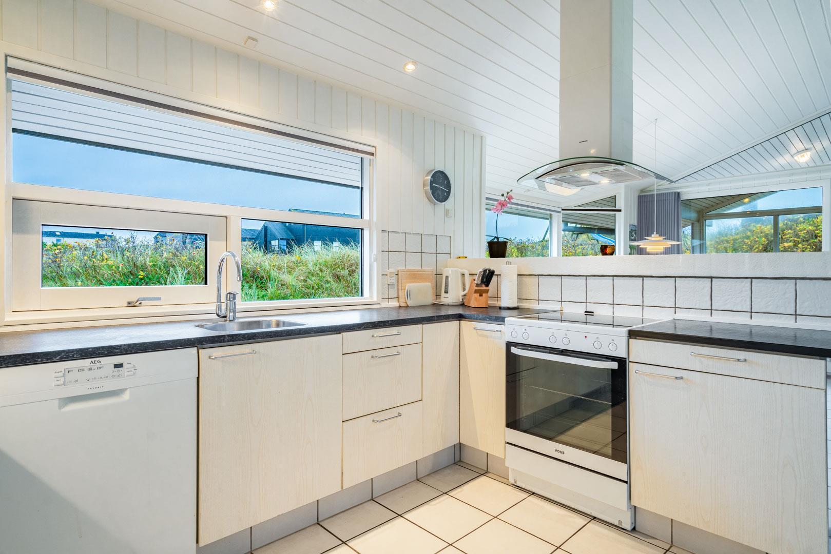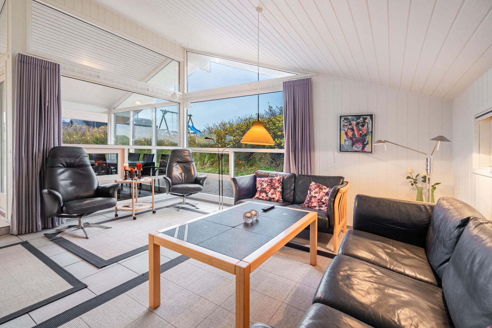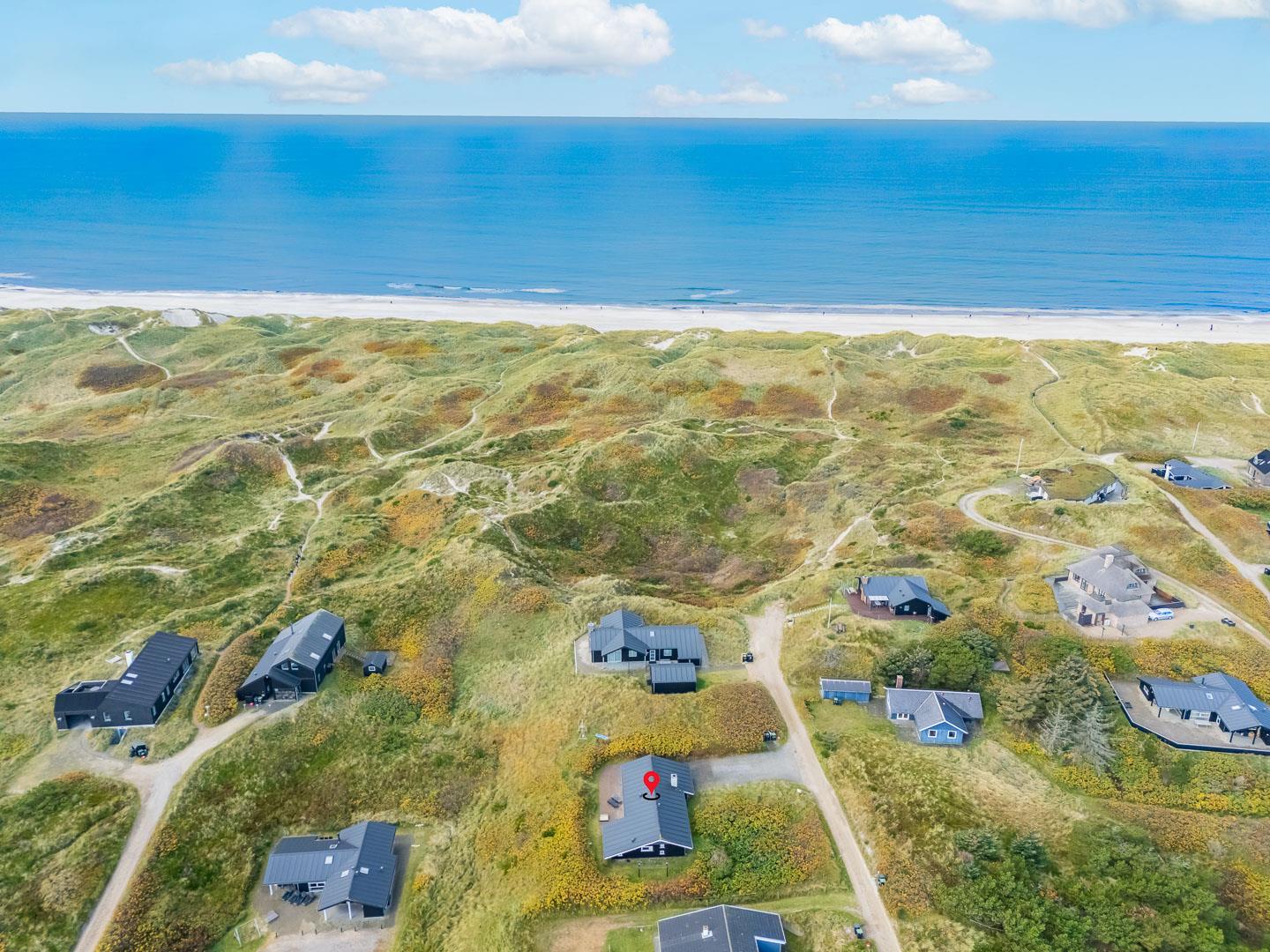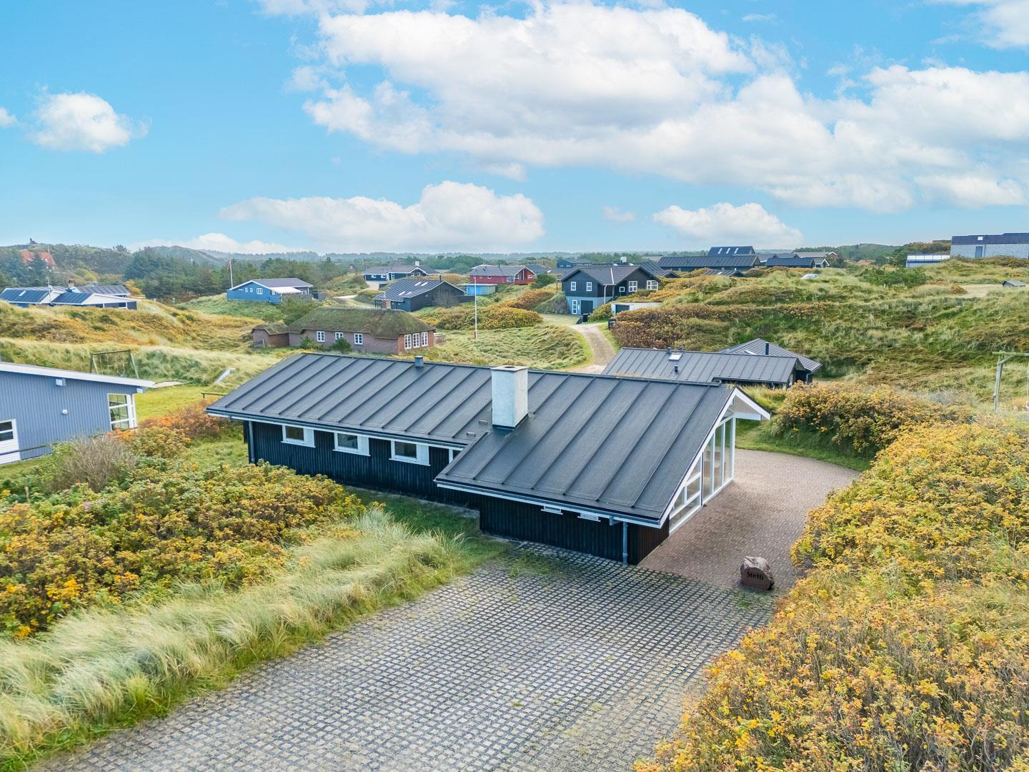 Velholdt og velindrettet feriehus beliggende på en pragtfuld og ugeneret klitgrund få hundrede meter fra Vesterhavet. Veludstyret køkken som er kombineret med spisestuen, her fra går man ned i pænt møbleret stue. Fra spisestuen er der udgang til stor delvis overdækket terrasse. Pænt badeværelse med spa og sauna. Huset har 3 gode soveværelser alle med dobbeltsenge.