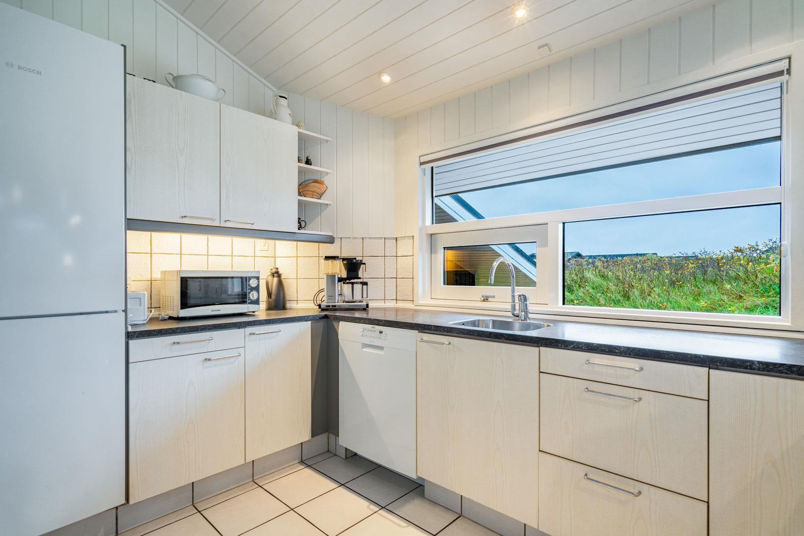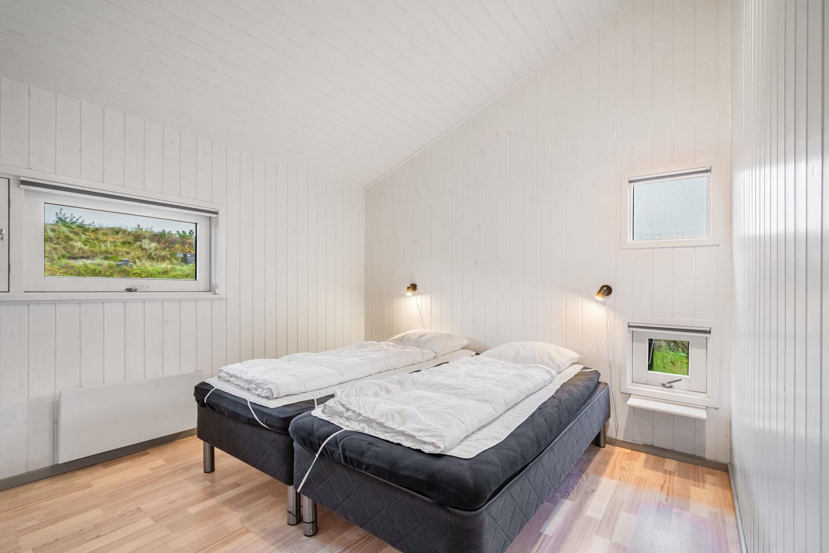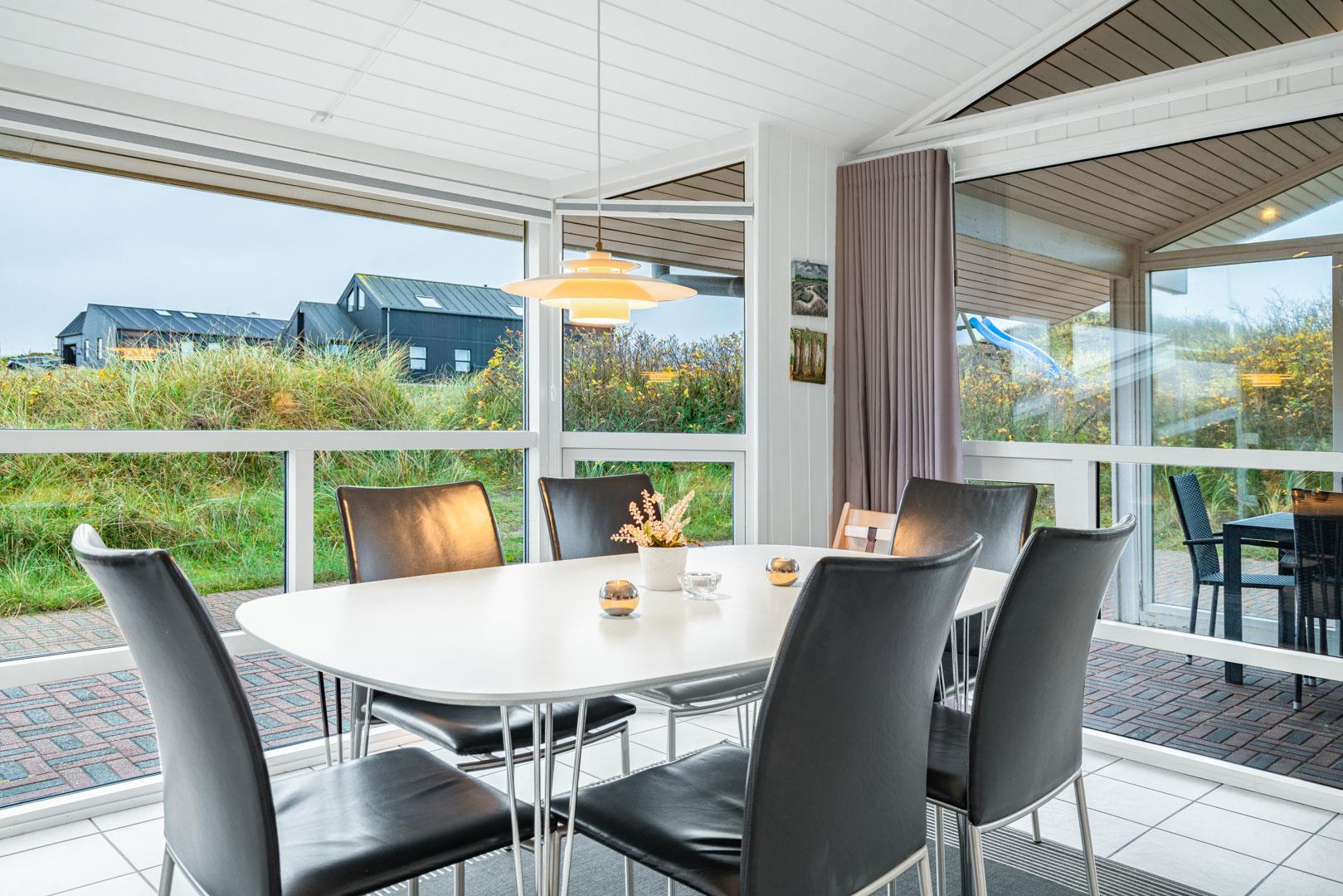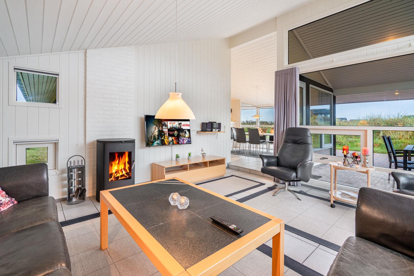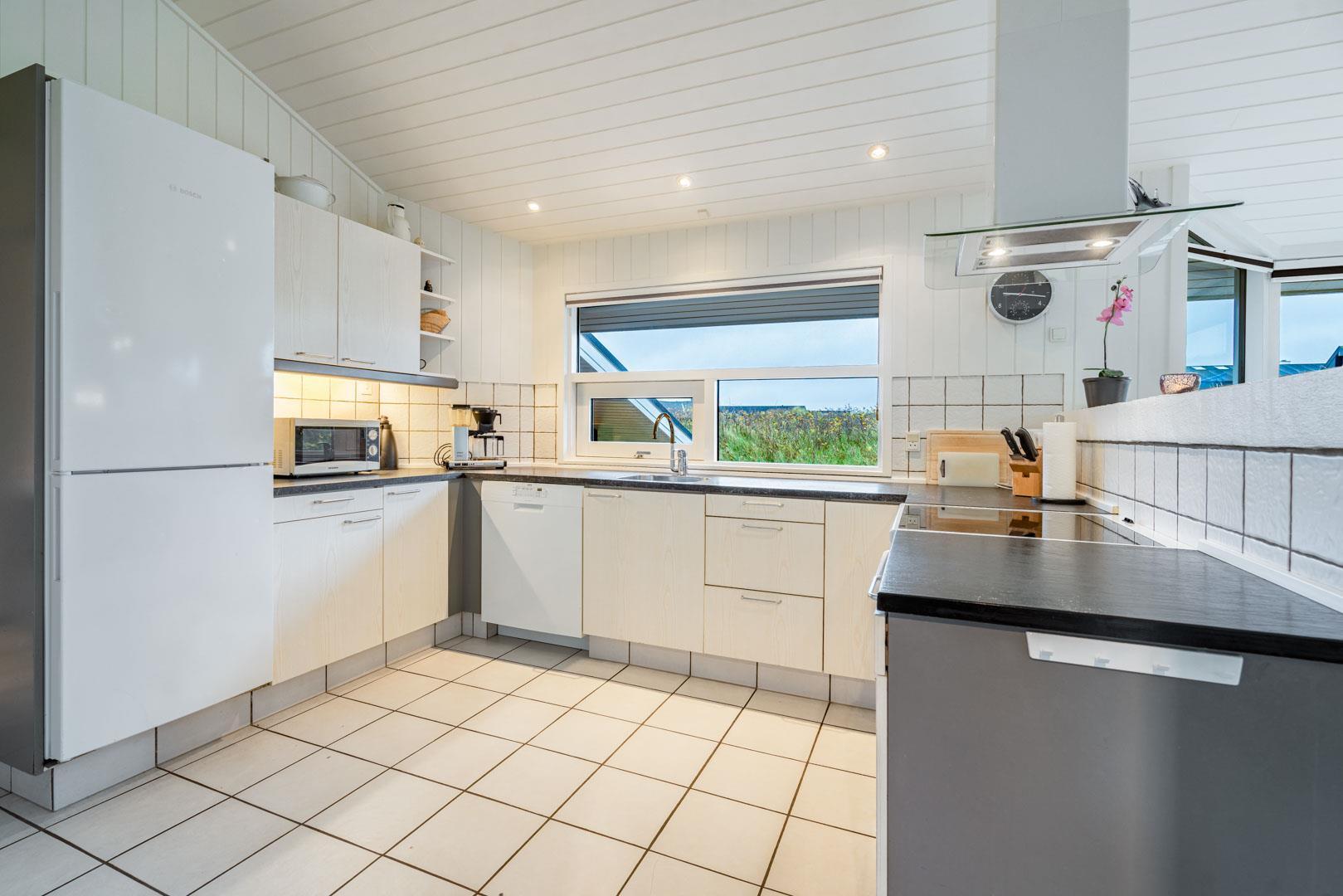Velholdt og velindrettet feriehus beliggende på en pragtfuld og ugeneret klitgrund få hundrede meter fra Vesterhavet. Veludstyret køkken som er kombineret med spisestuen, her fra går man ned i pænt møbleret stue. Fra spisestuen er der udgang til stor delvis overdækket terrasse. Pænt badeværelse med spa og sauna. Huset har 3 gode soveværelser alle med dobbeltsenge.