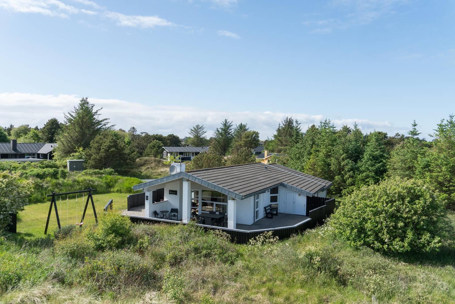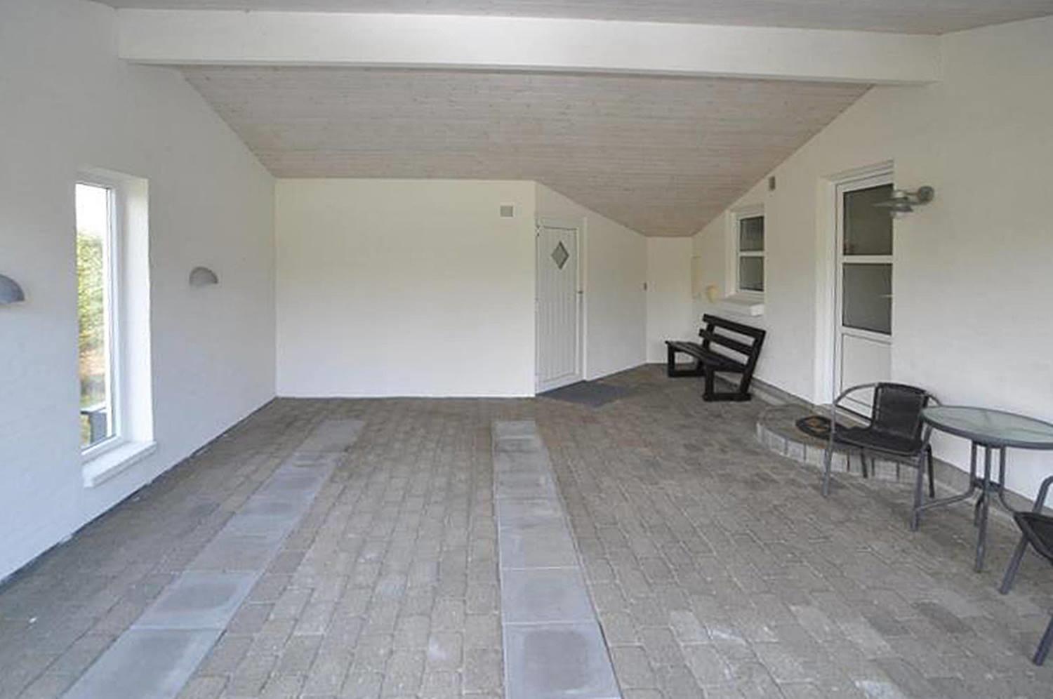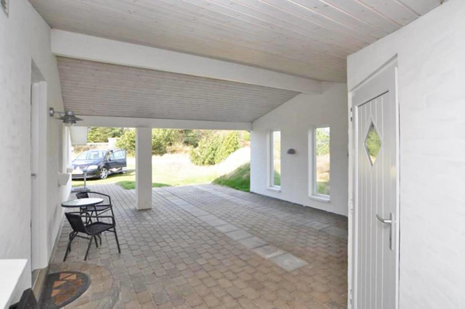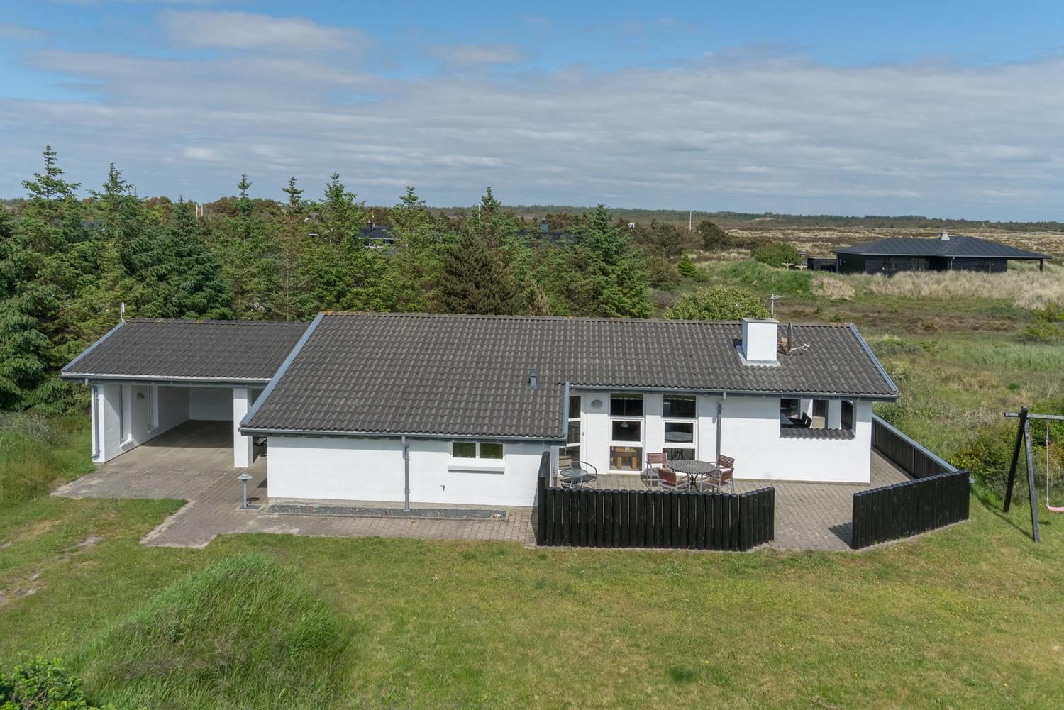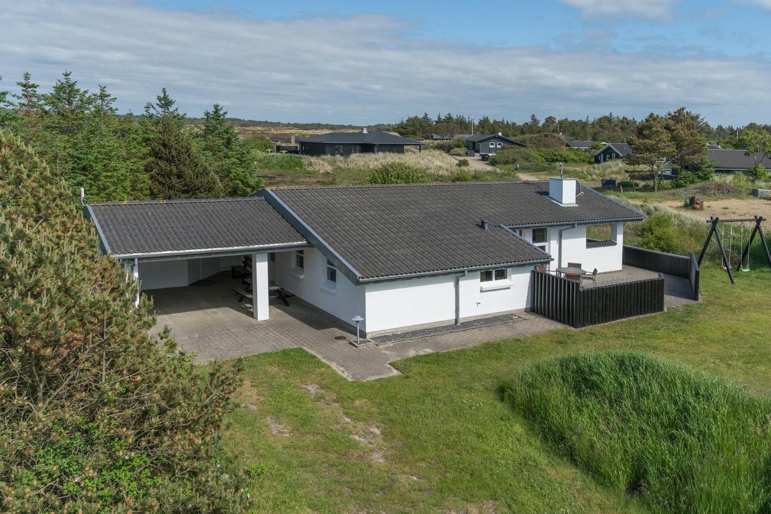 Også udendørs byder sommerhuset på skønne rammer for ferien. Den overdækkede terrasse giver mulighed for at nyde morgenmaden i læ, grille eller slappe af sidst på dagen. Børnene kan lege på gyngen og i sandkassen, og bilen parkeres sikkert i carporten.