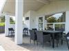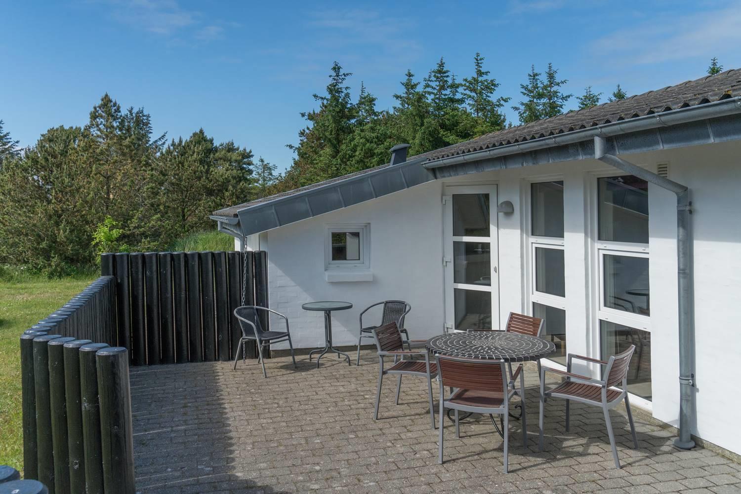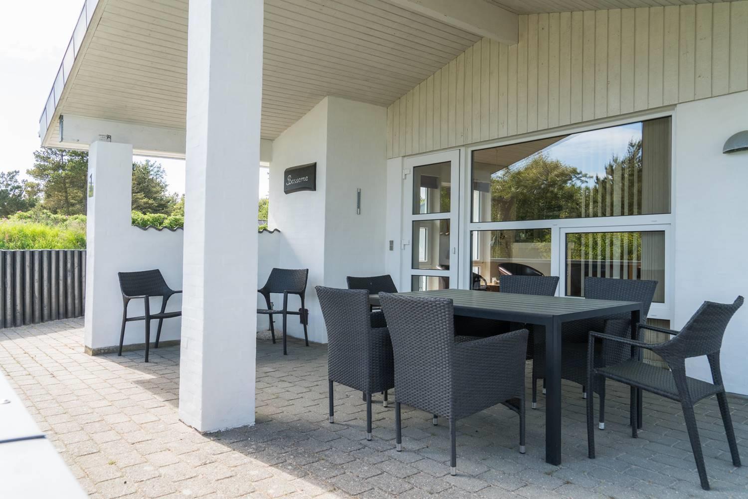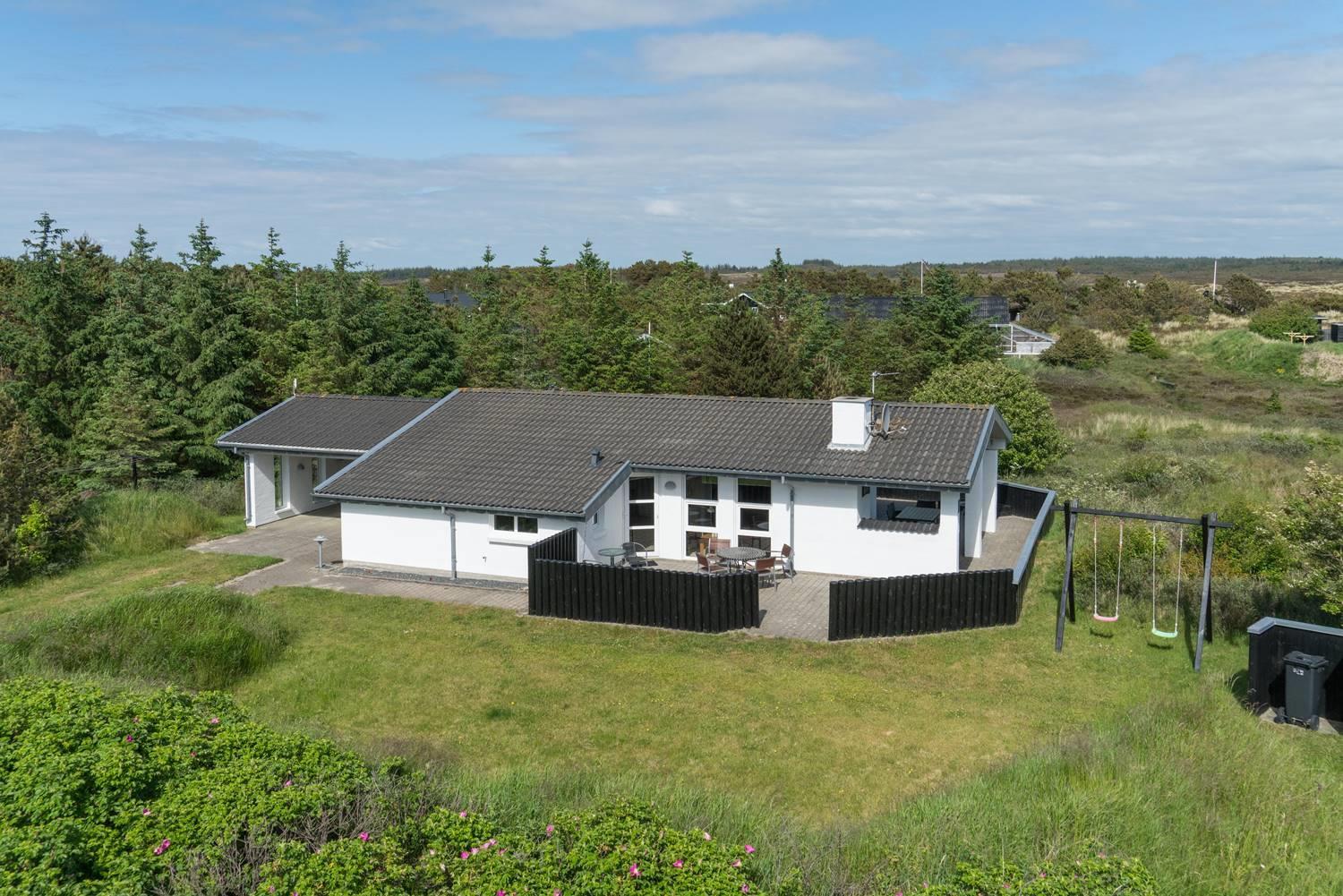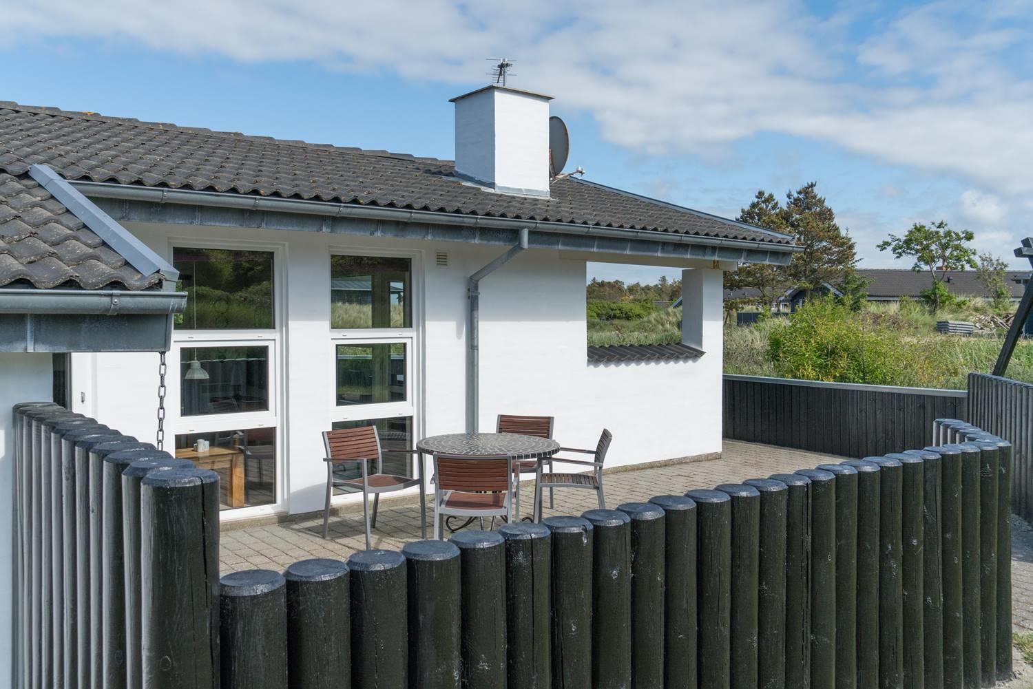 Også udendørs byder sommerhuset på skønne rammer for ferien. Den overdækkede terrasse giver mulighed for at nyde morgenmaden i læ, grille eller slappe af sidst på dagen. Børnene kan lege på gyngen og i sandkassen, og bilen parkeres sikkert i carporten.