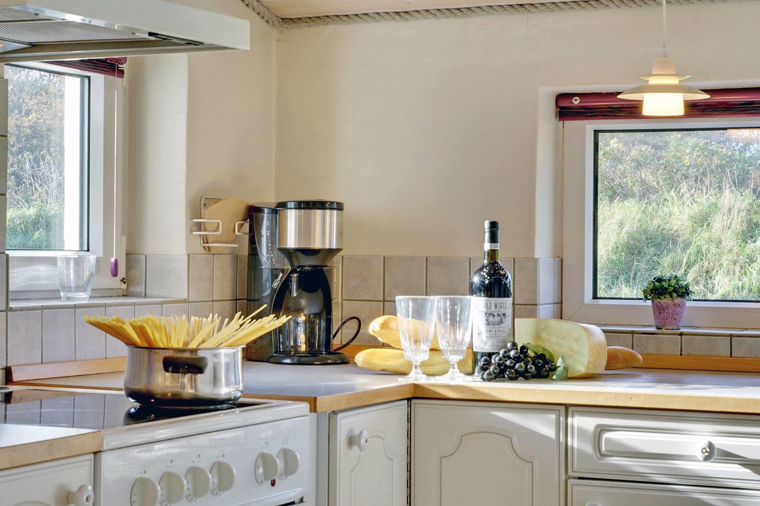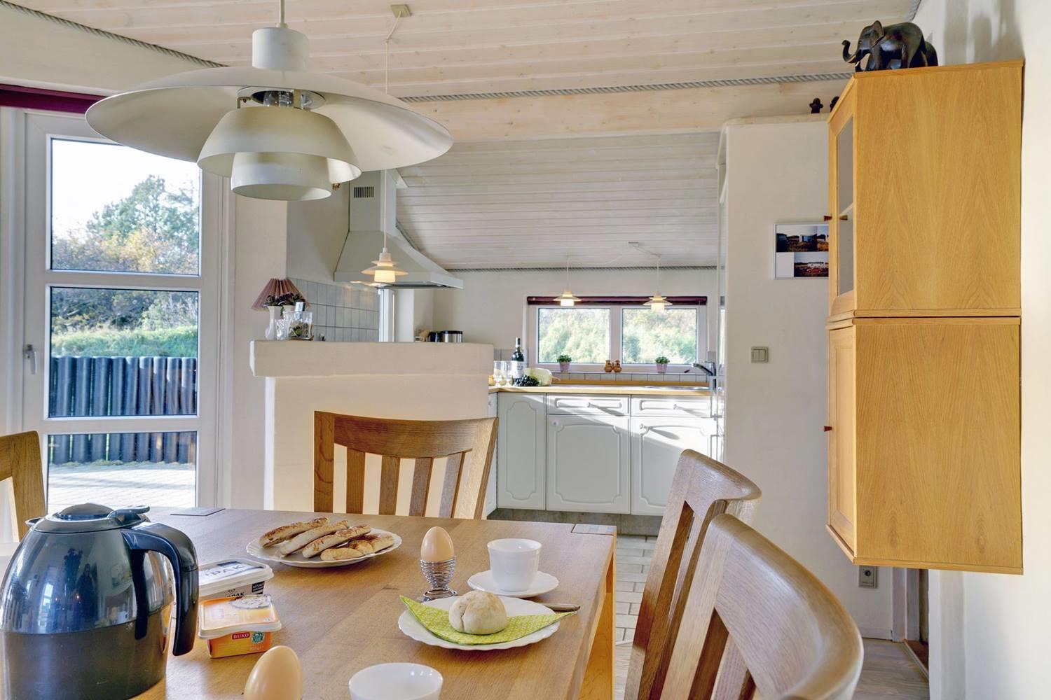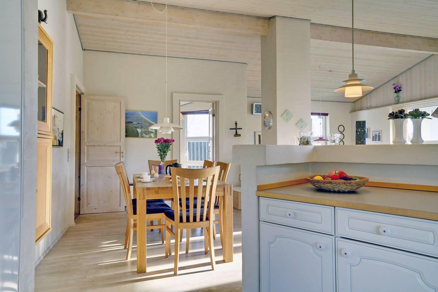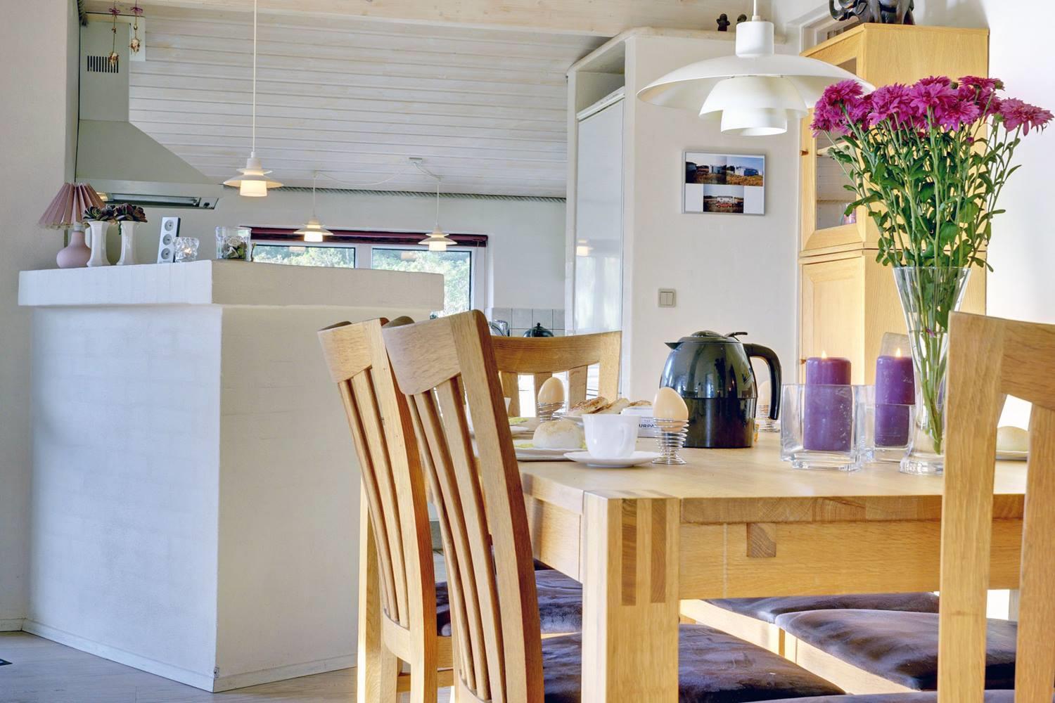 Det moderne køkken er veludstyret med opvaskemaskine, moderne hvidevarer og gulvvarme, så madlavningen bliver en fornøjelse – også i ferien. Her kan I samles om måltiderne og nyde friske råvarer fra Henne Strand.