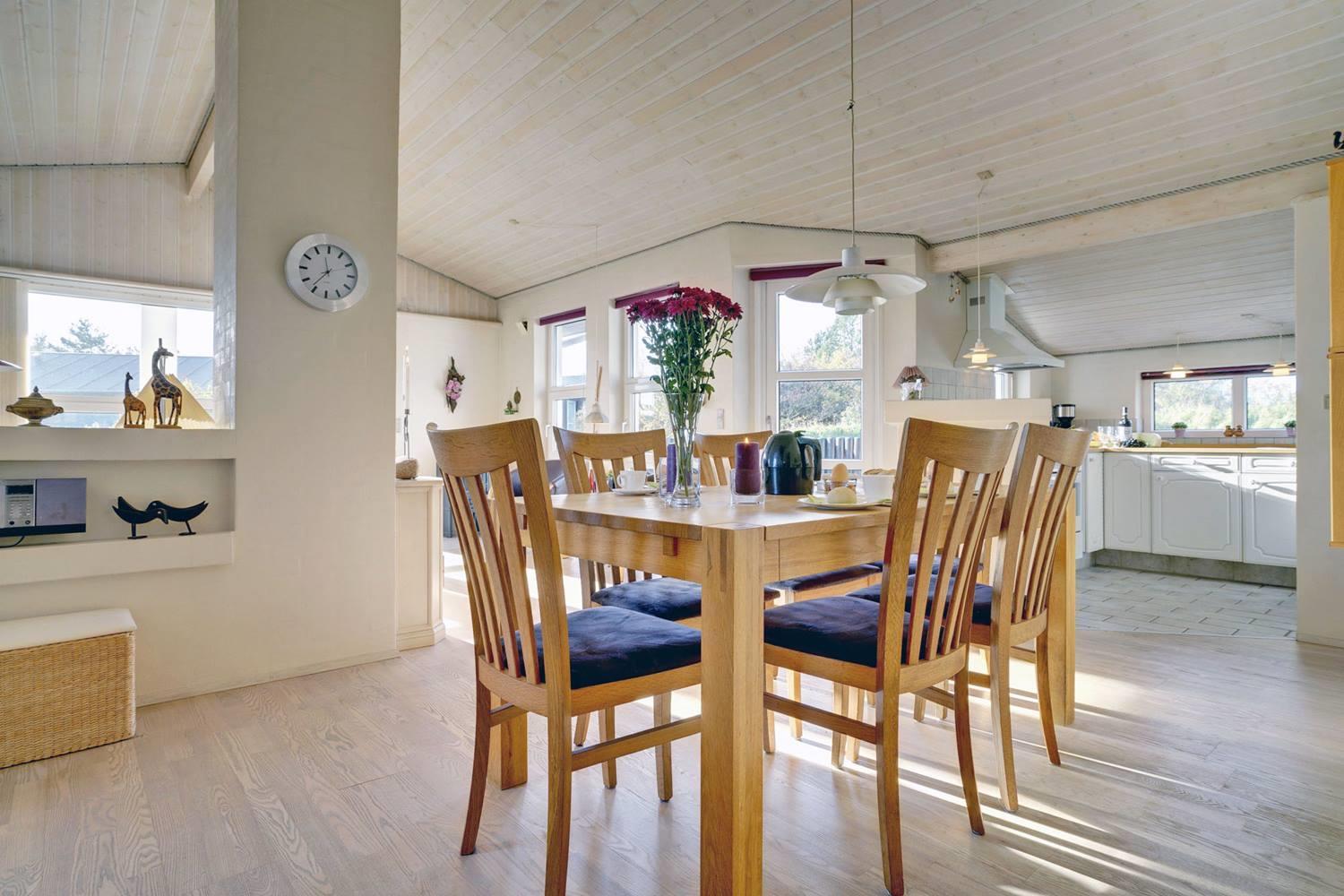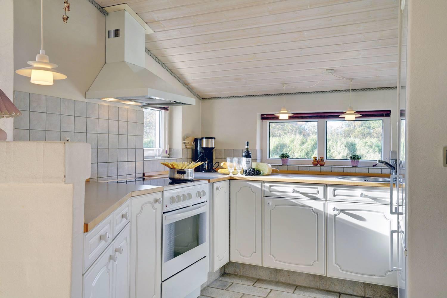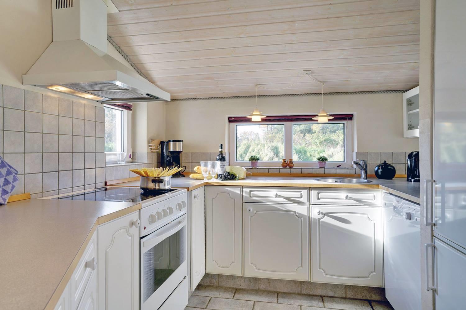 Det moderne køkken er veludstyret med opvaskemaskine, moderne hvidevarer og gulvvarme, så madlavningen bliver en fornøjelse – også i ferien. Her kan I samles om måltiderne og nyde friske råvarer fra Henne Strand.
