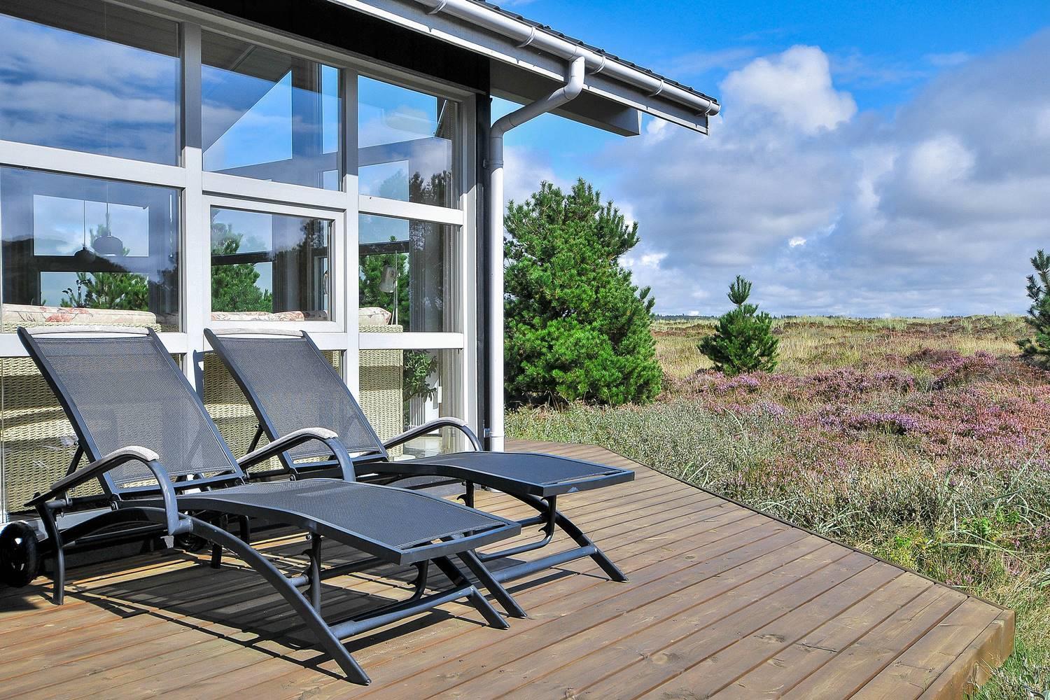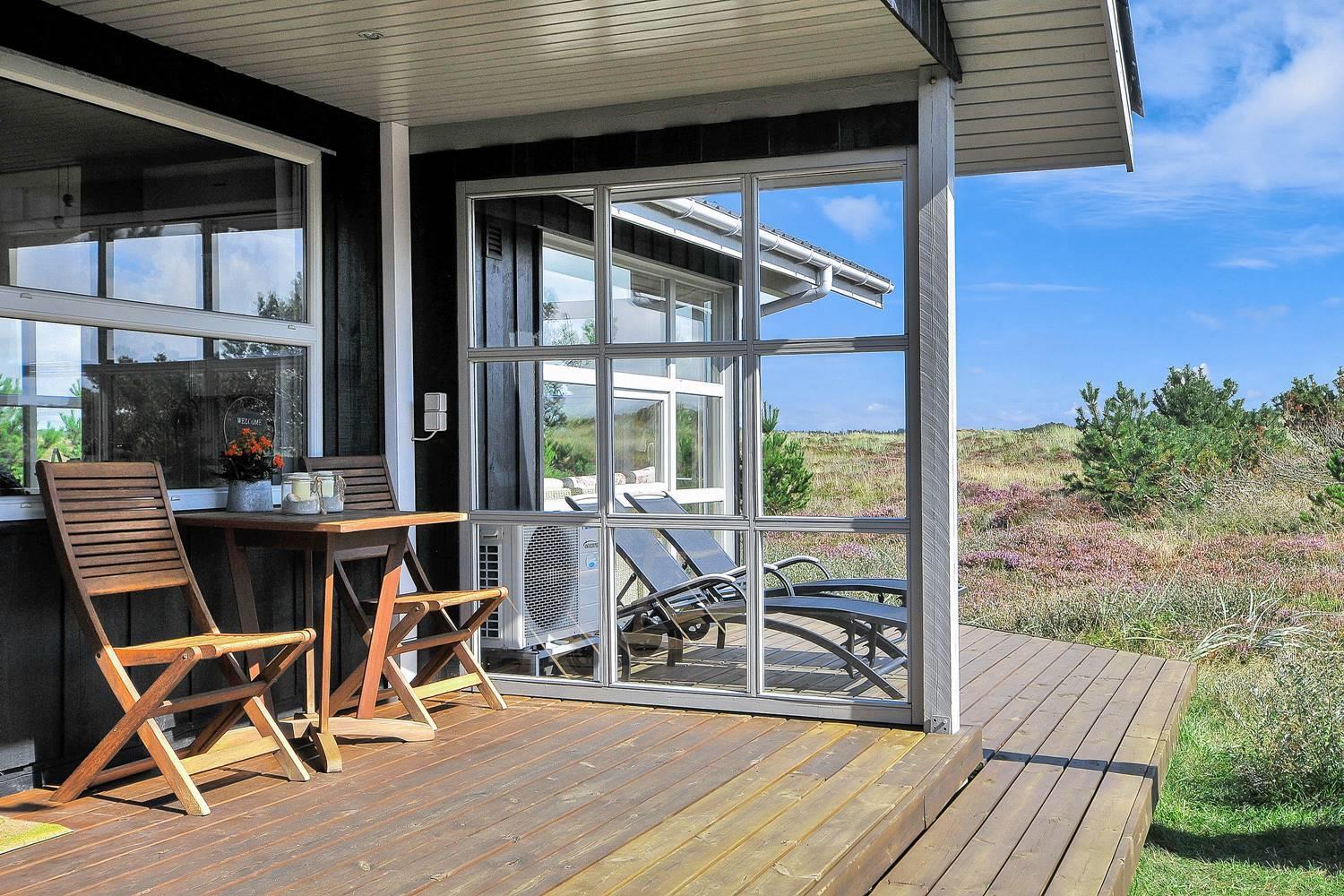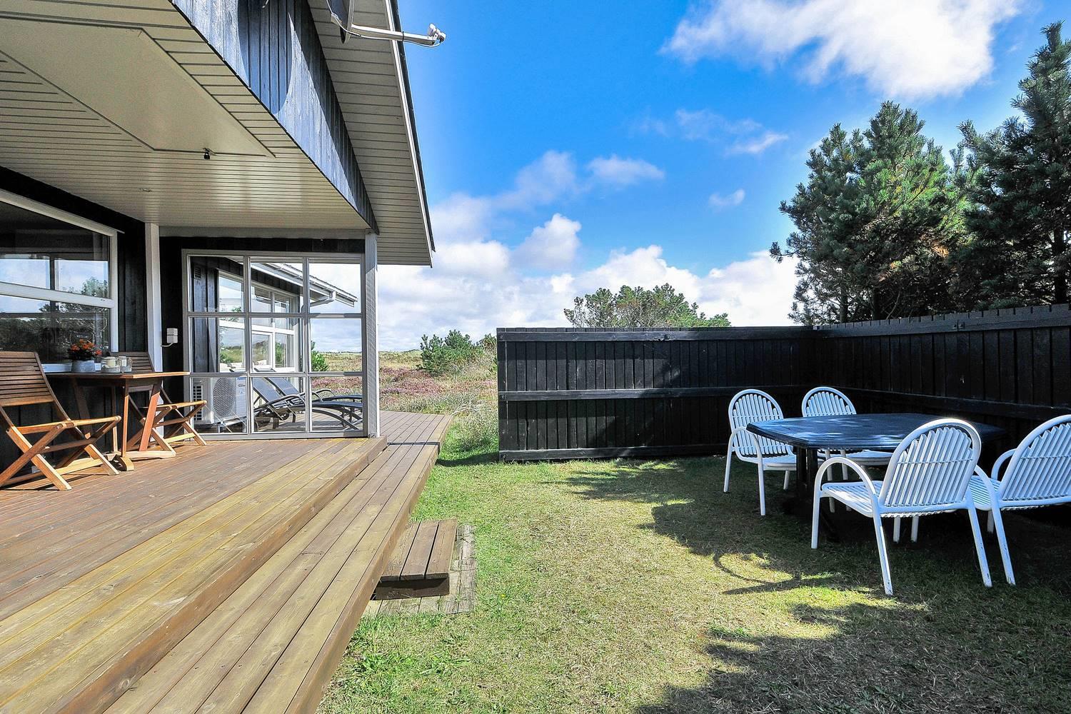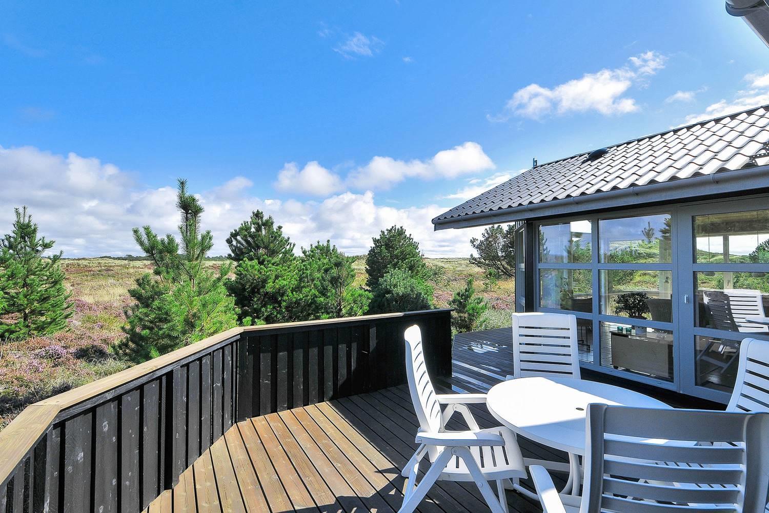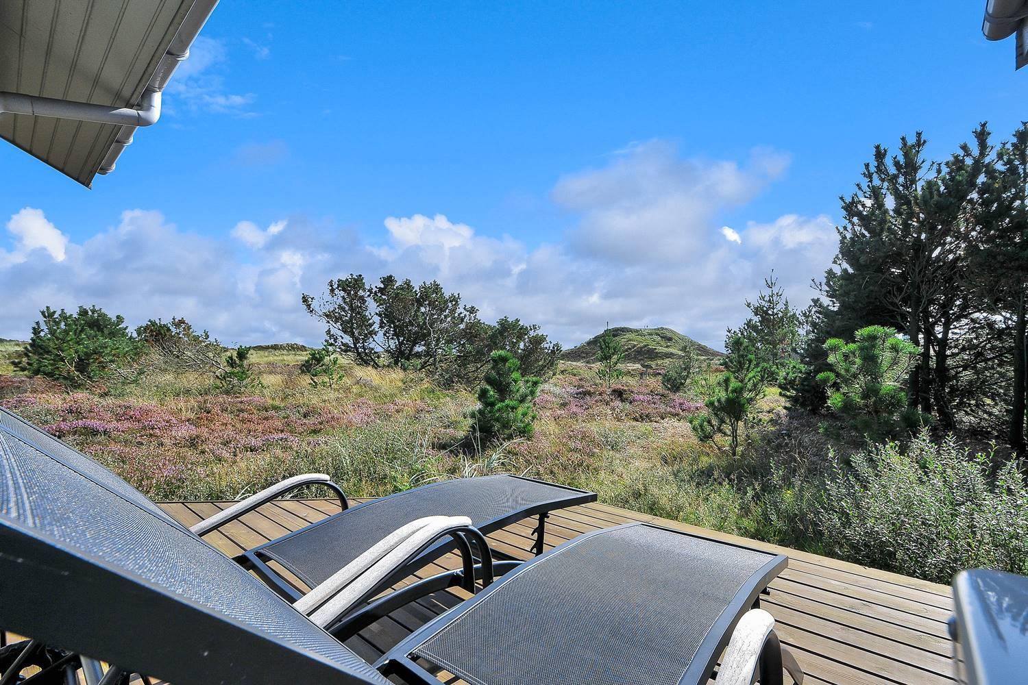 Feriehus på klitgrund med ugenert terrasse og udsigt til fredet hedeområde nær Henne Strand.